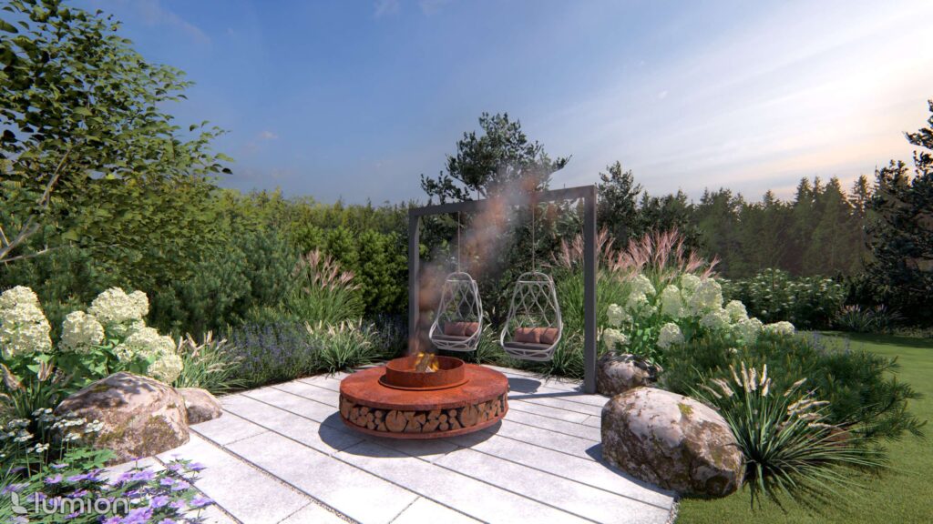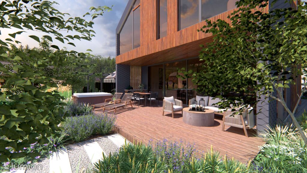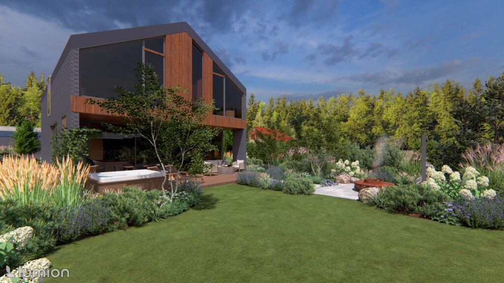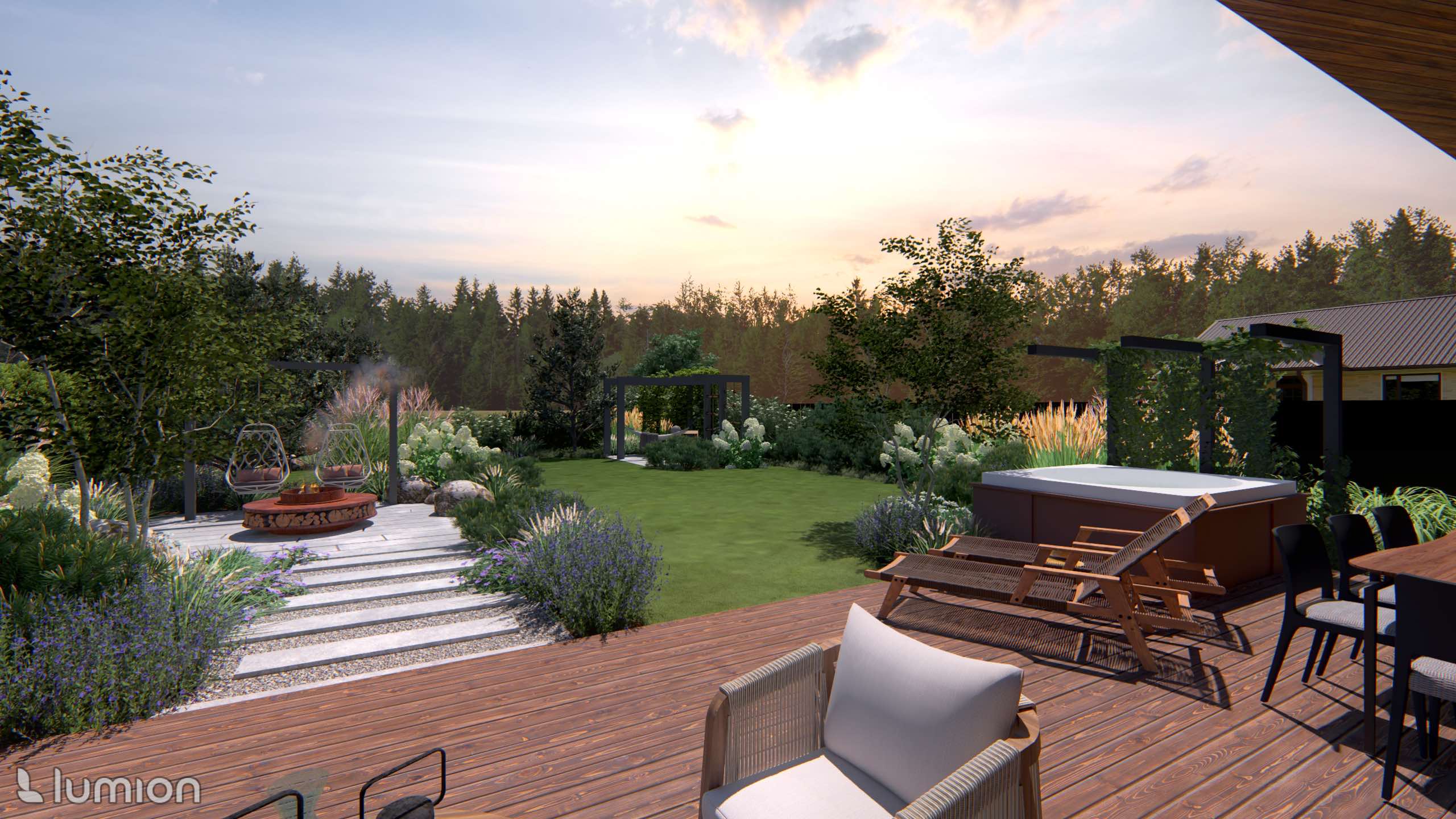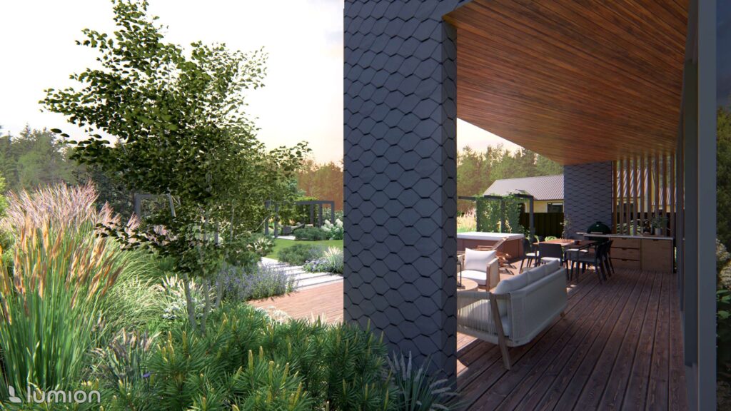 Most daily life takes place in the backyard. Here, cozy and private leisure areas were planned: a hot tub, a fire pit, a pergola for quiet time, and a small fitness area.