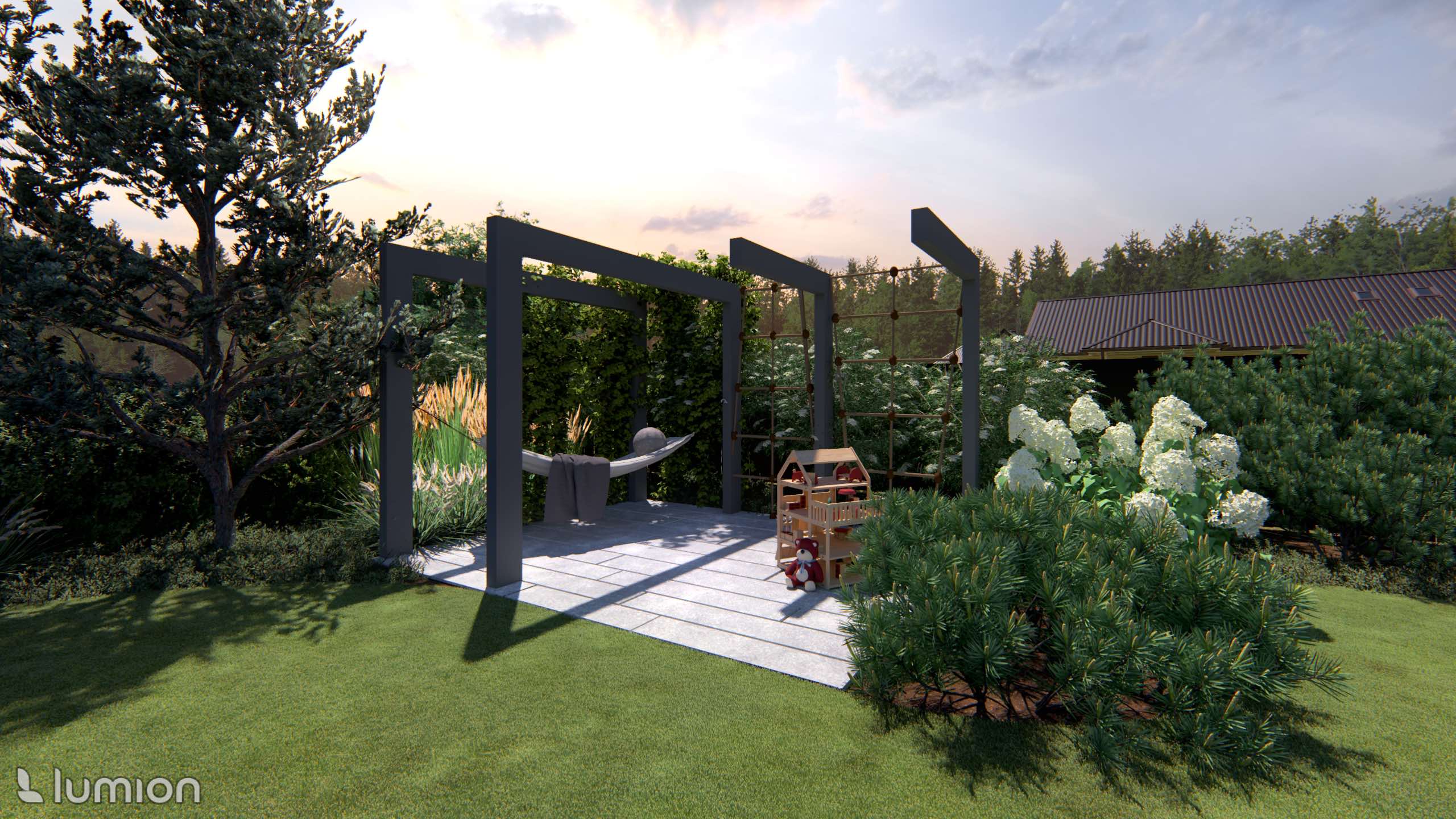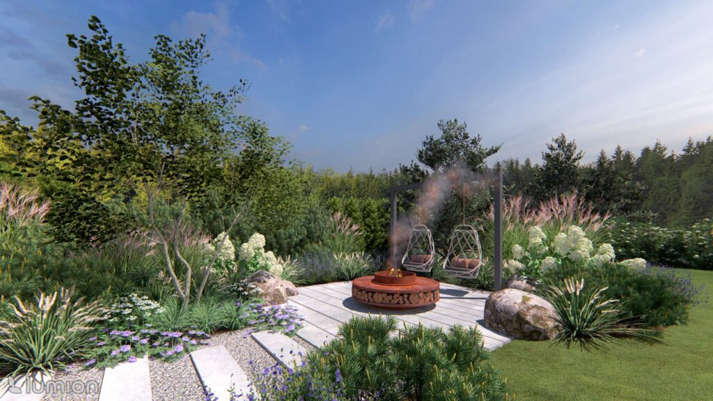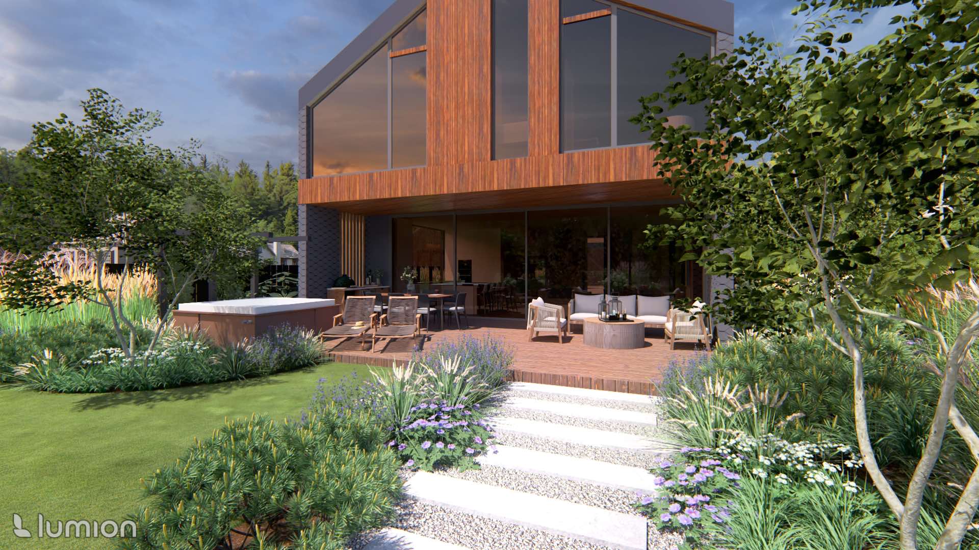 Most daily life takes place in the backyard. Here, cozy and private leisure areas were planned: a hot tub, a fire pit, a pergola for quiet time, and a small fitness area.