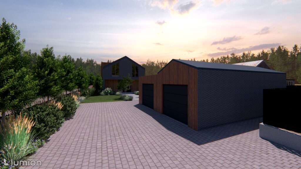 During the design process, the plot was clearly divided into two main zones. The front part was left for utility use, with a large parking area adapted to the owners’ needs. The residential side of the plot is separated and oriented toward coziness and everyday relaxation.