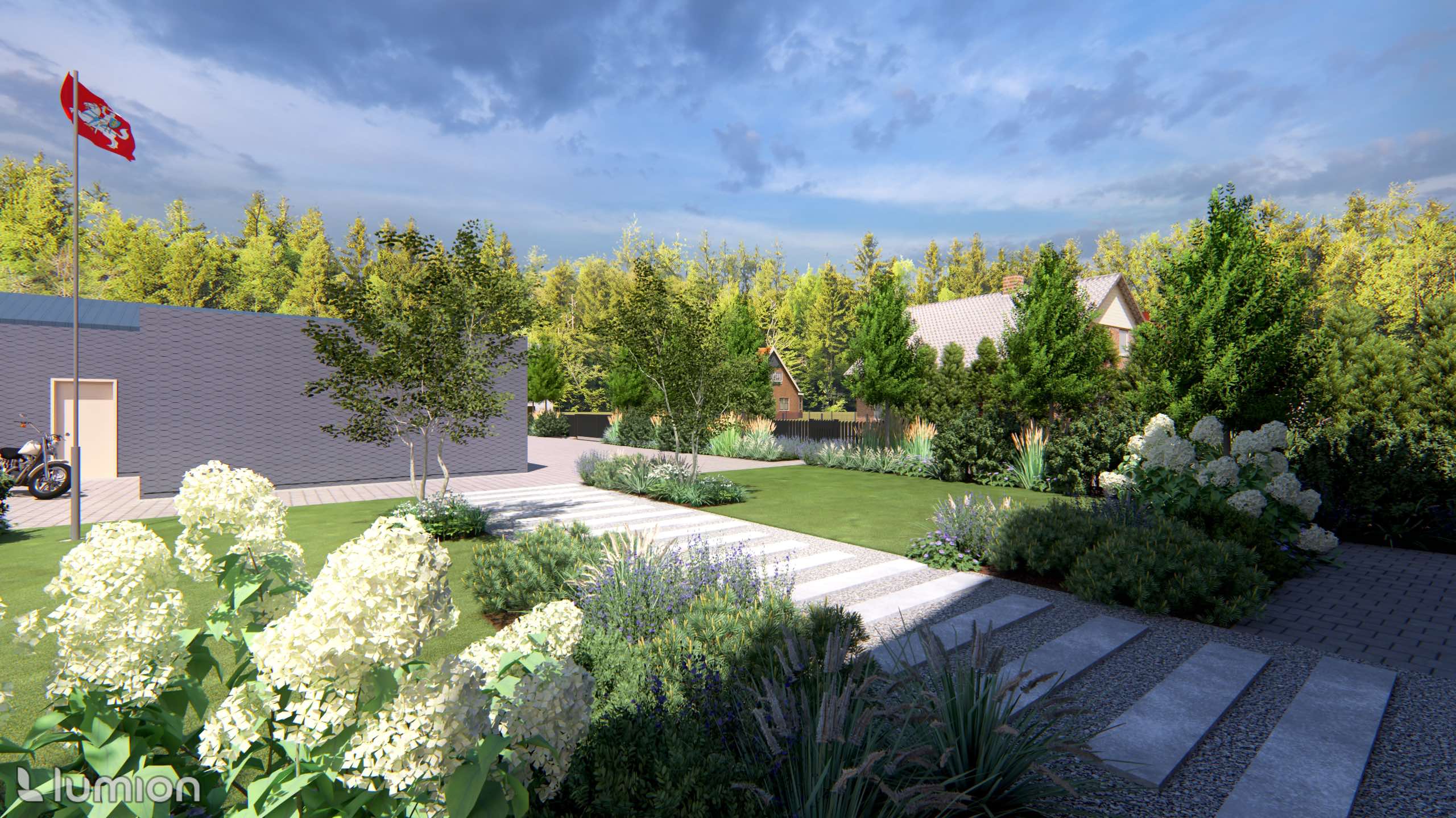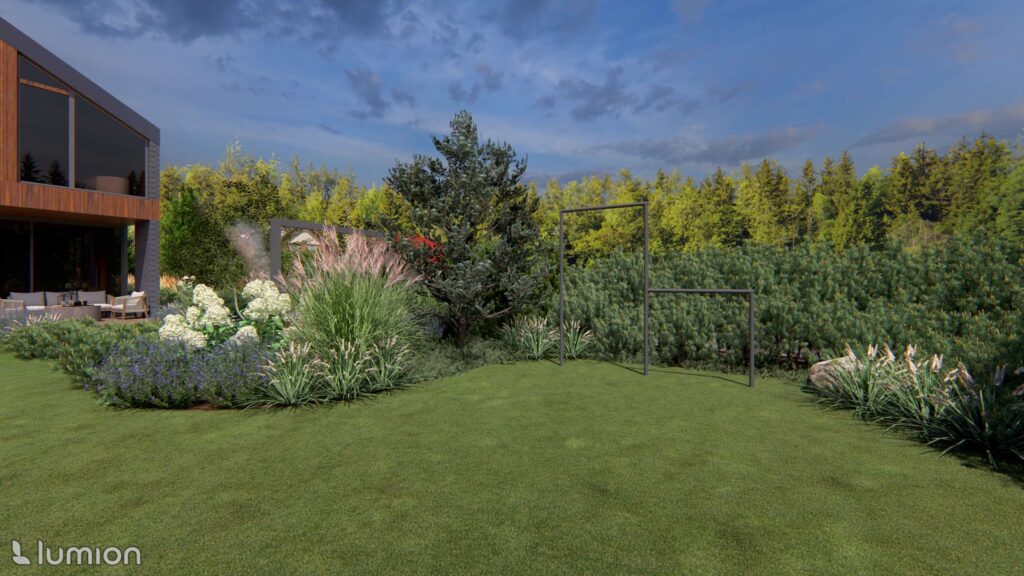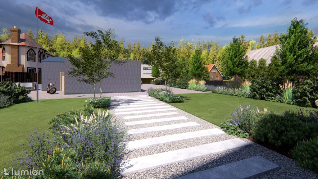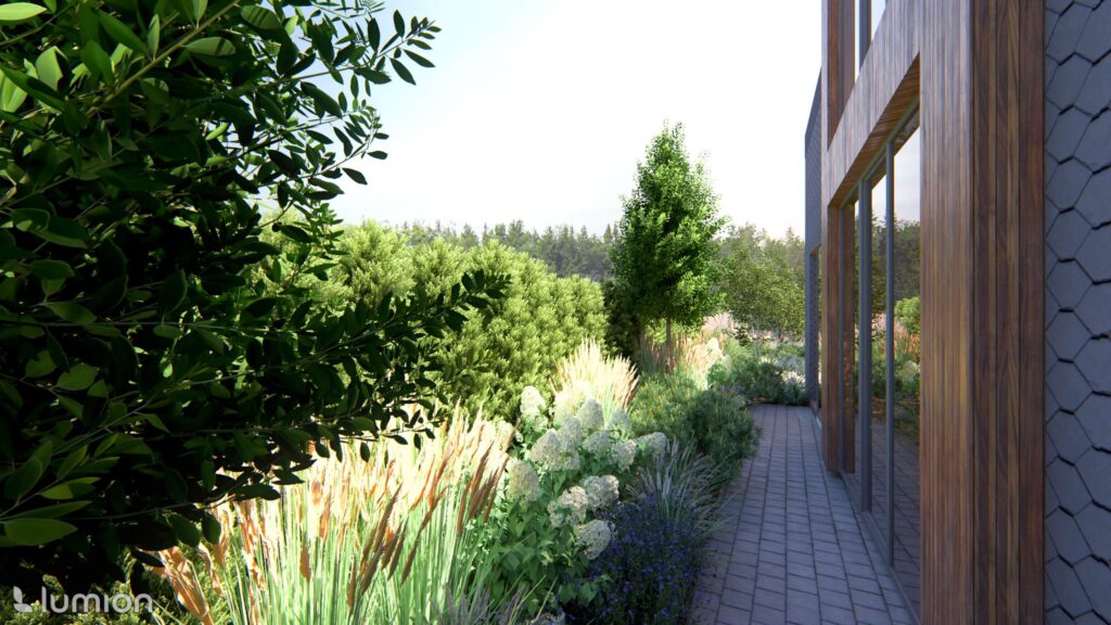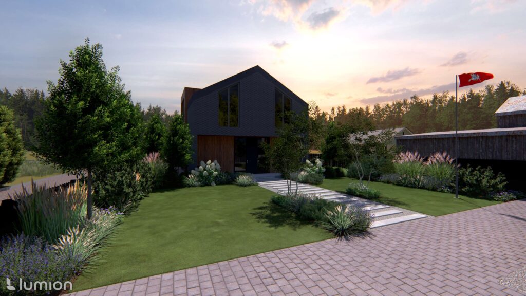 When designing this plot, two aspects were important to the owners: ensuring privacy and preserving the view of the Nemunas River. The project’s style was shaped by both the house architecture and the natural context—plants soften the stricter forms that dominate the space and allow the yard to maintain a visual connection with the river landscape.