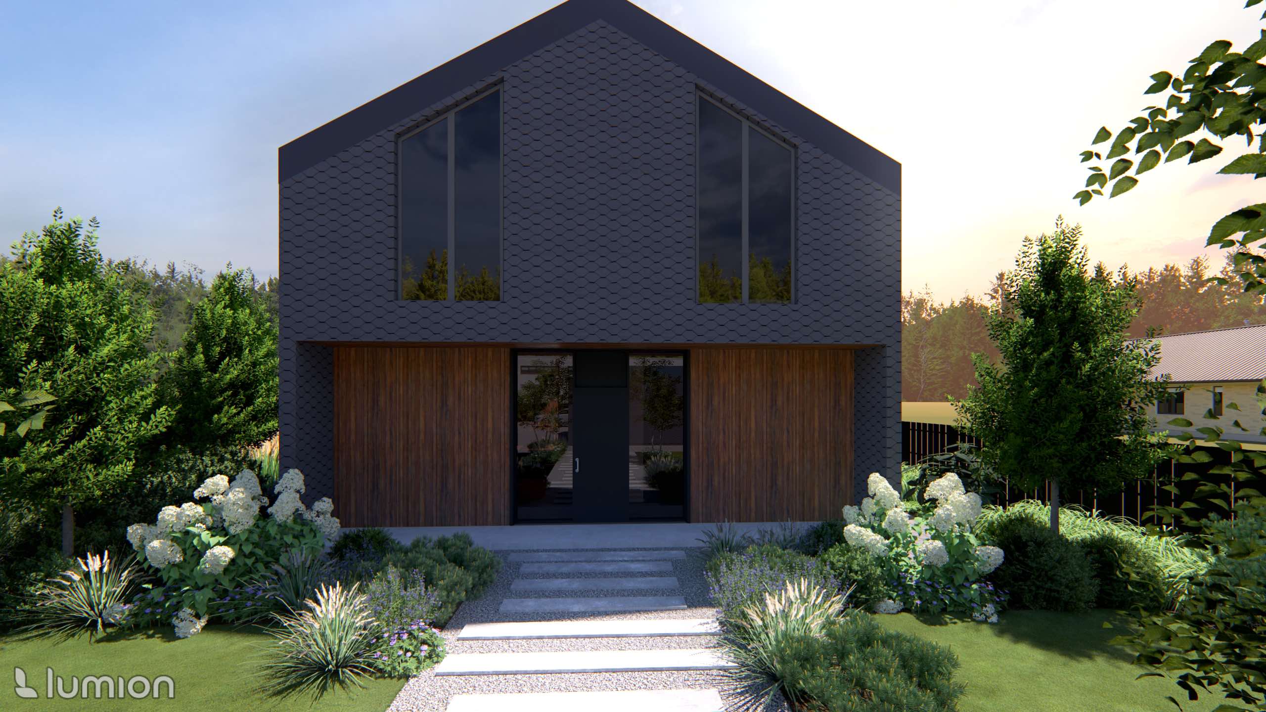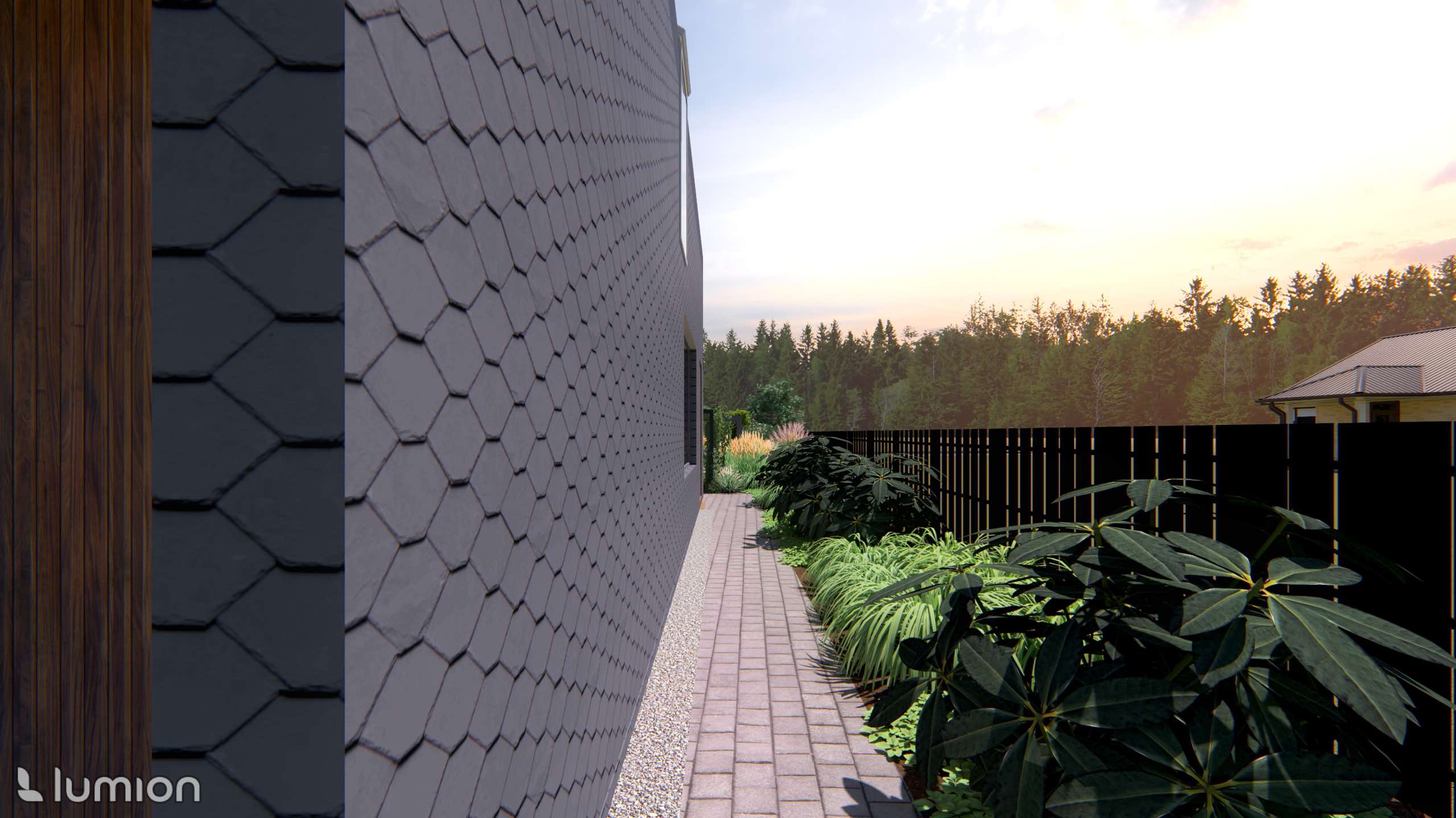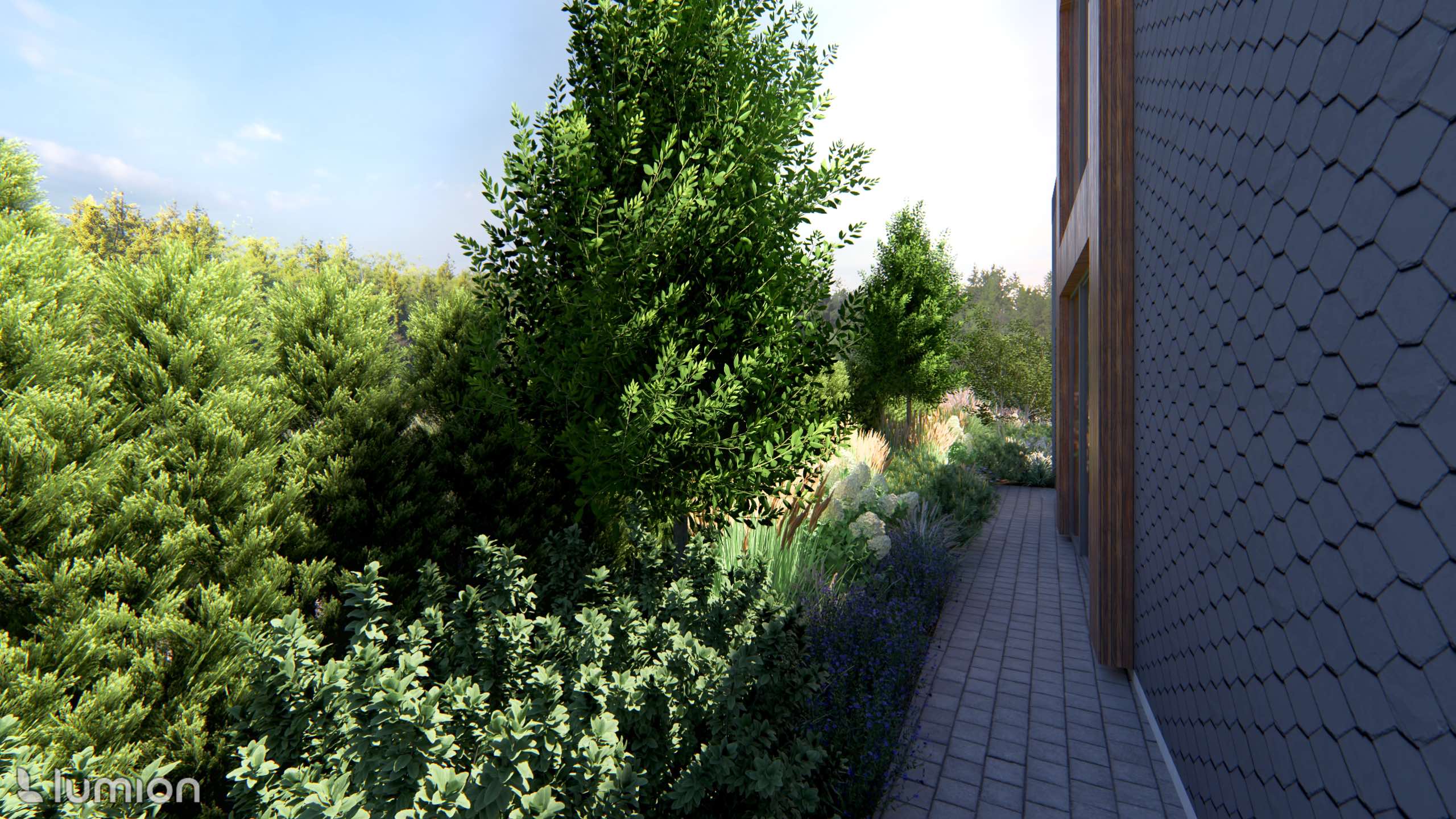 A wide concrete-slab path leads to the main house, and the trees alongside it form a natural arch. This solution gives the entrance clarity and structure while softening the path’s strict, linear character.