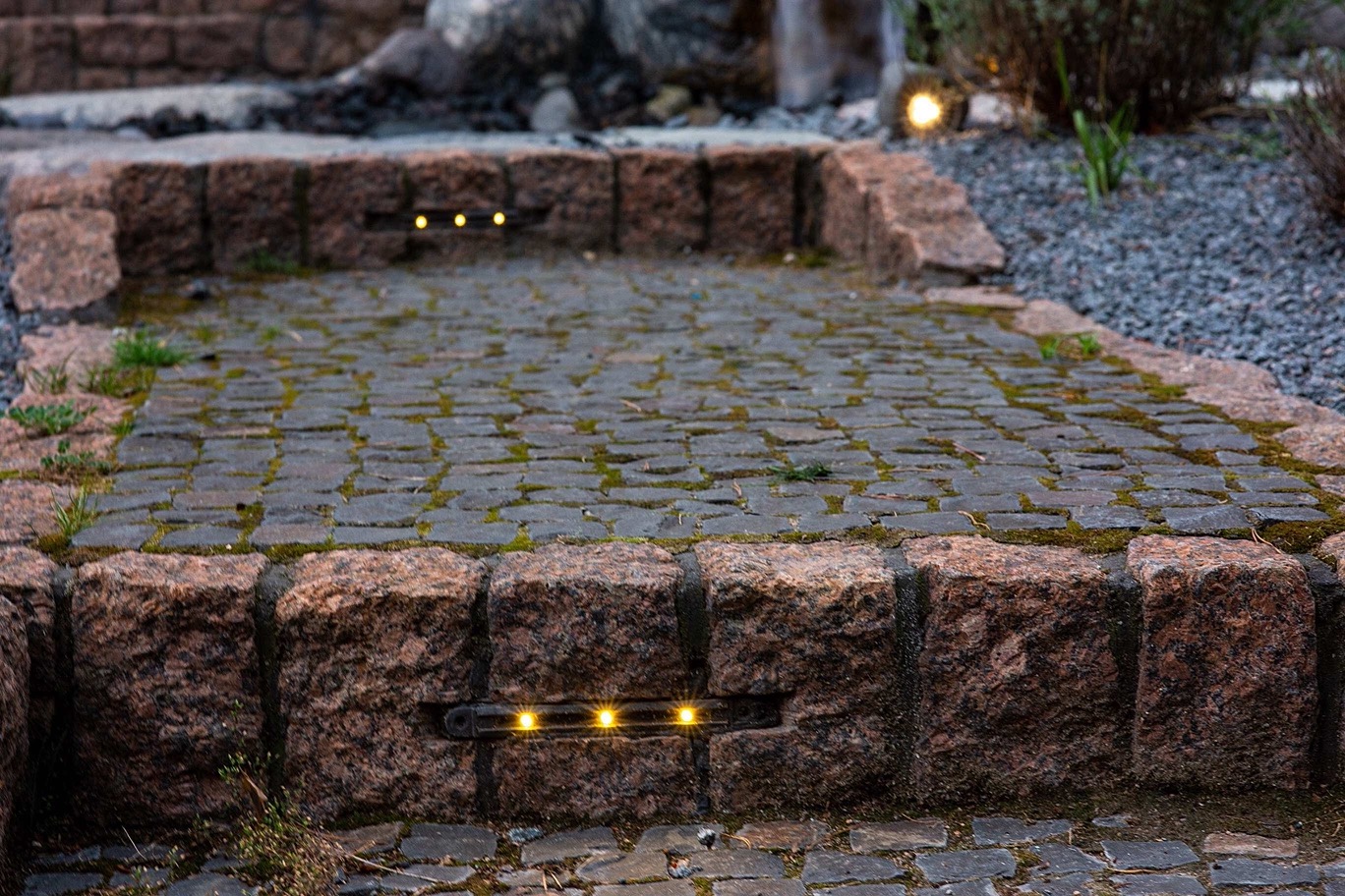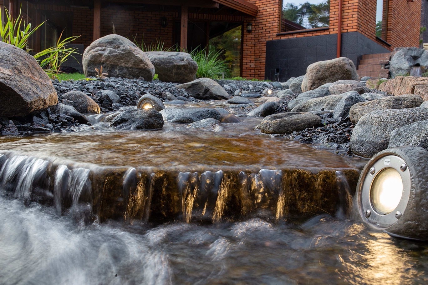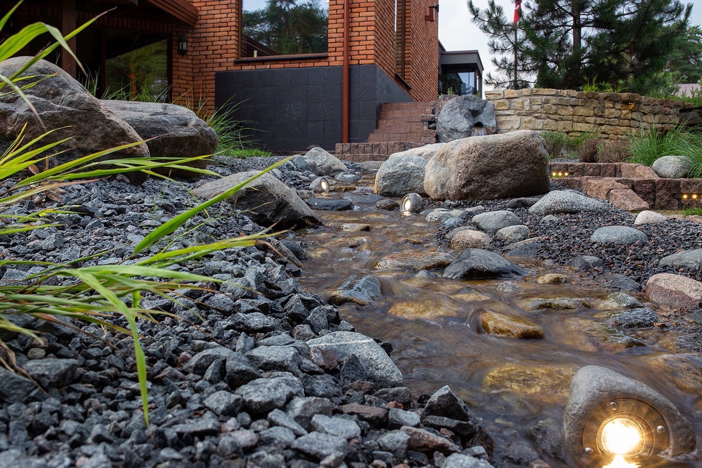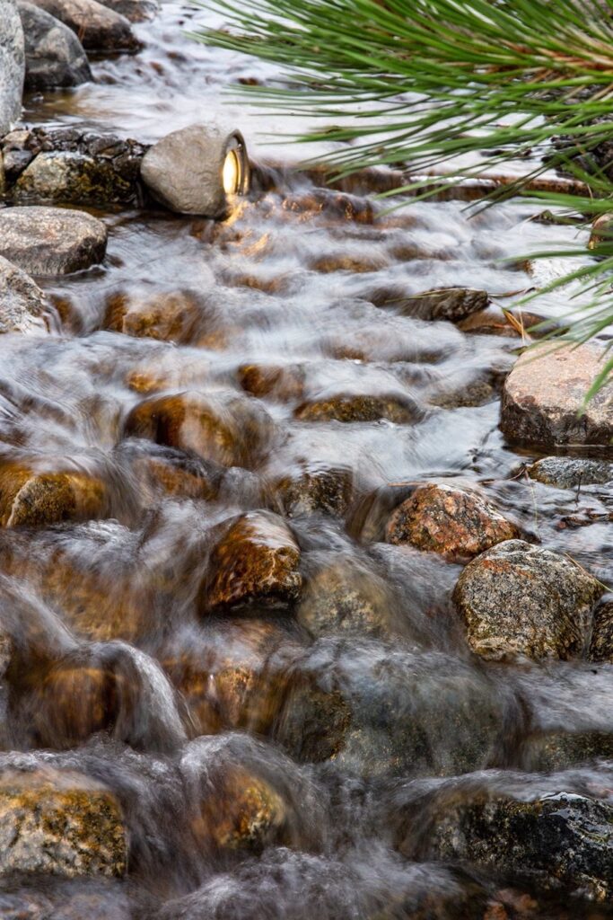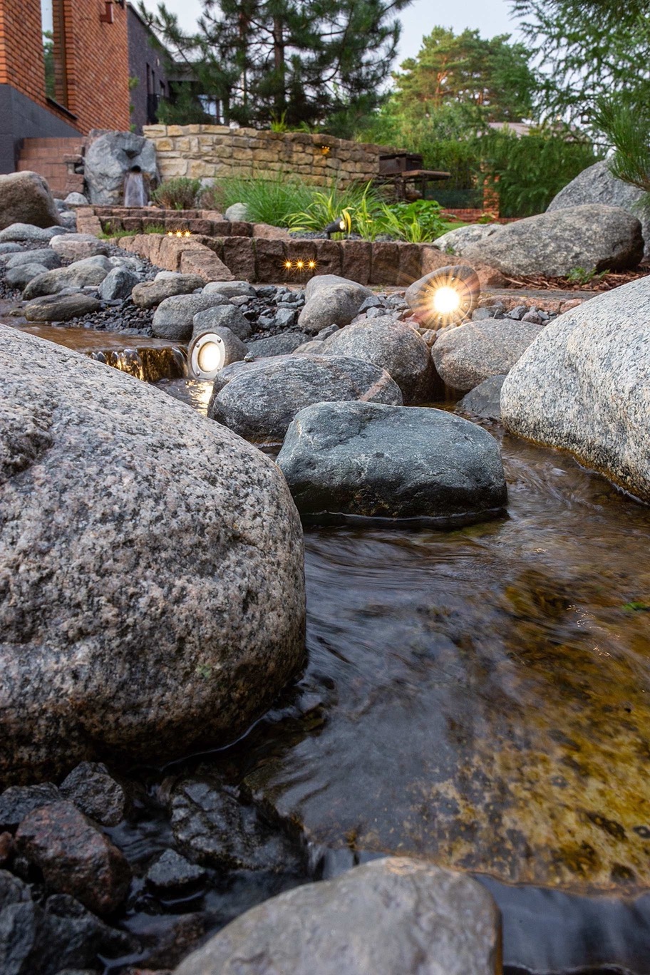 Taking the terrain differences into account, several cascades were formed along the stream to resolve changes in elevation, while the sound of falling water provides an ambient backdrop and adds a sensory dimension to the space. The stream’s shape and flow are emphasized with distinctive stones, which are illuminated after dark with dedicated lighting fixtures.