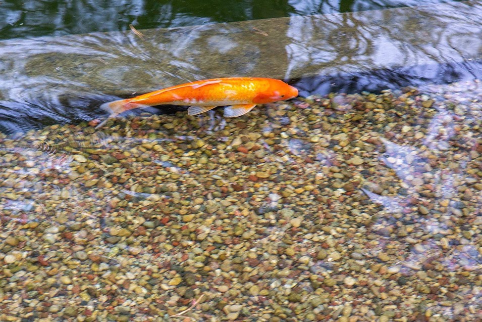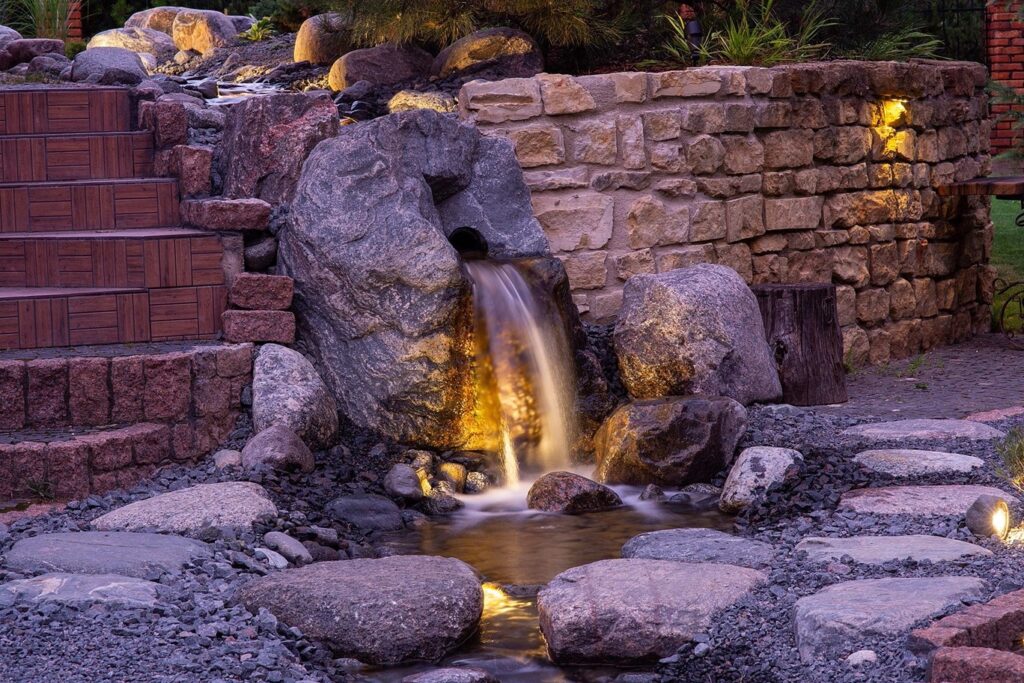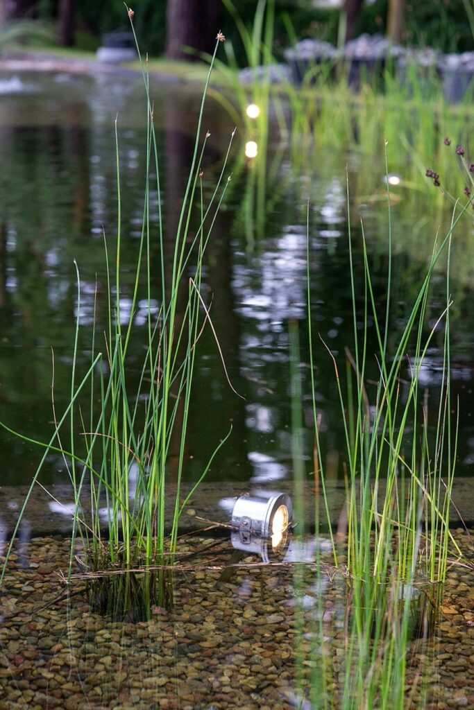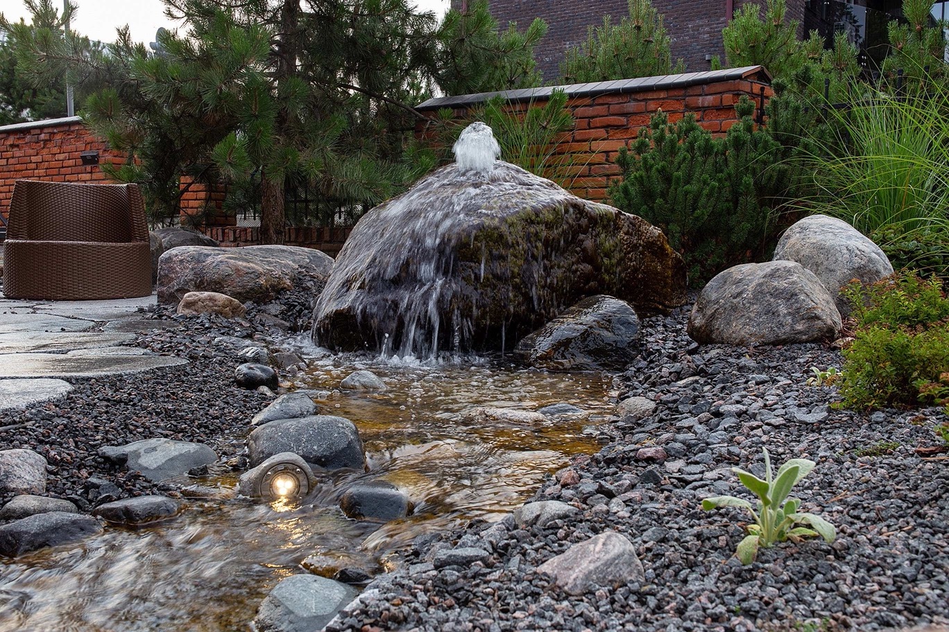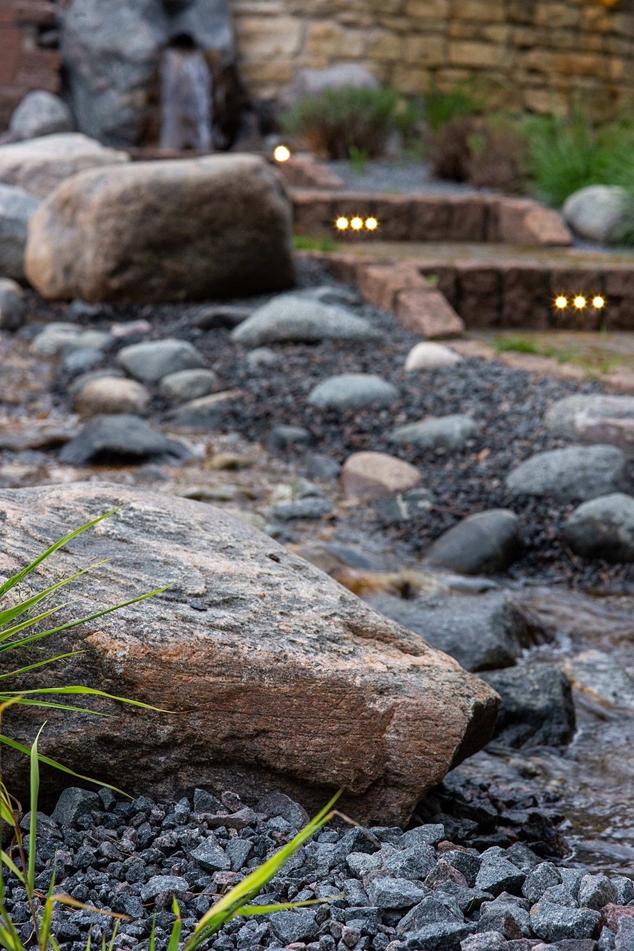 Taking the terrain differences into account, several cascades were formed along the stream to resolve changes in elevation, while the sound of falling water provides an ambient backdrop and adds a sensory dimension to the space. The stream’s shape and flow are emphasized with distinctive stones, which are illuminated after dark with dedicated lighting fixtures.