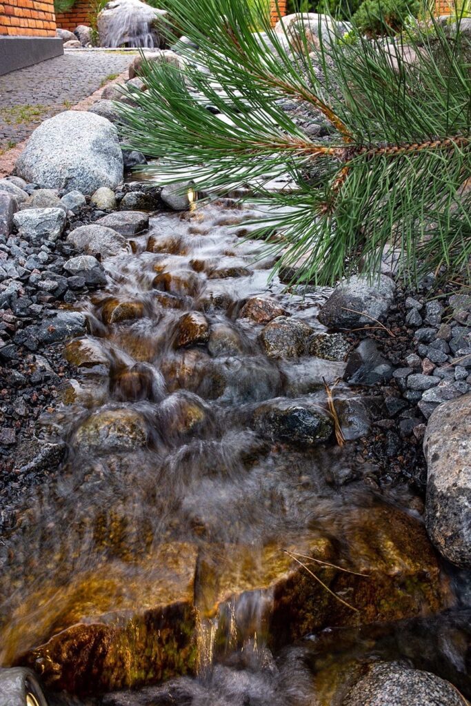 The stream begins from a spring emerging through stone and, winding for about 30 meters across the property, ends at the eco pool. The flow of water naturally links the different zones of the plot, creating a clear landscape structure and a continuous route through the site.