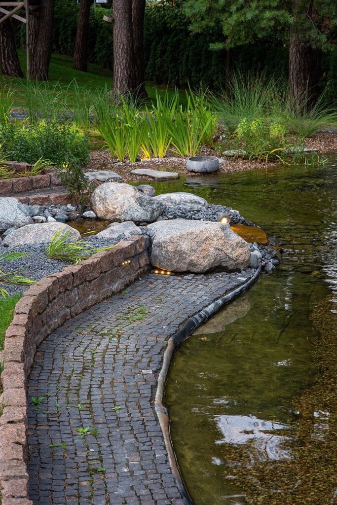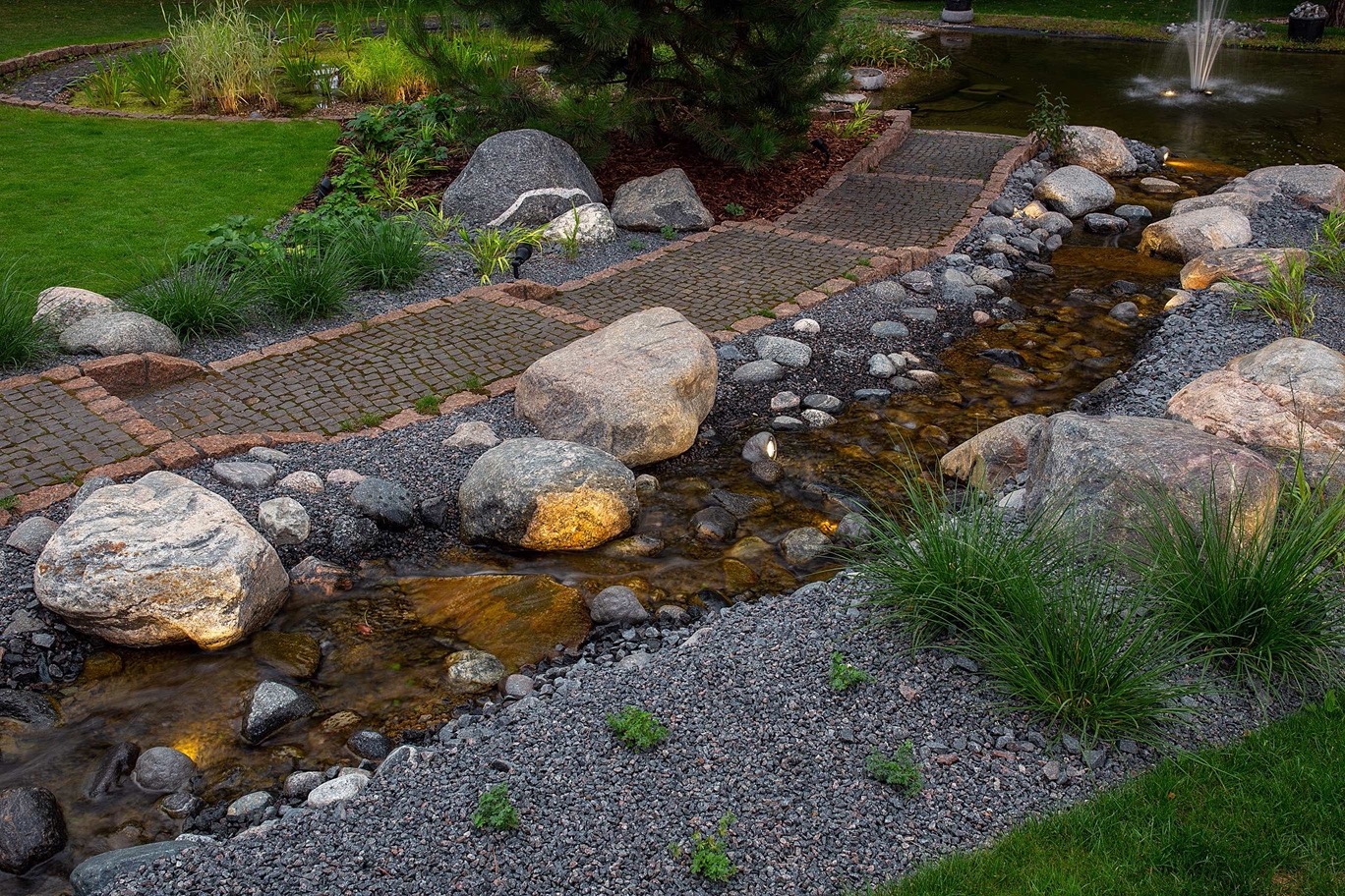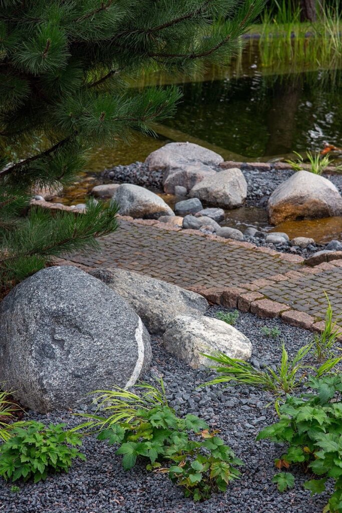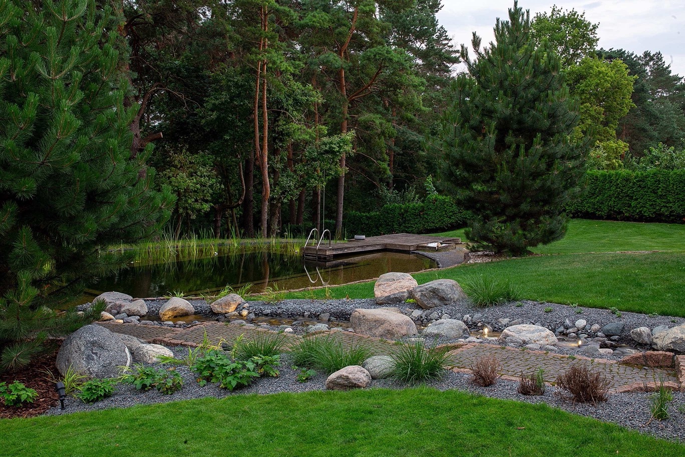 The main task of this landscape project was to connect the existing natural swimming pond (eco pool) on the plot with the representative entrance area, creating a cohesive, visually engaging flow of movement through the entire site. For this, a naturalistic stream concept was chosen.