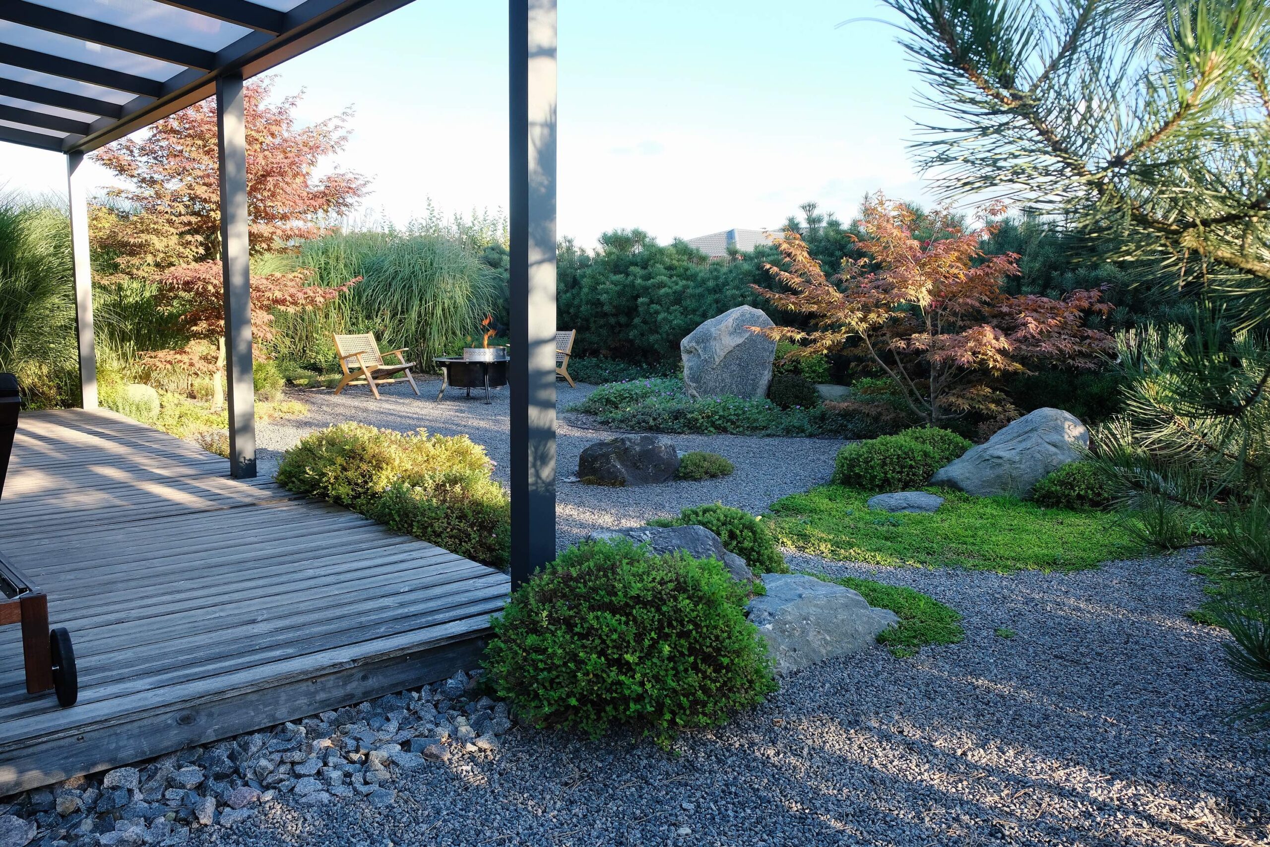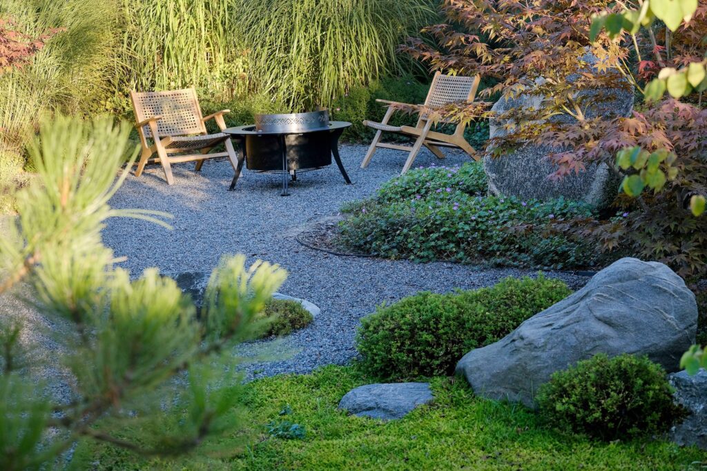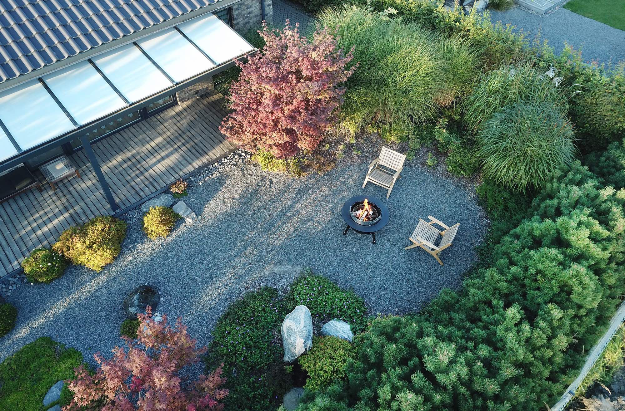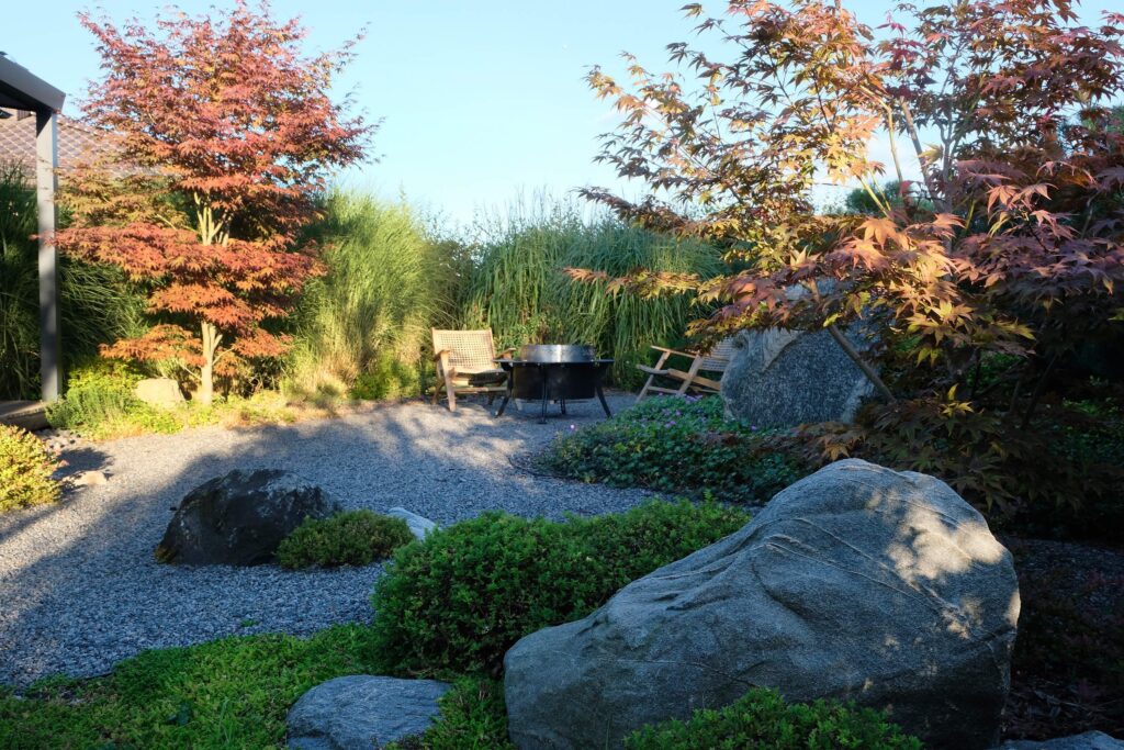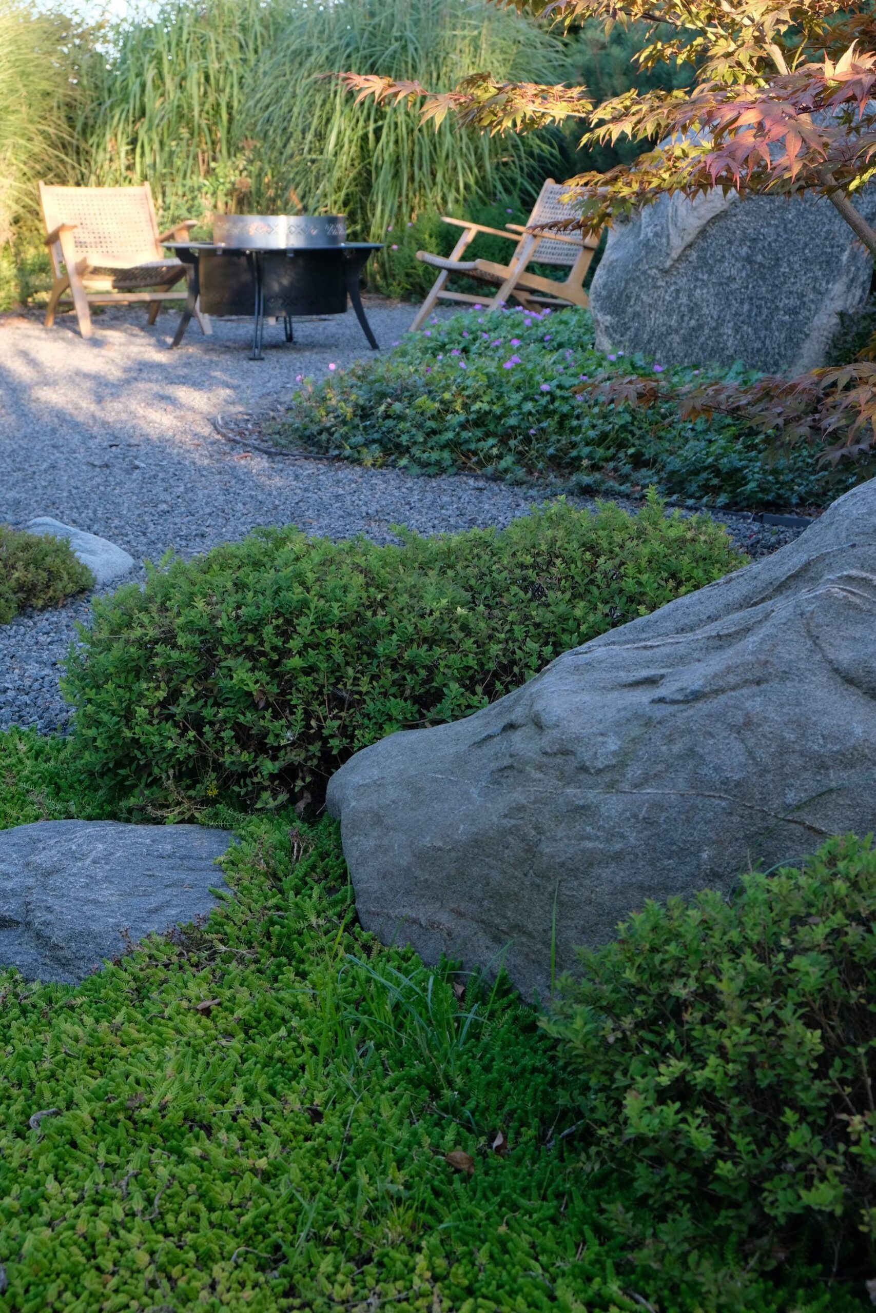 The house façade faces north, so plants that dislike strong sun dominate here. In the inner yard on the south side, by contrast, long-blooming, sun-loving plants were planted. With the lawn removed, a functional and calming fire-pit area was created, separated from neighbors by tall ornamental grasses—miscanthus—so that when you’re there, you forget you’re in a densely built-up neighborhood. Groups of stones complement the overall courtyard design and create a meditative mood; the main focal point here is a red-leaved Japanese maple.