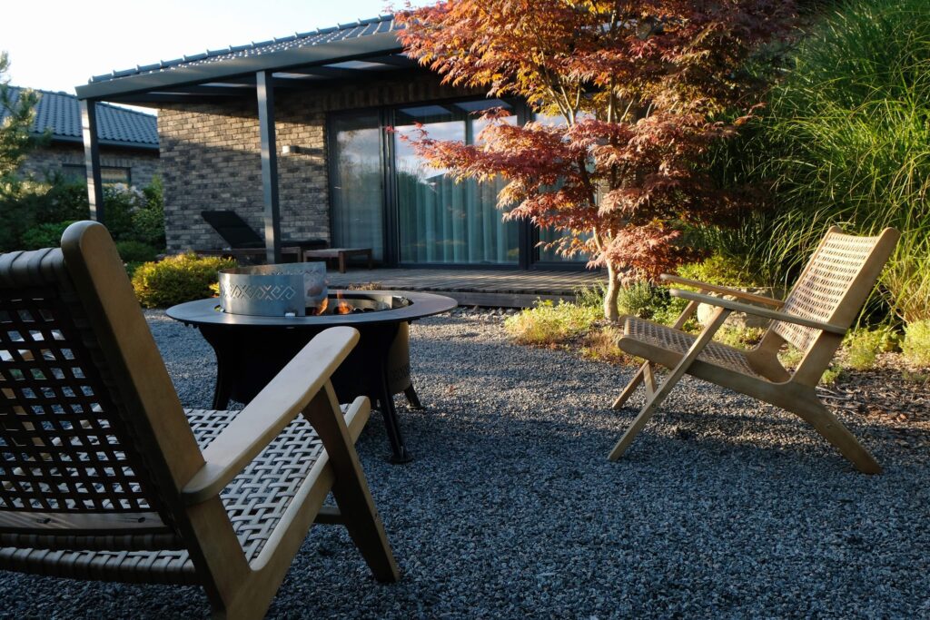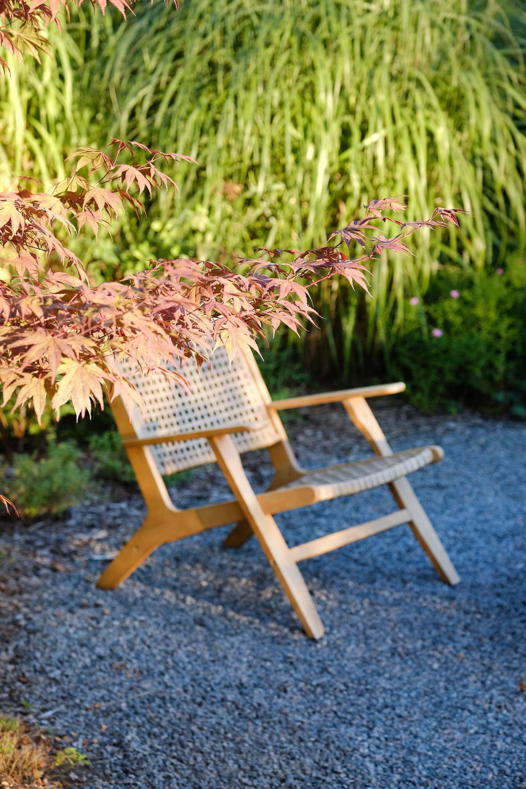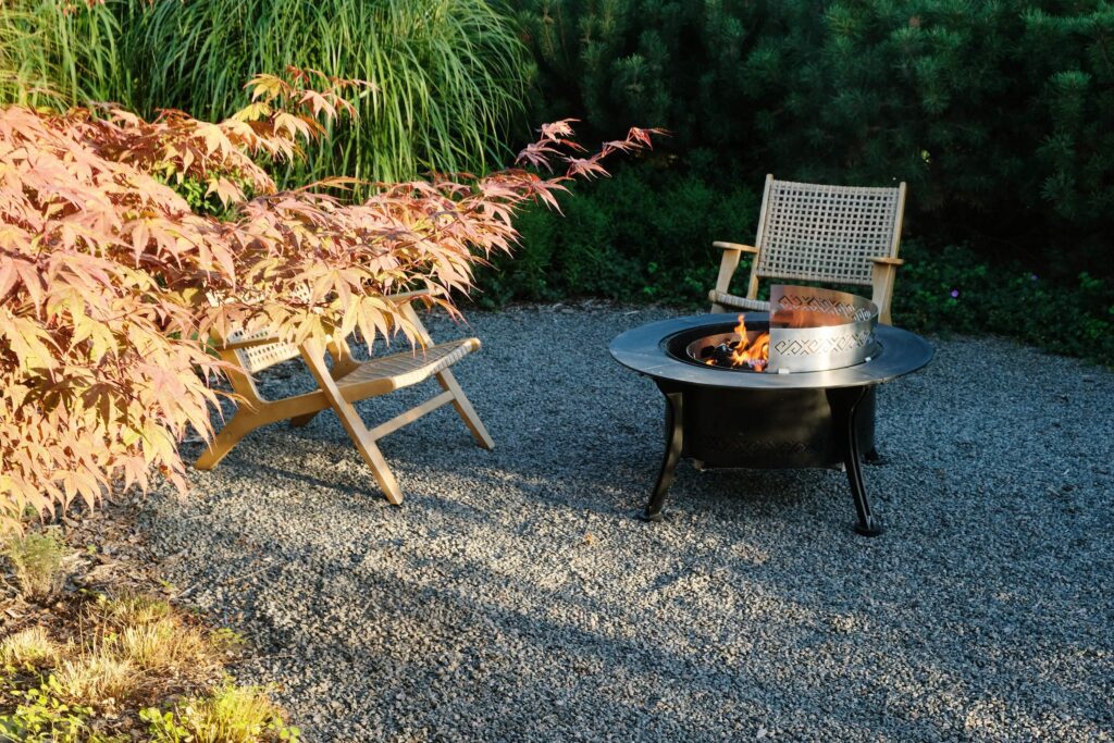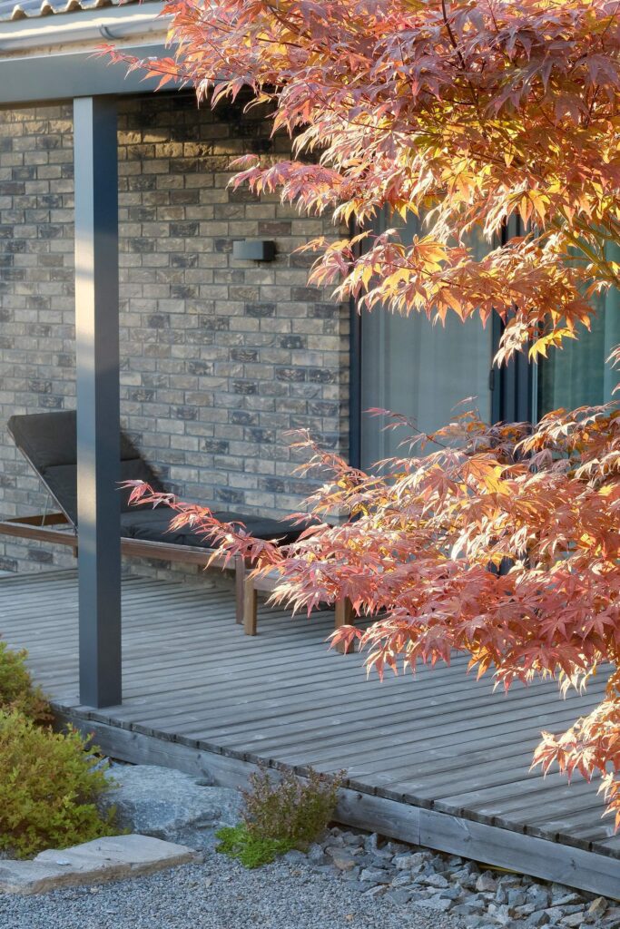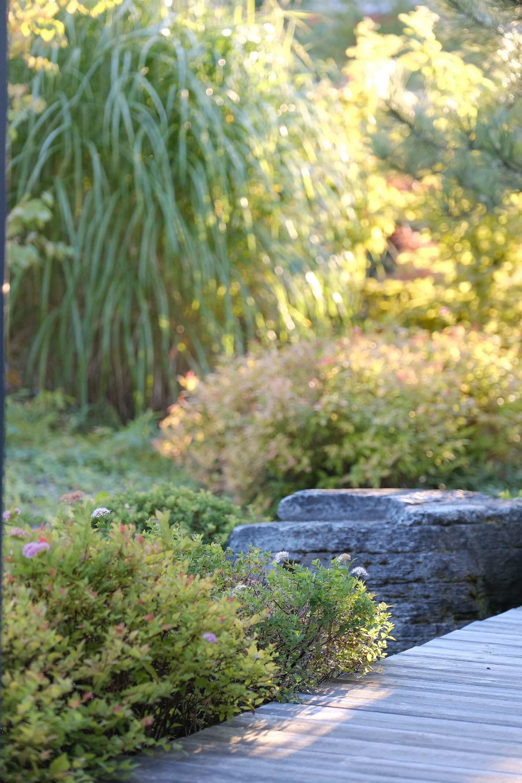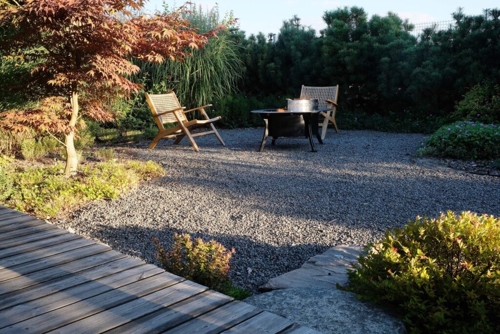 The house façade faces north, so plants that dislike strong sun dominate here. In the inner yard on the south side, by contrast, long-blooming, sun-loving plants were planted. With the lawn removed, a functional and calming fire-pit area was created, separated from neighbors by tall ornamental grasses—miscanthus—so that when you’re there, you forget you’re in a densely built-up neighborhood. Groups of stones complement the overall courtyard design and create a meditative mood; the main focal point here is a red-leaved Japanese maple.