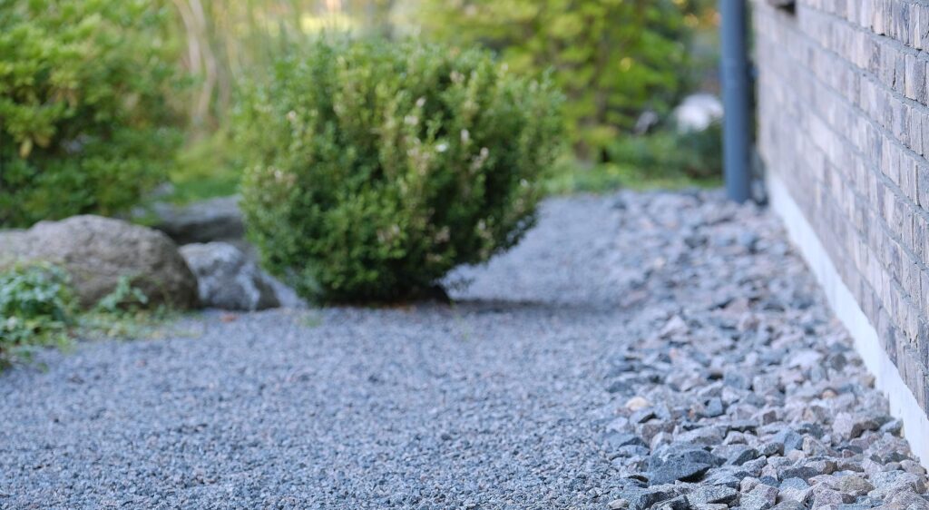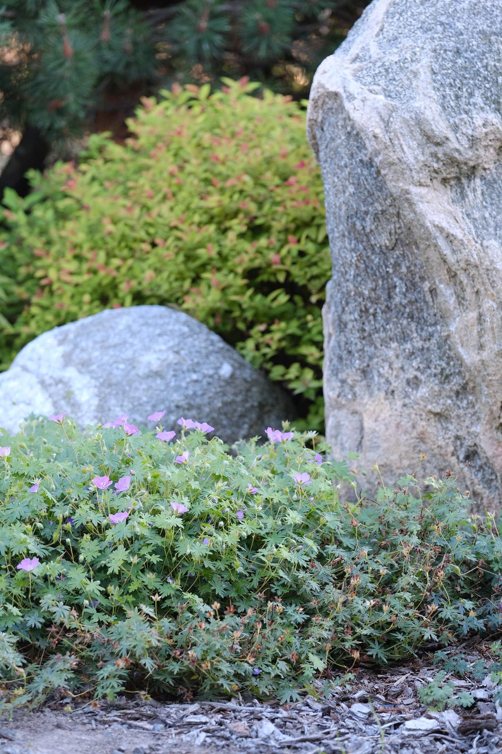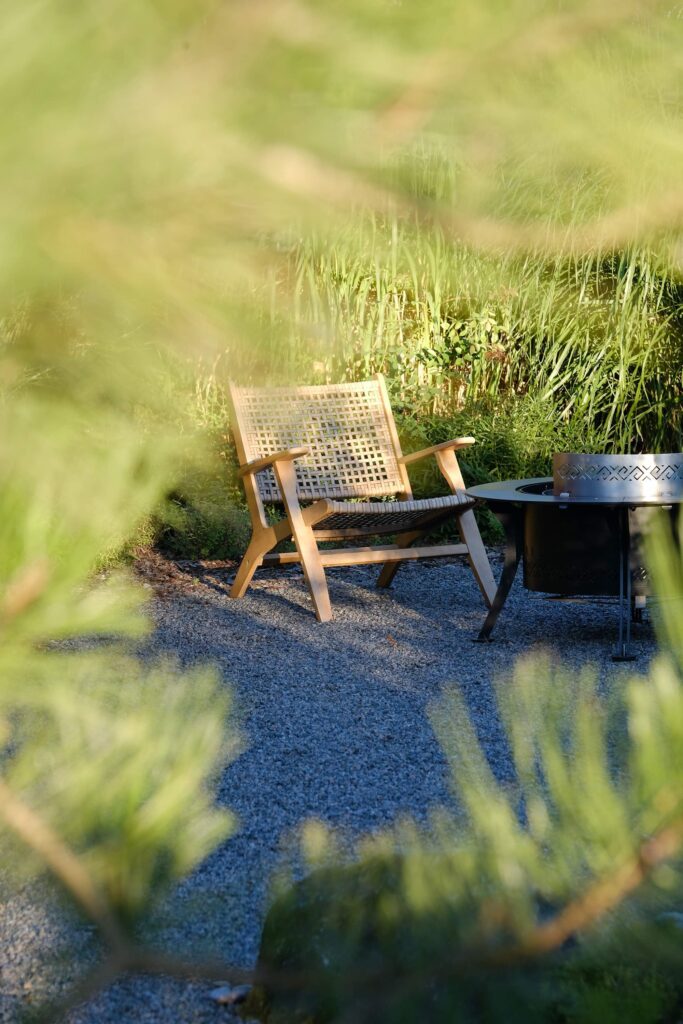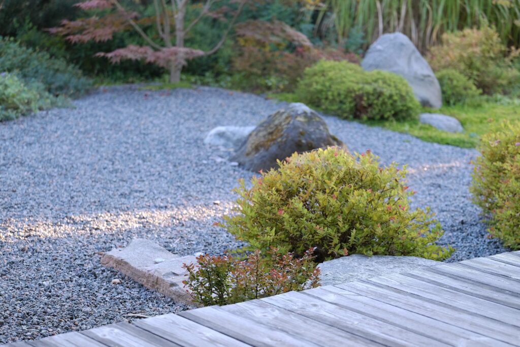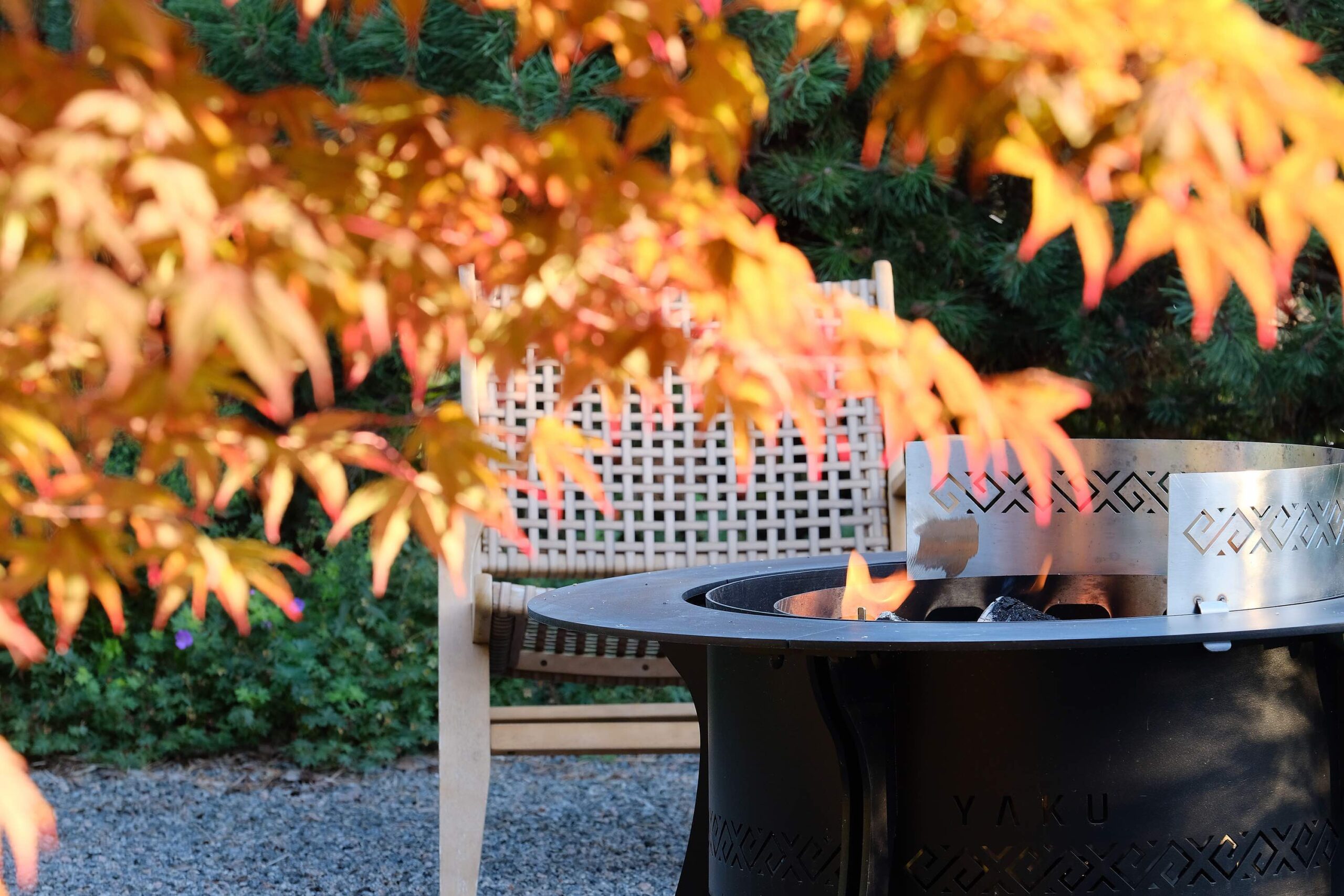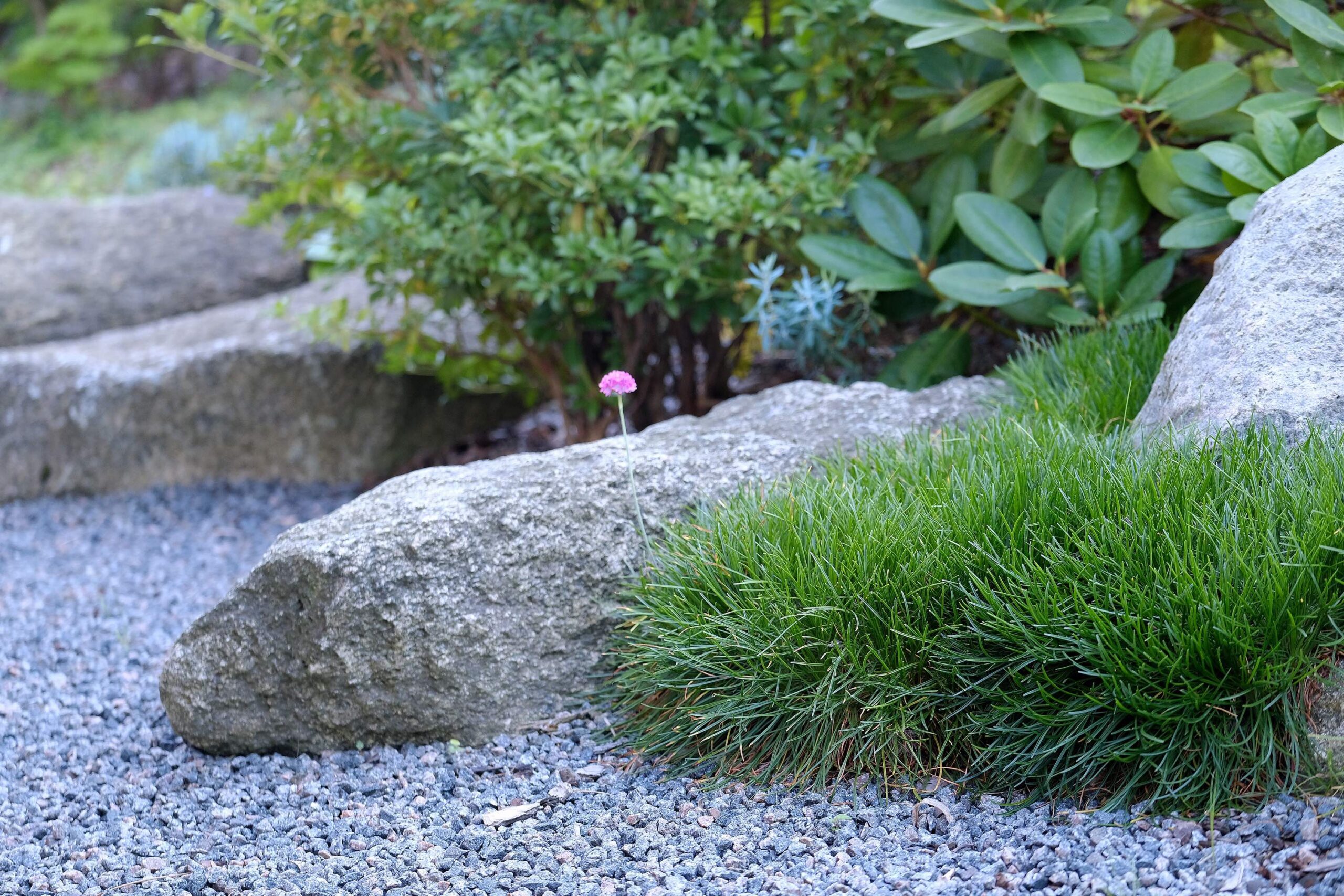 The house façade faces north, so plants that dislike strong sun dominate here. In the inner yard on the south side, by contrast, long-blooming, sun-loving plants were planted. With the lawn removed, a functional and calming fire-pit area was created, separated from neighbors by tall ornamental grasses—miscanthus—so that when you’re there, you forget you’re in a densely built-up neighborhood. Groups of stones complement the overall courtyard design and create a meditative mood; the main focal point here is a red-leaved Japanese maple.