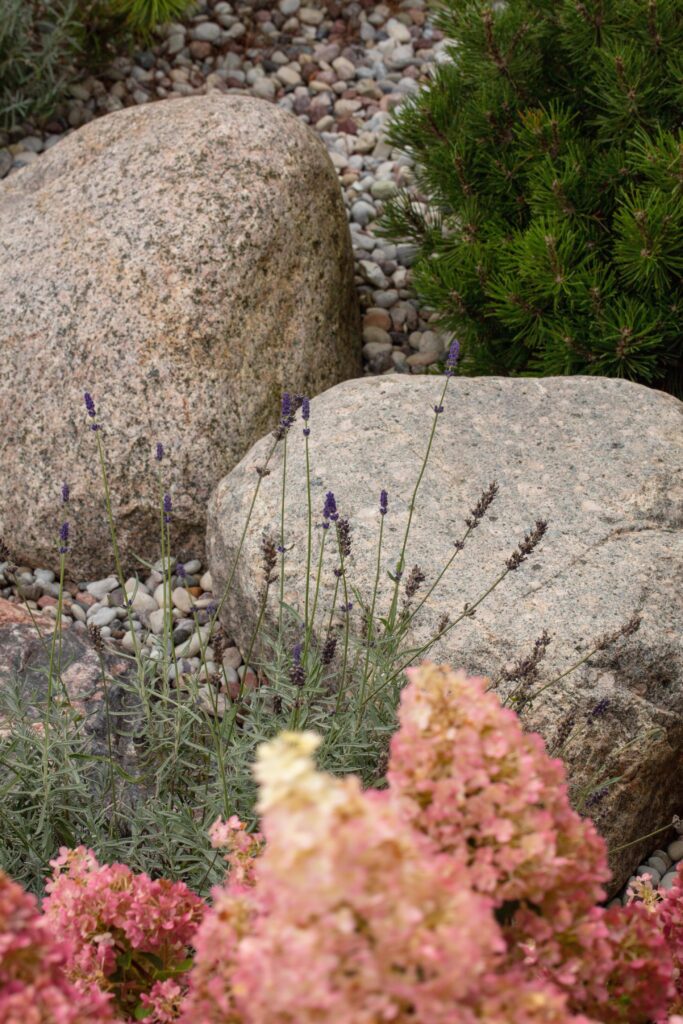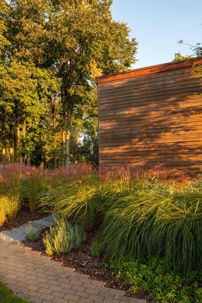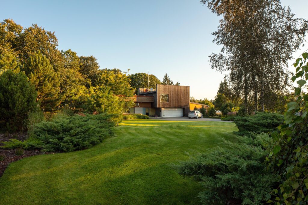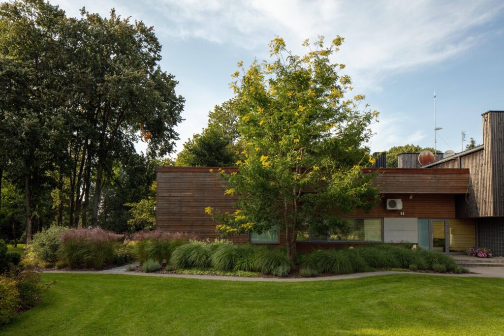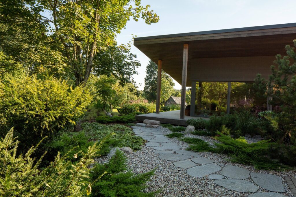 In the Šakiai district, at a farming family’s homestead, a landscape project was prepared where a personal family story, functional solutions, and aesthetic harmony intertwine. Across the large property, the designed spaces connect the main house, the guest area, the utility/farm zone, and the edge of the forest into one cohesive environment. The central idea of the project became the “family hill”—a mound planted with perennials whose blooming periods are linked to each family member’s birthday. This concept is complemented by themed “islands” that distill different functions: relaxation, socializing, privacy, and a connection with nature. Next to the main house, a terrace was planned and planted with airy, lightly structured herbaceous plants that soften the lines of the modern architecture. Nearby, among rhododendrons, miscanthus grasses, and natural stones, a fire-pit area was created. Here, function and aesthetics come together—large stones serve as seating and contrast with the soft silhouettes of the plants. On the southern side, a shaped honey locust tree was preserved, and behind it a hydrangea path is planned, leading toward the center of the homestead. In the northern part, a more enclosed yet bright terrace was designed, with a view of the forest. As evening falls, the setting is enhanced by thoughtfully planned lighting that highlights tree canopies and individual planting accents. The designed space is oriented around the rhythm of family life—spacious yet cozy, functional, and personal. Each family member has their own place, their own time—and their own bloom.
