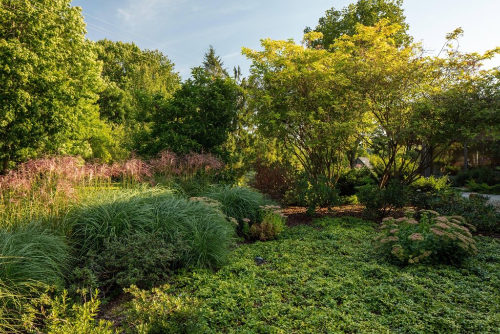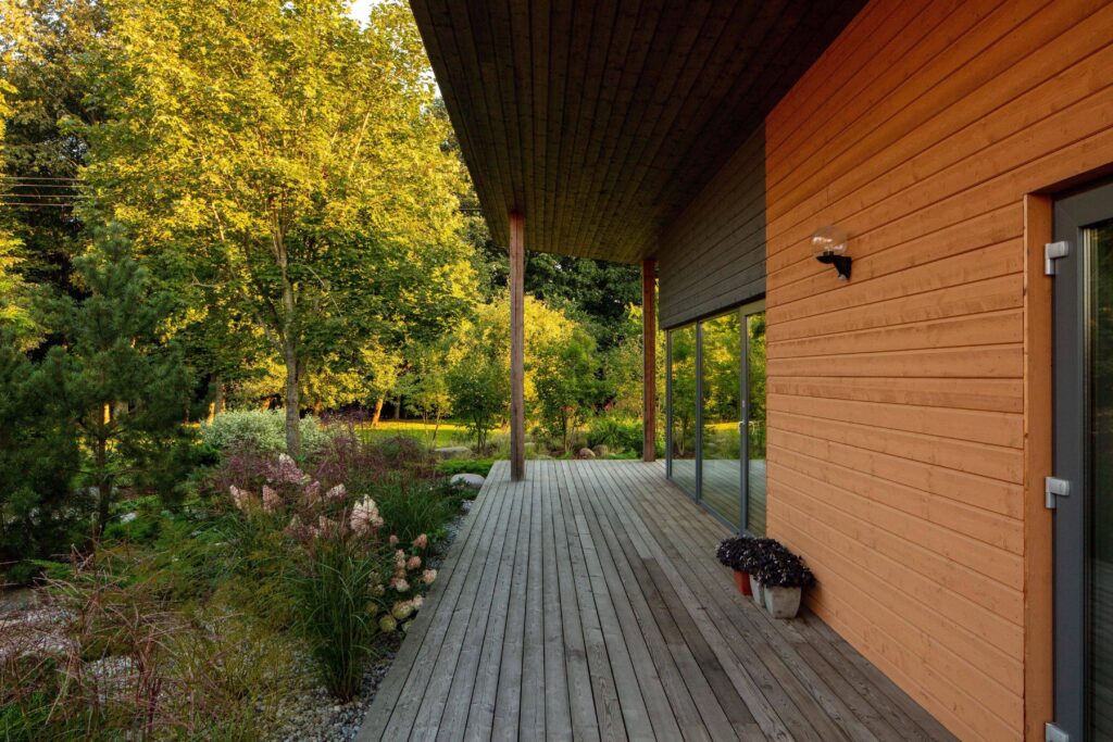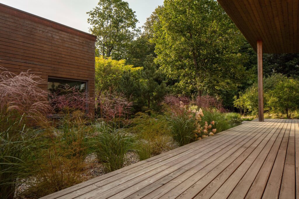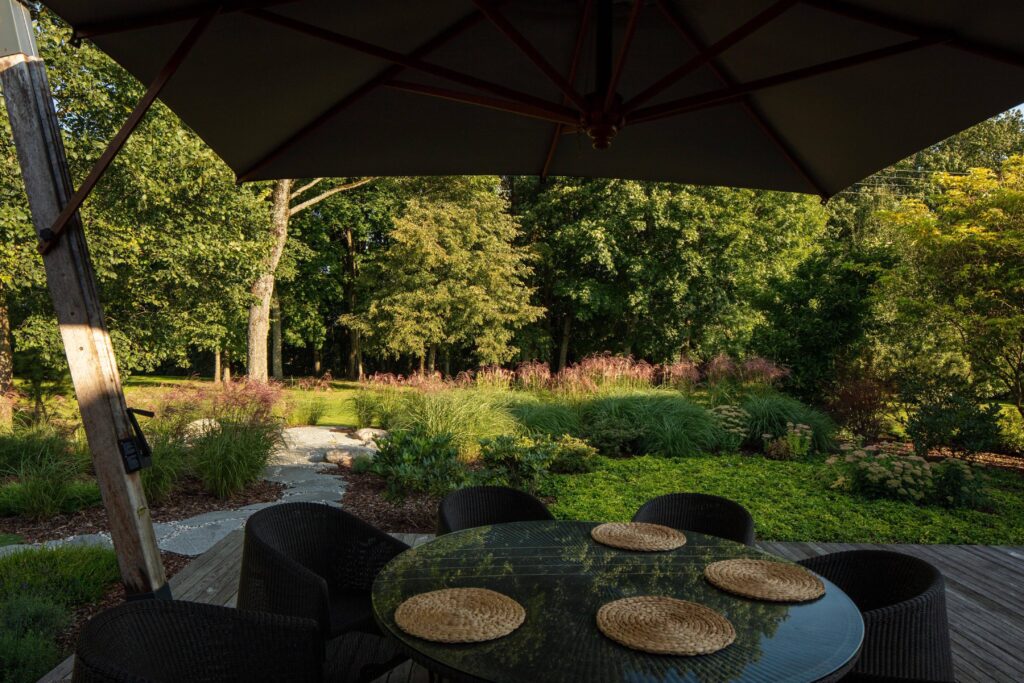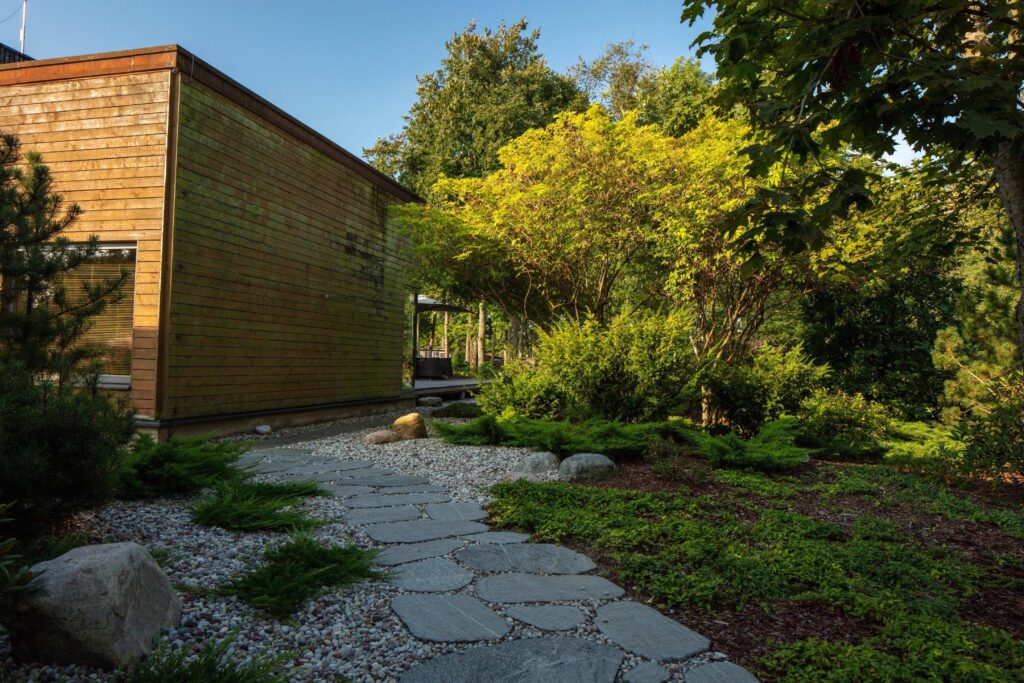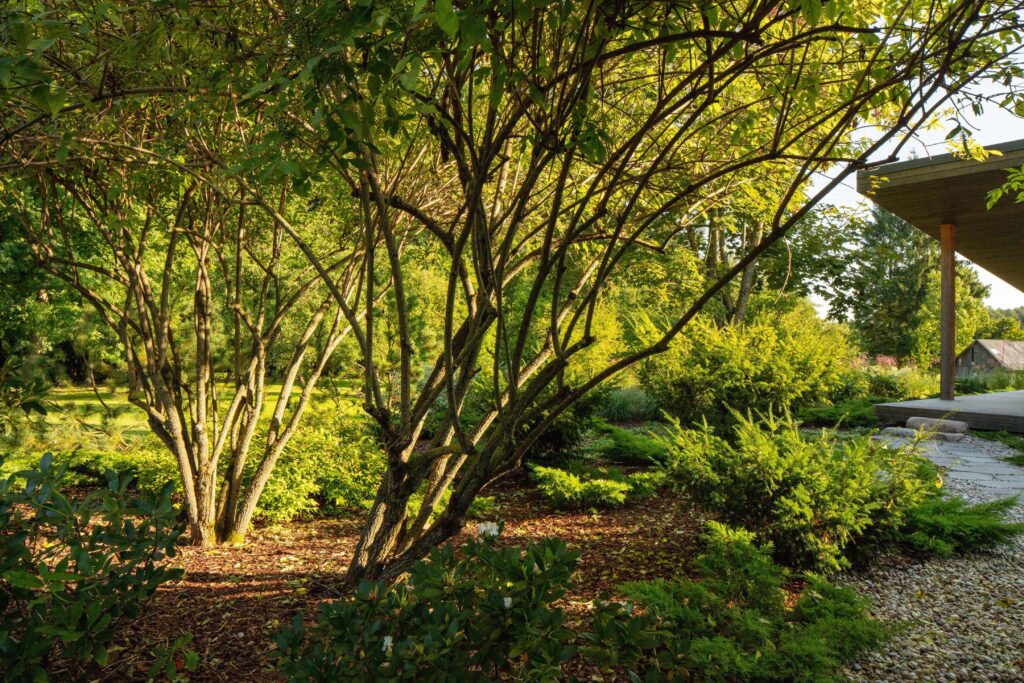 In the Šakiai district, at a farming family’s homestead, a landscape project was prepared where a personal family story, functional solutions, and aesthetic harmony intertwine. Across the large property, the designed spaces connect the main house, the guest area, the utility/farm zone, and the edge of the forest into one cohesive environment. The central idea of the project became the “family hill”—a mound planted with perennials whose blooming periods are linked to each family member’s birthday. This concept is complemented by themed “islands” that distill different functions: relaxation, socializing, privacy, and a connection with nature. Next to the main house, a terrace was planned and planted with airy, lightly structured herbaceous plants that soften the lines of the modern architecture. Nearby, among rhododendrons, miscanthus grasses, and natural stones, a fire-pit area was created. Here, function and aesthetics come together—large stones serve as seating and contrast with the soft silhouettes of the plants. On the southern side, a shaped honey locust tree was preserved, and behind it a hydrangea path is planned, leading toward the center of the homestead. In the northern part, a more enclosed yet bright terrace was designed, with a view of the forest. As evening falls, the setting is enhanced by thoughtfully planned lighting that highlights tree canopies and individual planting accents. The designed space is oriented around the rhythm of family life—spacious yet cozy, functional, and personal. Each family member has their own place, their own time—and their own bloom.