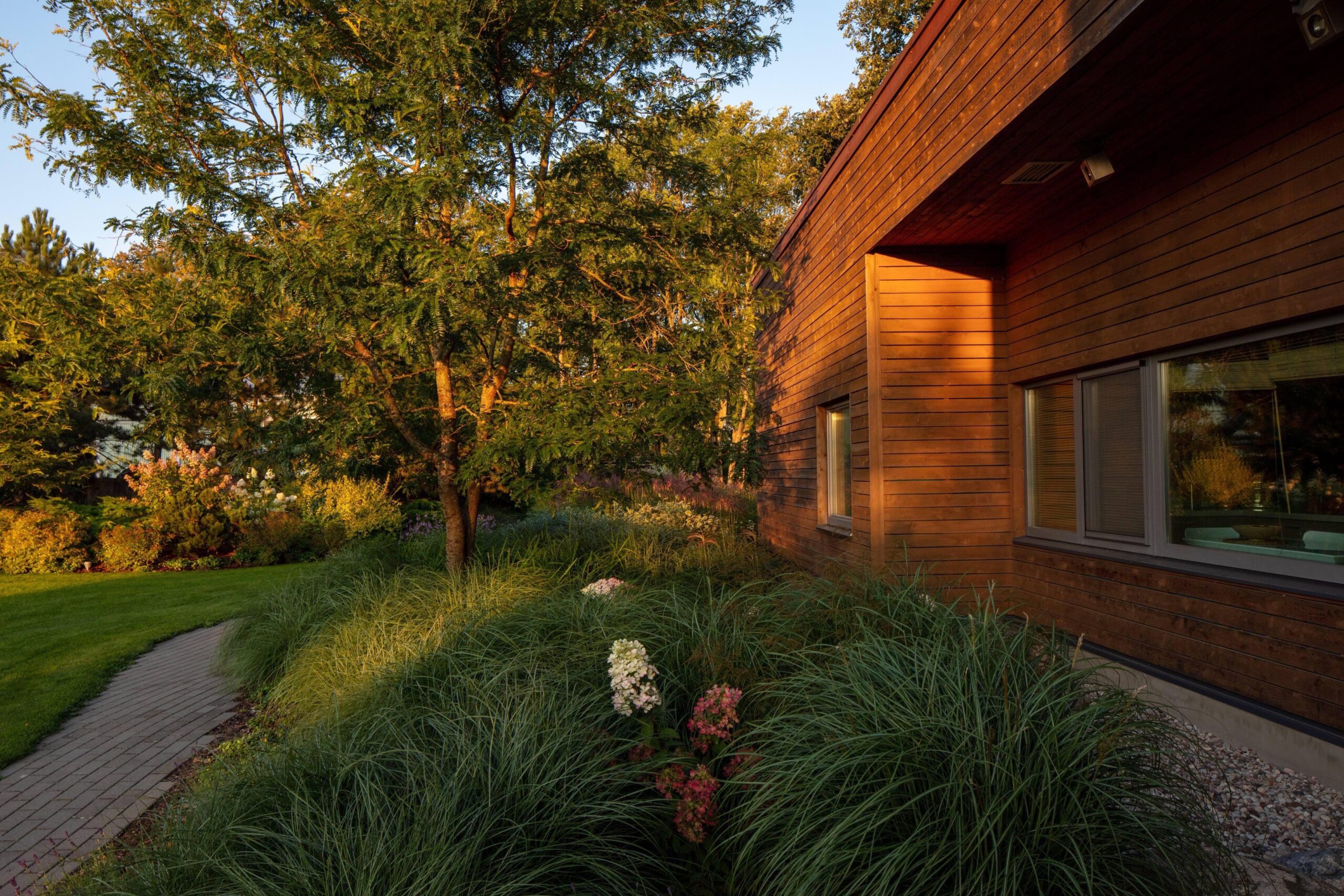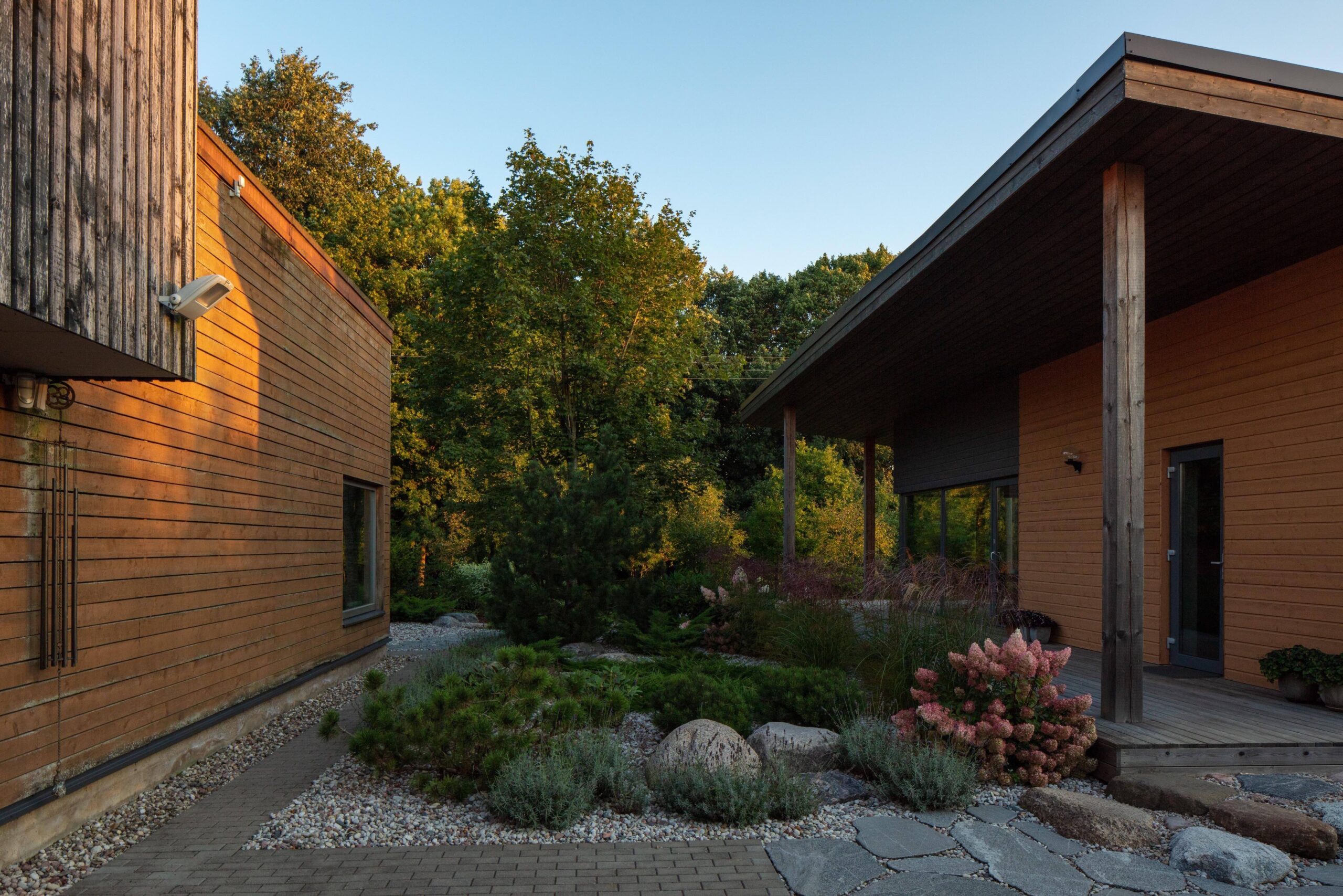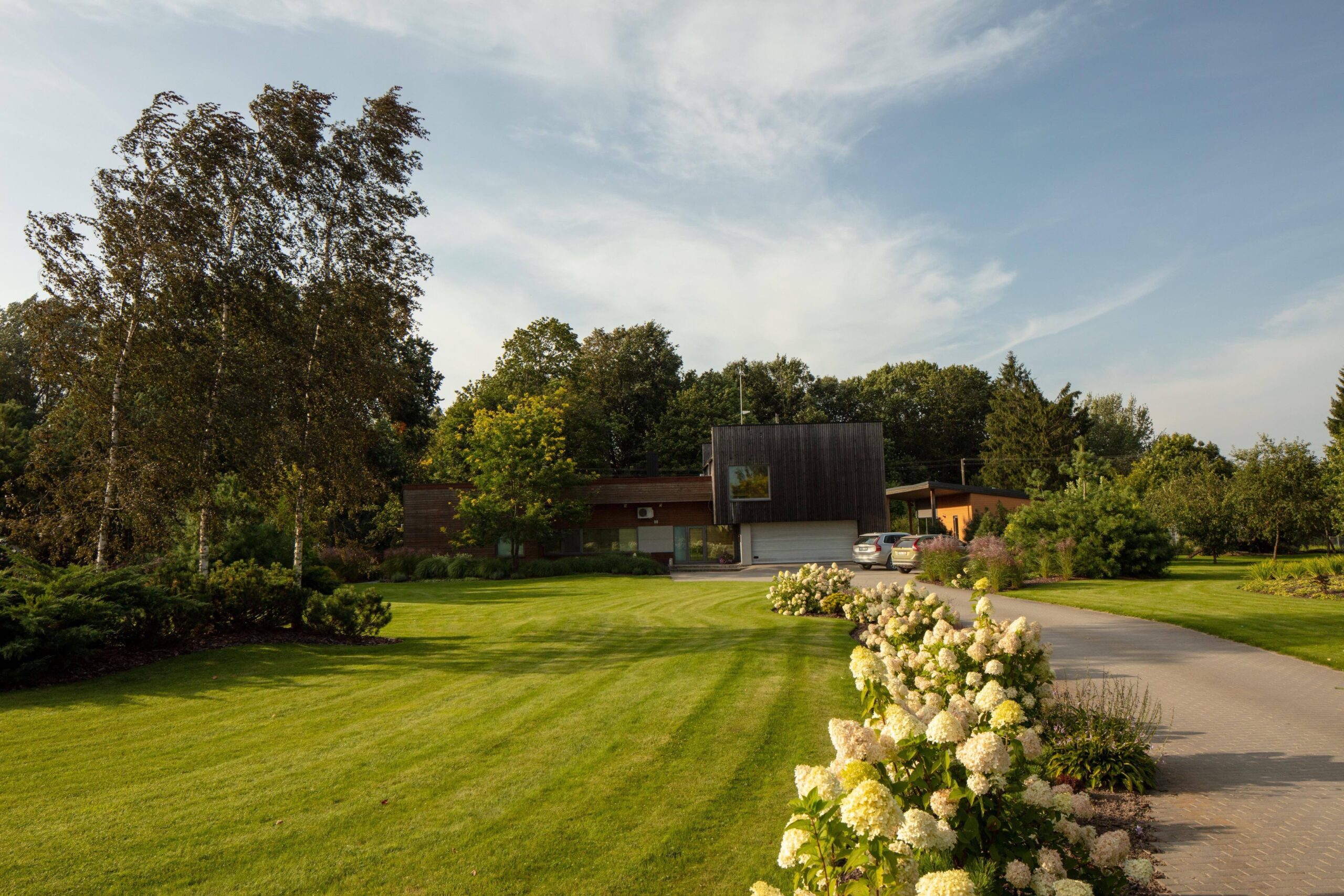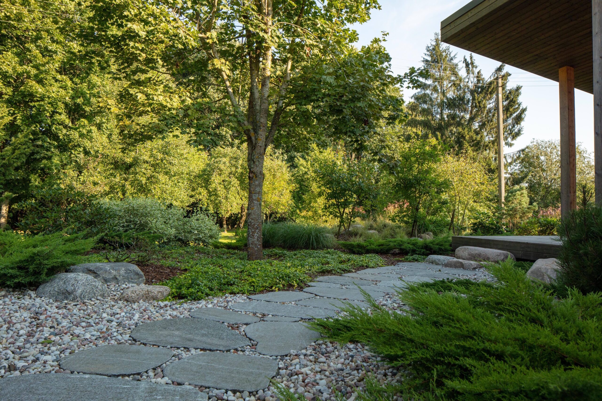 In the Šakiai district, at a farming family’s homestead, a landscape project was prepared where a personal family story, functional solutions, and aesthetic harmony intertwine. Across the large property, the designed spaces connect the main house, the guest area, the utility/farm zone, and the edge of the forest into one cohesive environment. The central idea of the project became the “family hill”—a mound planted with perennials whose blooming periods are linked to each family member’s birthday. This concept is complemented by themed “islands” that distill different functions: relaxation, socializing, privacy, and a connection with nature. Next to the main house, a terrace was planned and planted with airy, lightly structured herbaceous plants that soften the lines of the modern architecture. Nearby, among rhododendrons, miscanthus grasses, and natural stones, a fire-pit area was created. Here, function and aesthetics come together—large stones serve as seating and contrast with the soft silhouettes of the plants. On the southern side, a shaped honey locust tree was preserved, and behind it a hydrangea path is planned, leading toward the center of the homestead. In the northern part, a more enclosed yet bright terrace was designed, with a view of the forest. As evening falls, the setting is enhanced by thoughtfully planned lighting that highlights tree canopies and individual planting accents. The designed space is oriented around the rhythm of family life—spacious yet cozy, functional, and personal. Each family member has their own place, their own time—and their own bloom.