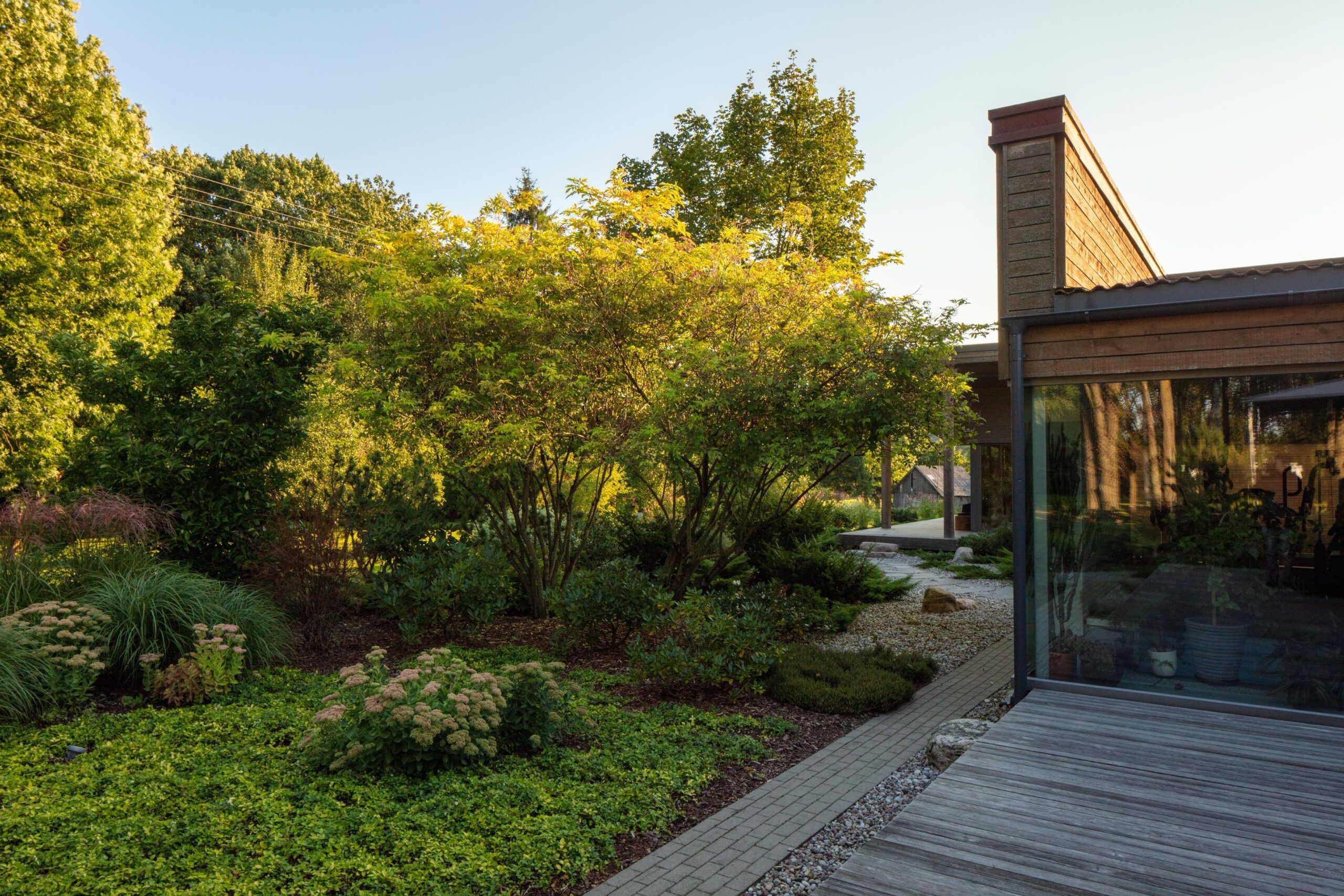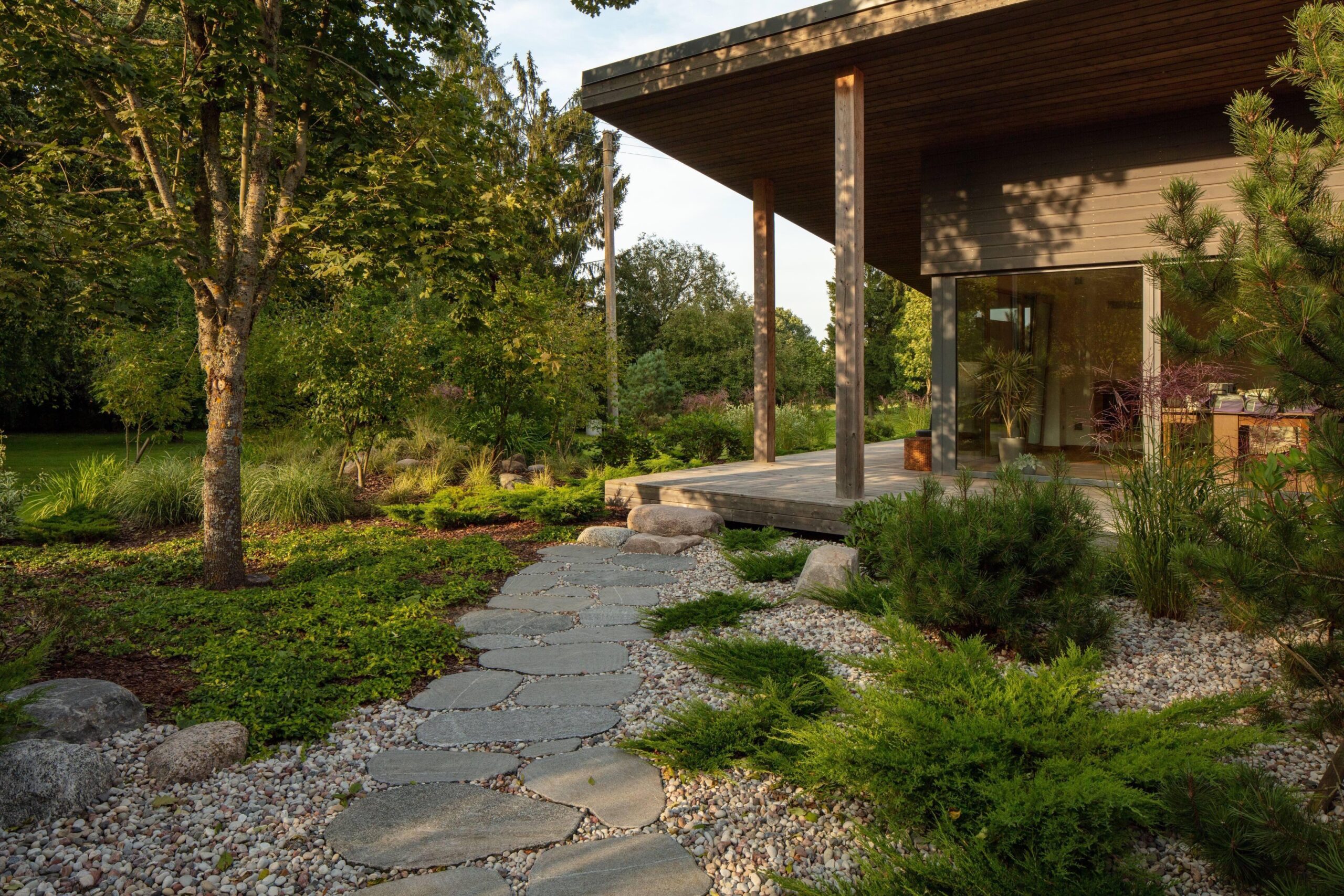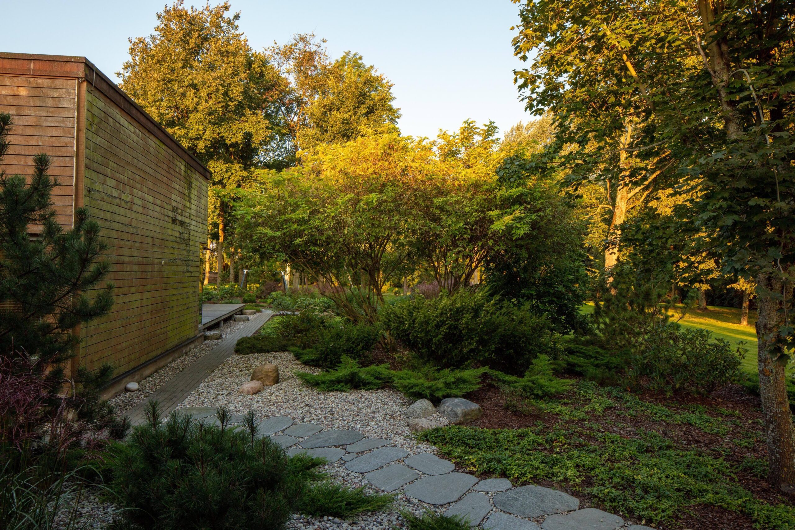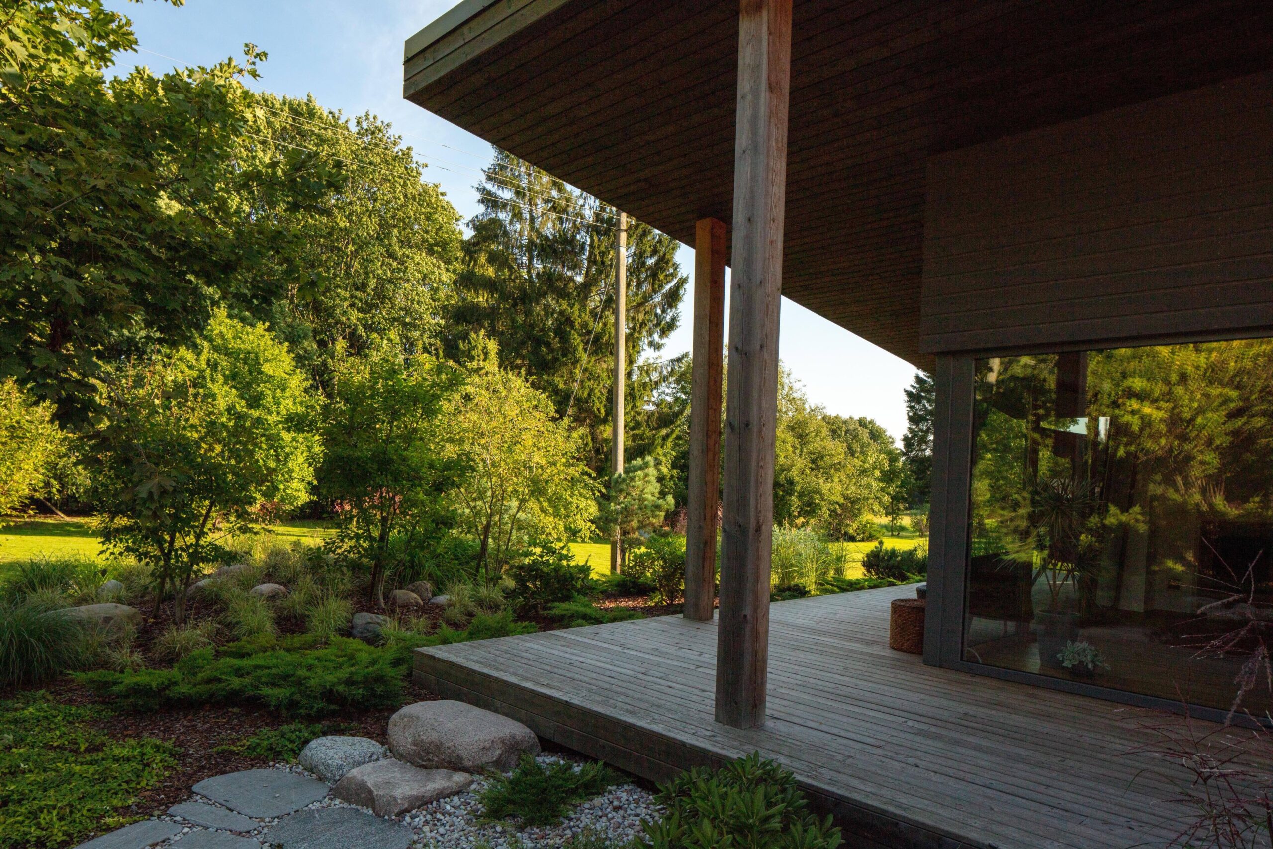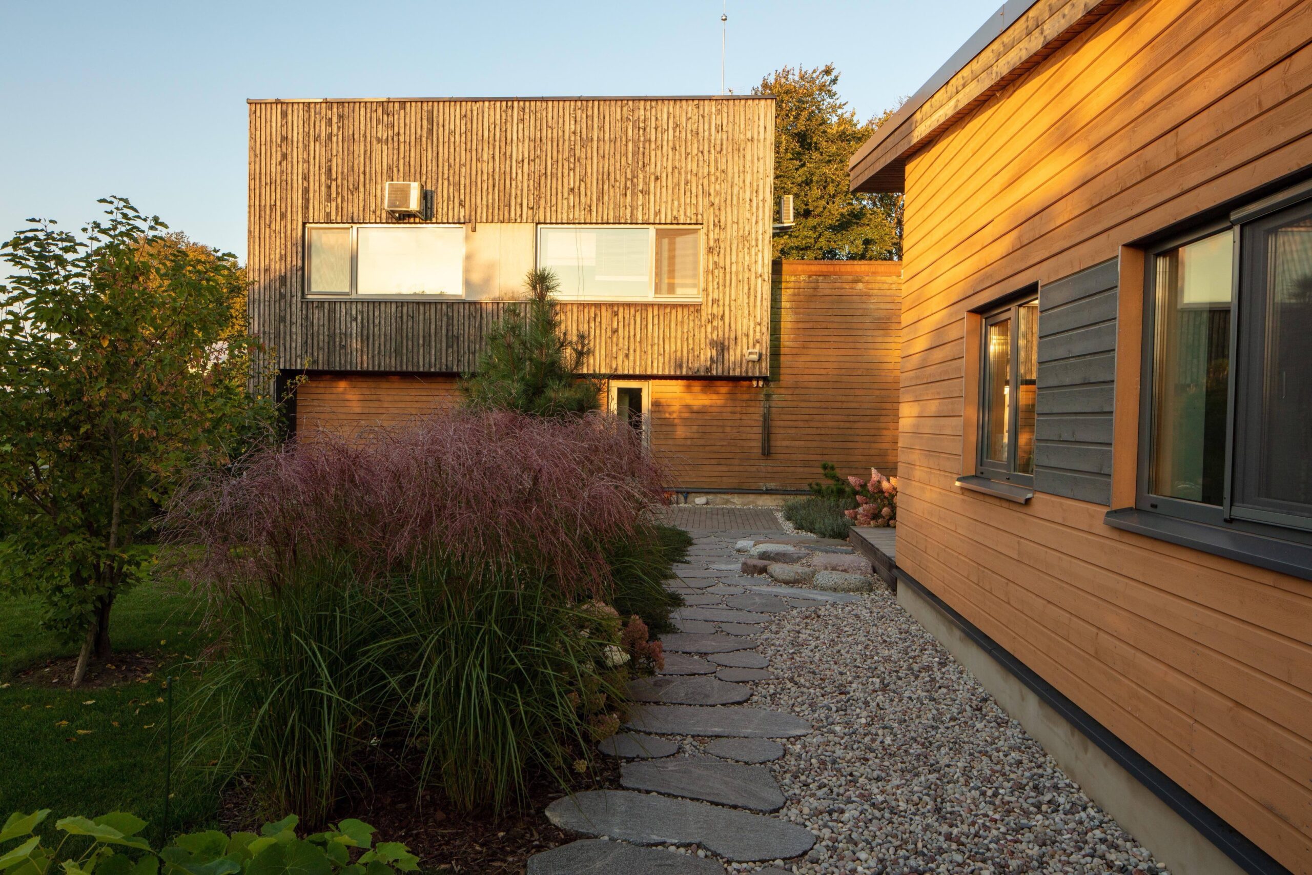 In the Šakiai district, at a farming family’s homestead, a landscape project was prepared where a personal family story, functional solutions, and aesthetic harmony intertwine. Across the large property, the designed spaces connect the main house, the guest area, the utility/farm zone, and the edge of the forest into one cohesive environment. The central idea of the project became the “family hill”—a mound planted with perennials whose blooming periods are linked to each family member’s birthday. This concept is complemented by themed “islands” that distill different functions: relaxation, socializing, privacy, and a connection with nature. Next to the main house, a terrace was planned and planted with airy, lightly structured herbaceous plants that soften the lines of the modern architecture. Nearby, among rhododendrons, miscanthus grasses, and natural stones, a fire-pit area was created. Here, function and aesthetics come together—large stones serve as seating and contrast with the soft silhouettes of the plants. On the southern side, a shaped honey locust tree was preserved, and behind it a hydrangea path is planned, leading toward the center of the homestead. In the northern part, a more enclosed yet bright terrace was designed, with a view of the forest. As evening falls, the setting is enhanced by thoughtfully planned lighting that highlights tree canopies and individual planting accents. The designed space is oriented around the rhythm of family life—spacious yet cozy, functional, and personal. Each family member has their own place, their own time—and their own bloom.