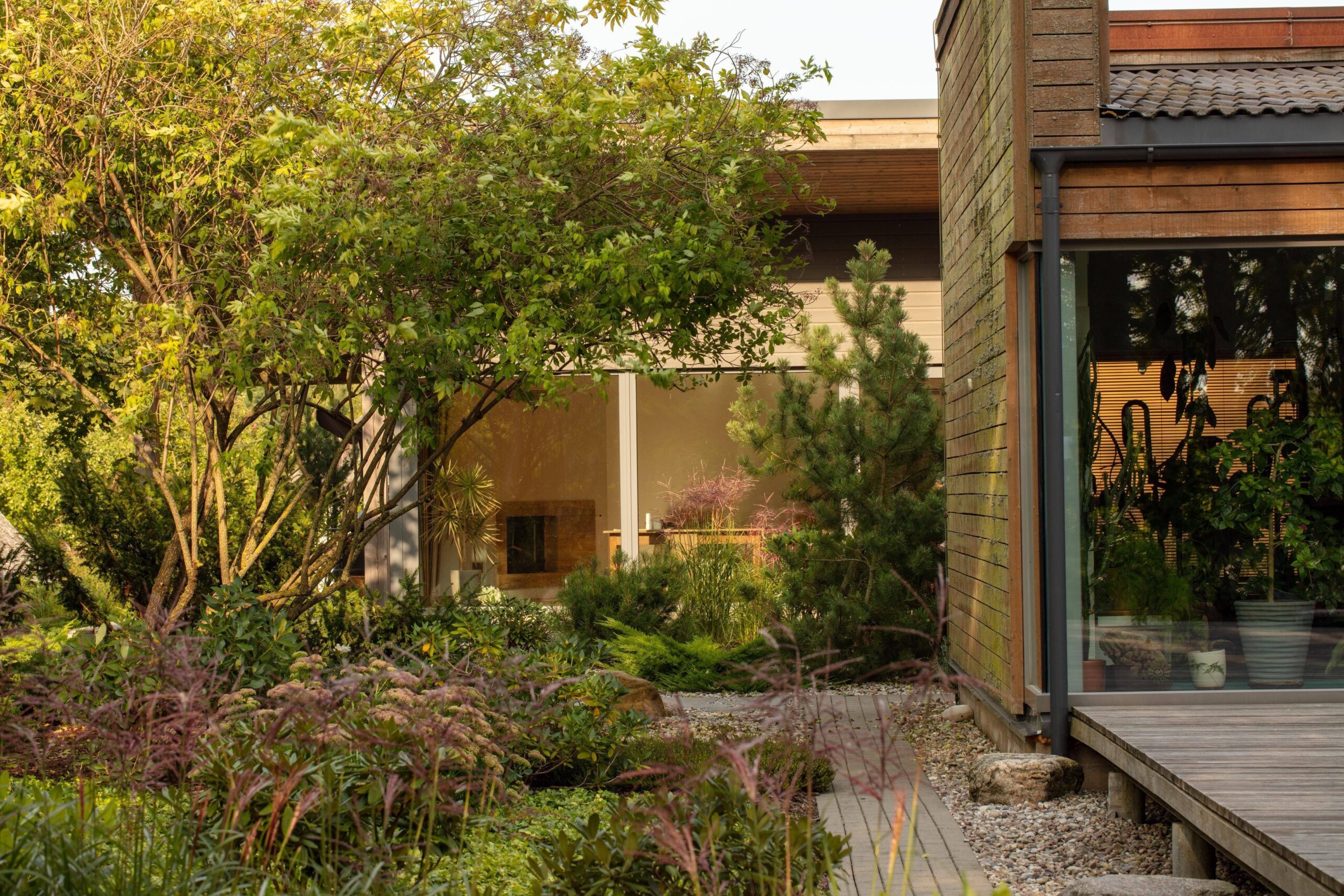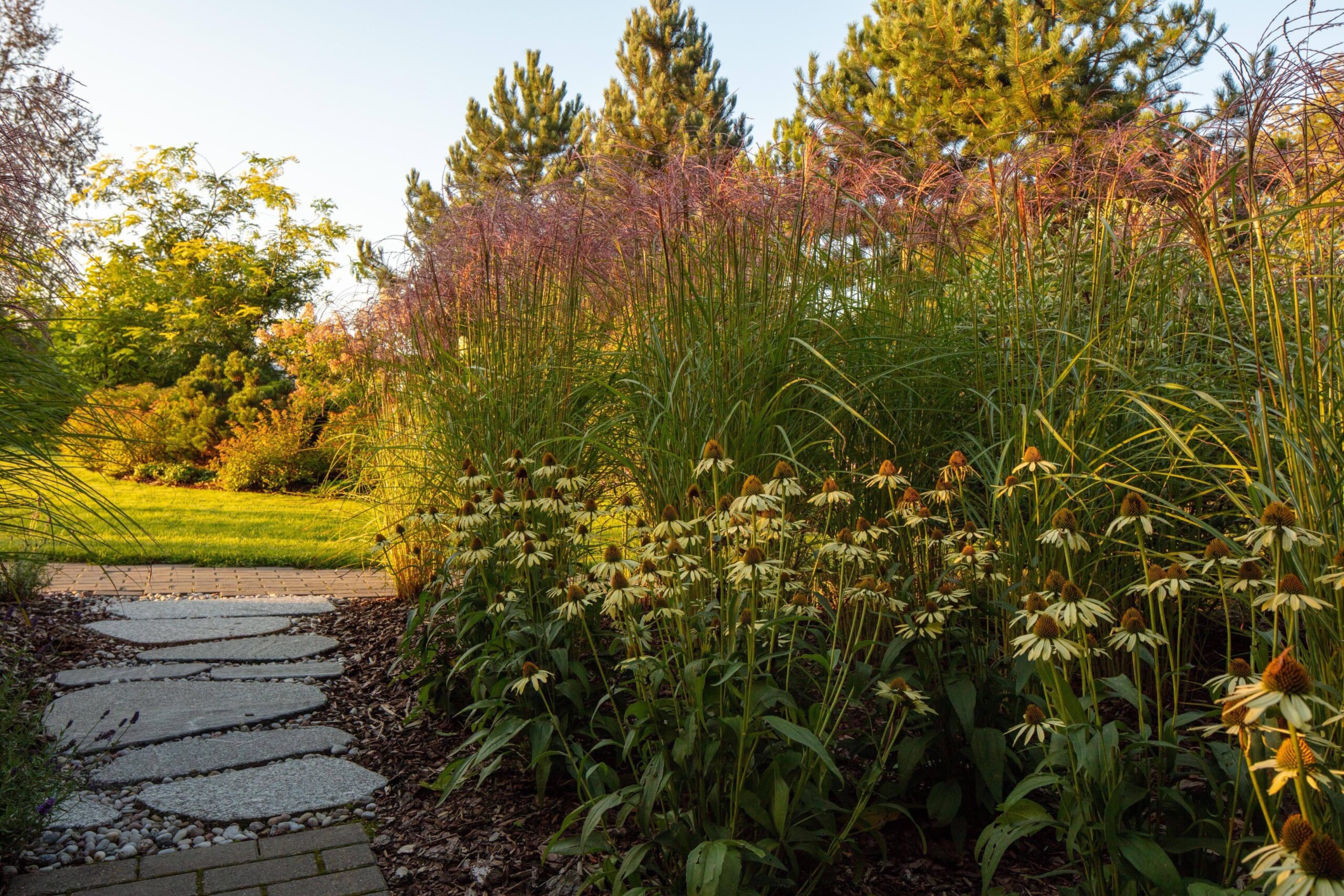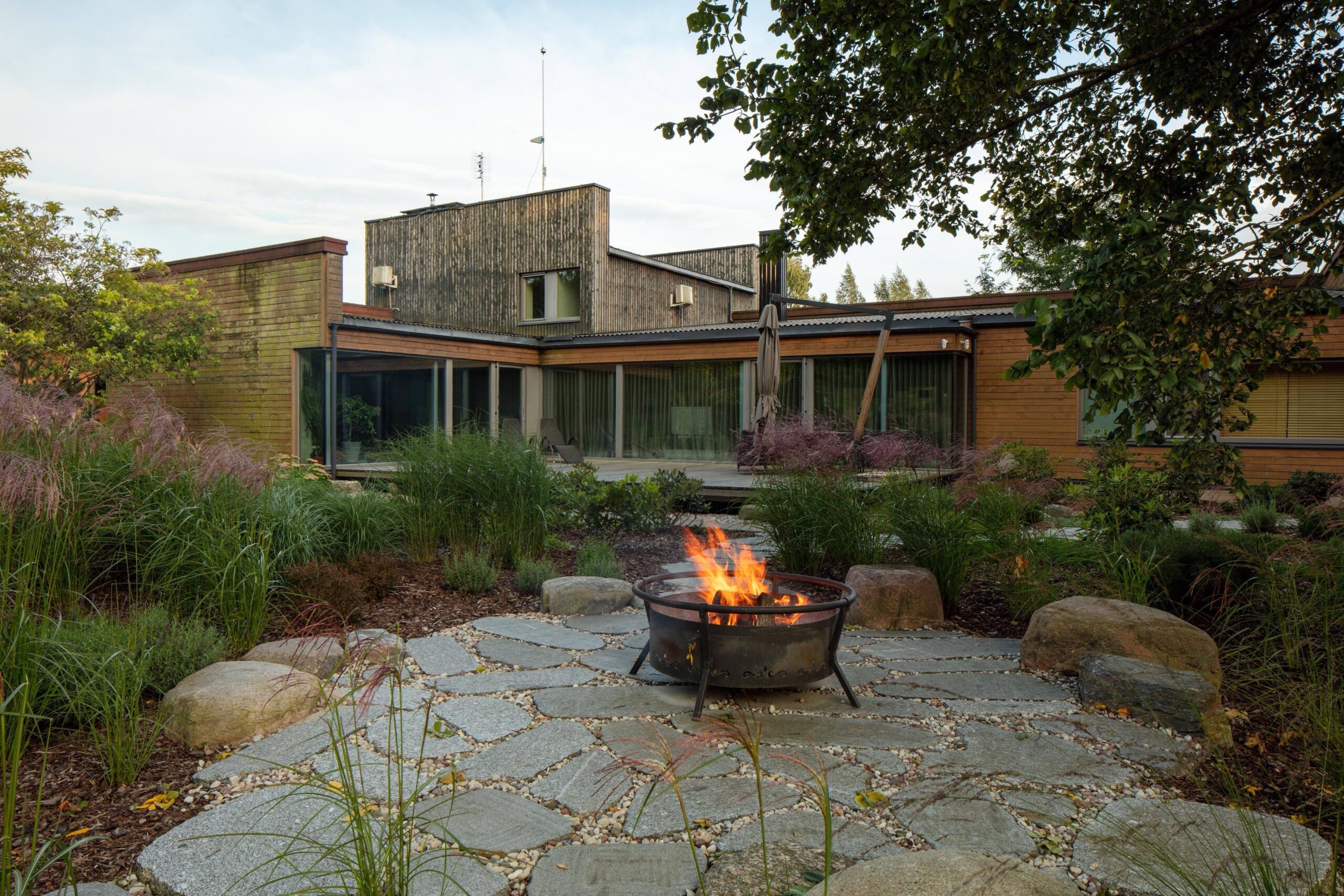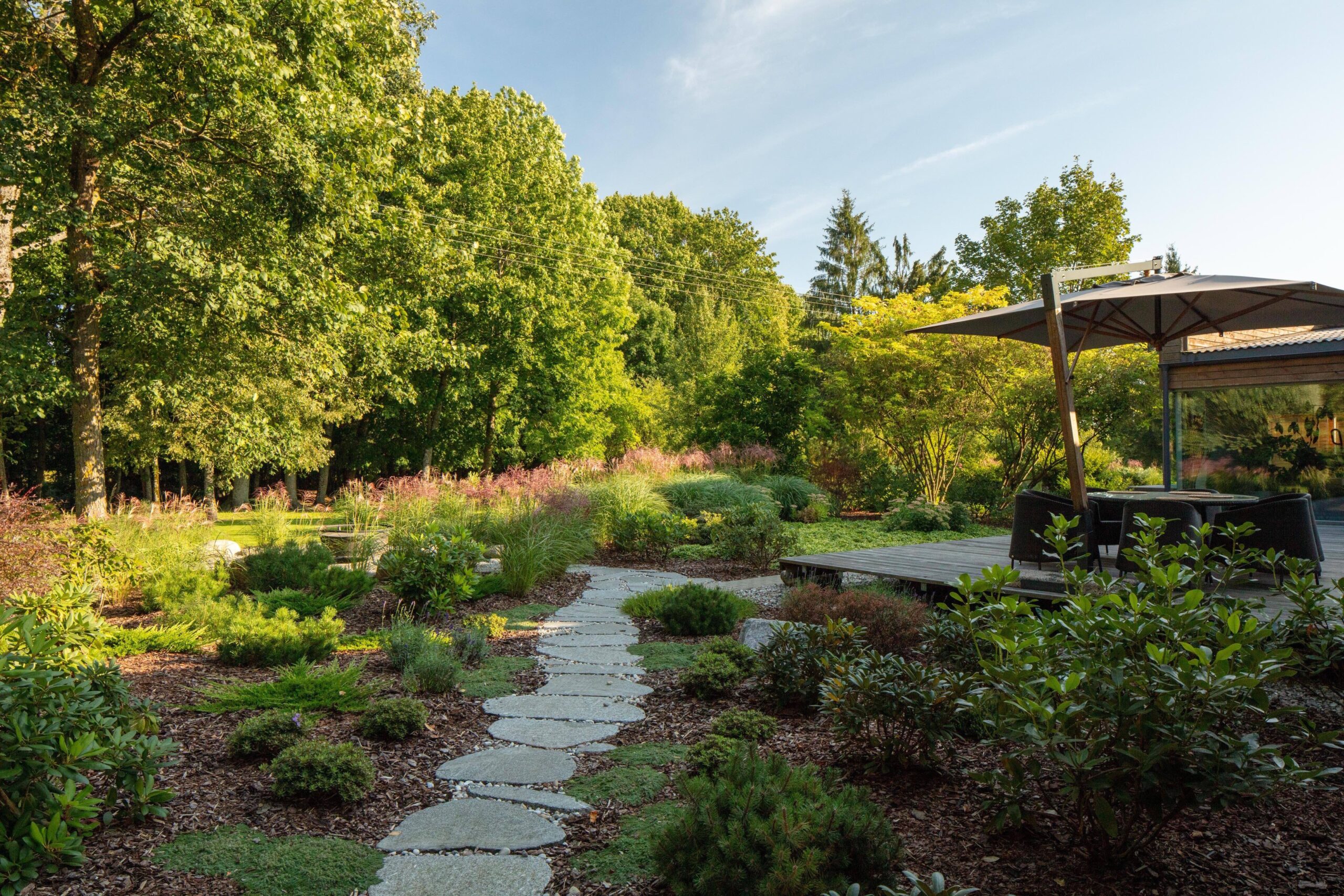 In the Šakiai district, at a farming family’s homestead, a landscape project was prepared where a personal family story, functional solutions, and aesthetic harmony intertwine. Across the large property, the designed spaces connect the main house, the guest area, the utility/farm zone, and the edge of the forest into one cohesive environment. The central idea of the project became the “family hill”—a mound planted with perennials whose blooming periods are linked to each family member’s birthday. This concept is complemented by themed “islands” that distill different functions: relaxation, socializing, privacy, and a connection with nature. Next to the main house, a terrace was planned and planted with airy, lightly structured herbaceous plants that soften the lines of the modern architecture. Nearby, among rhododendrons, miscanthus grasses, and natural stones, a fire-pit area was created. Here, function and aesthetics come together—large stones serve as seating and contrast with the soft silhouettes of the plants. On the southern side, a shaped honey locust tree was preserved, and behind it a hydrangea path is planned, leading toward the center of the homestead. In the northern part, a more enclosed yet bright terrace was designed, with a view of the forest. As evening falls, the setting is enhanced by thoughtfully planned lighting that highlights tree canopies and individual planting accents. The designed space is oriented around the rhythm of family life—spacious yet cozy, functional, and personal. Each family member has their own place, their own time—and their own bloom.
