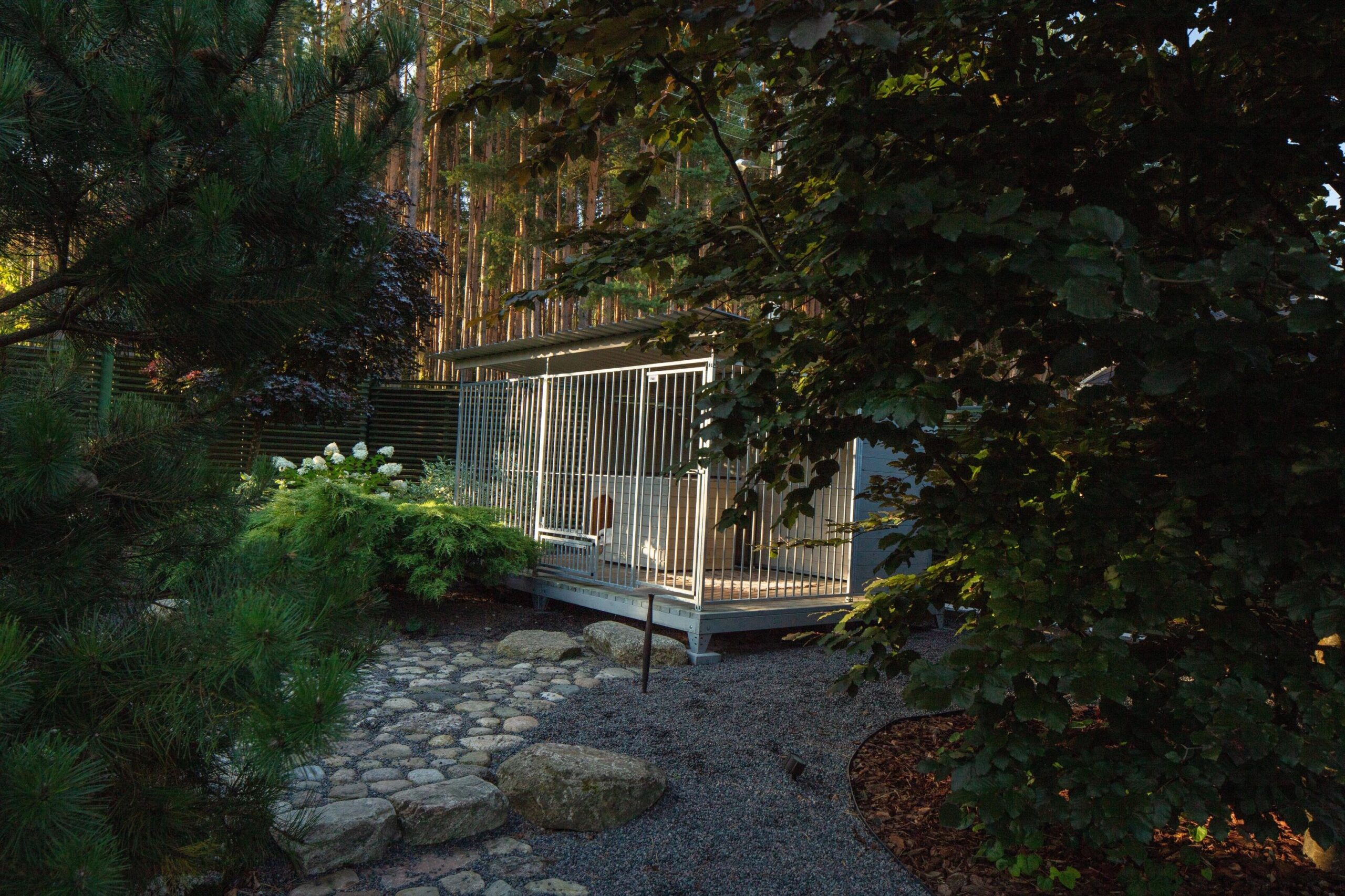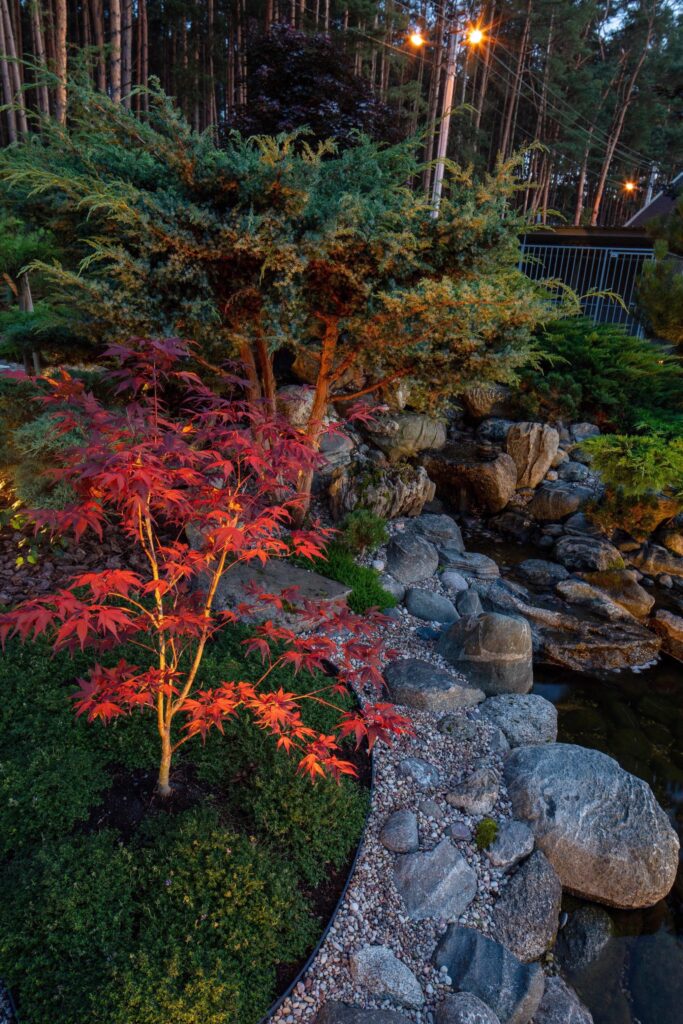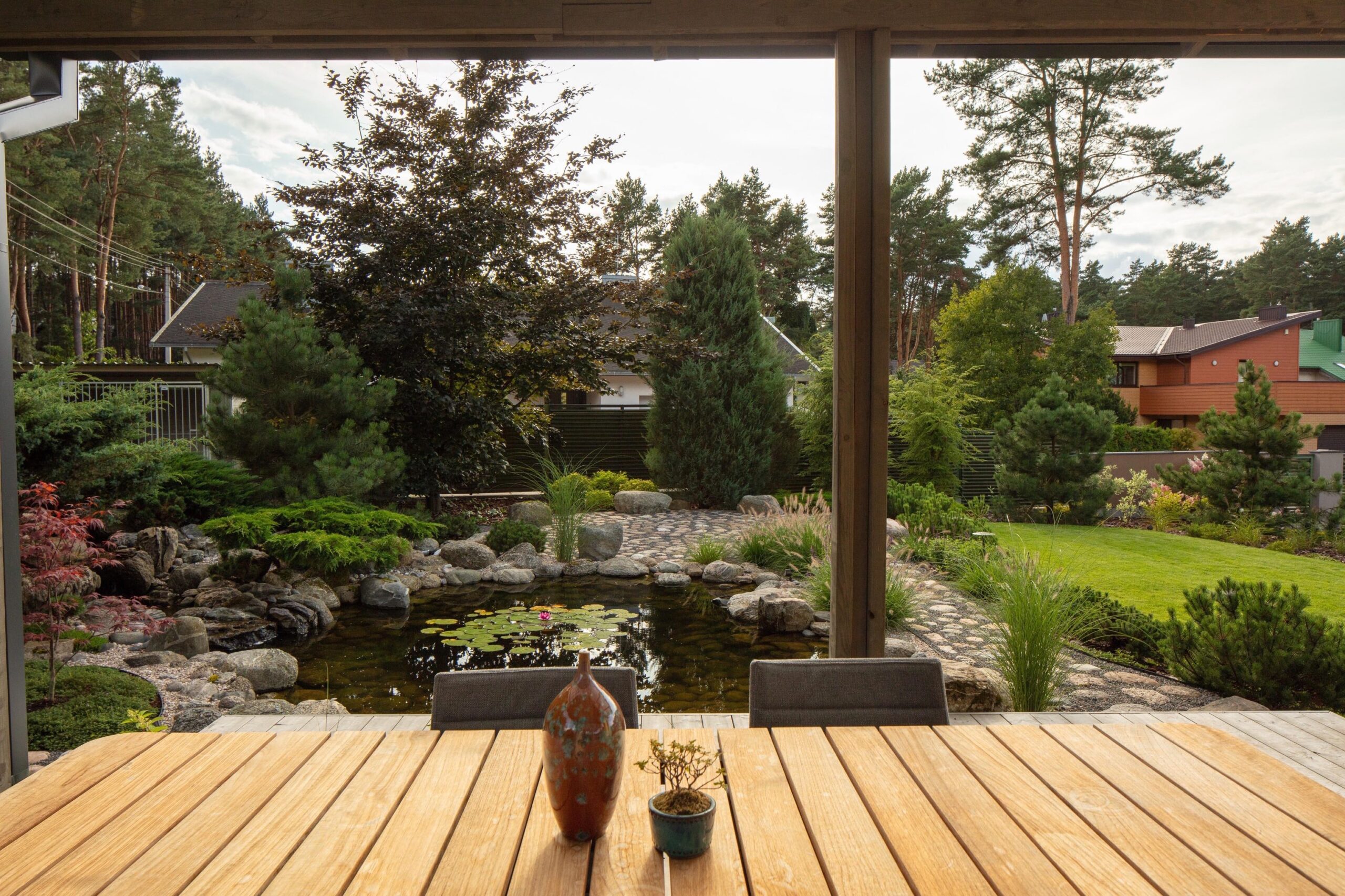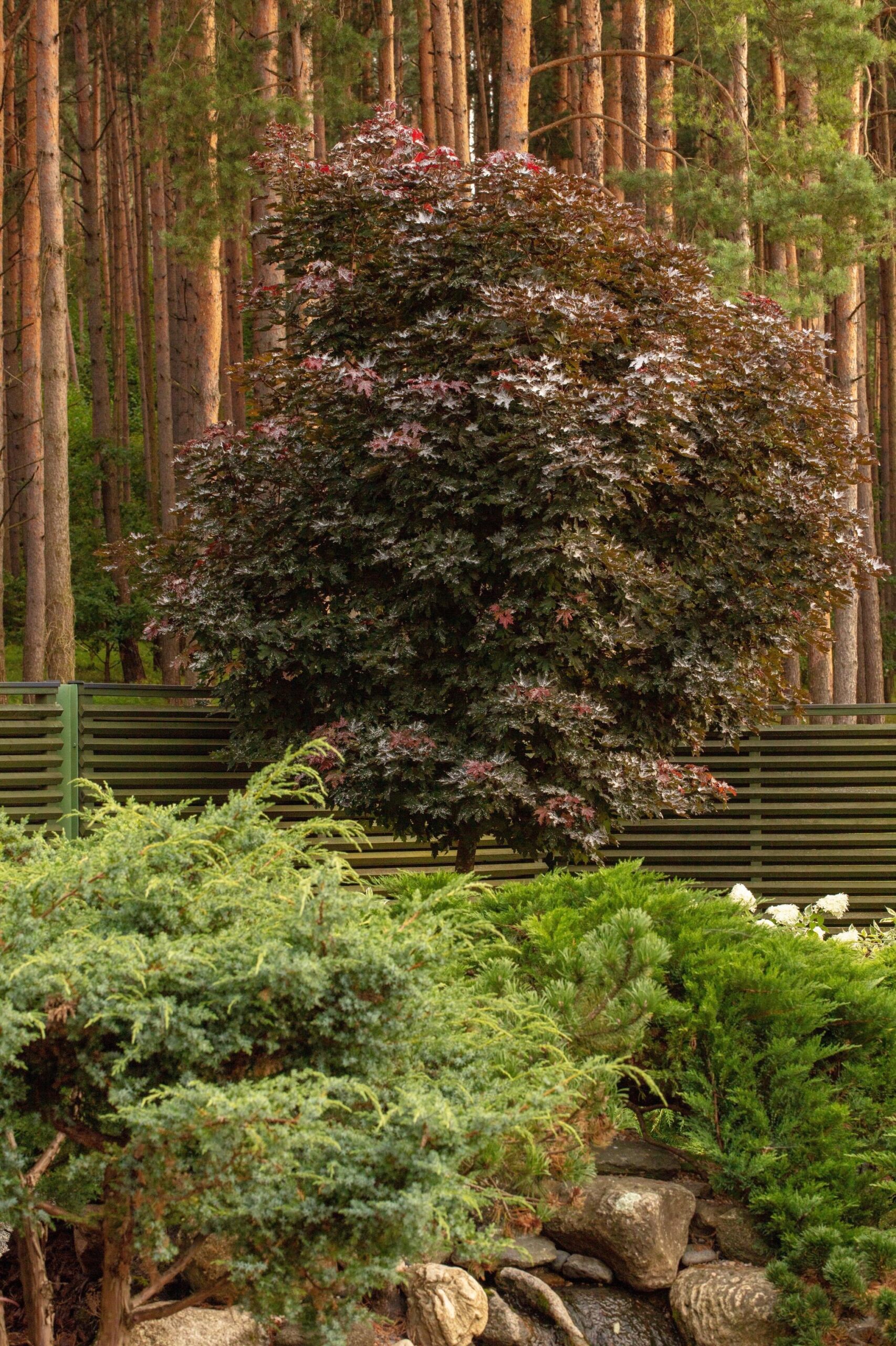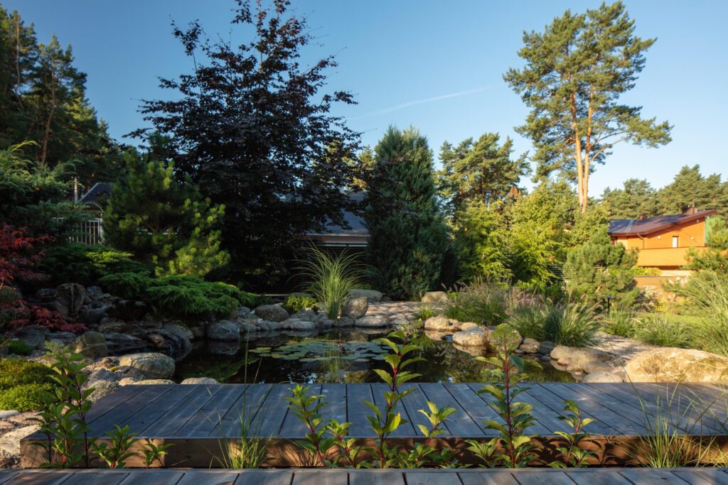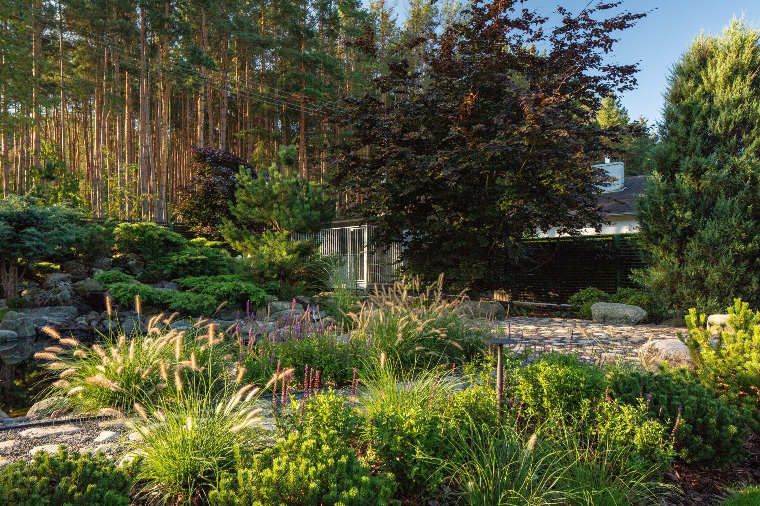 Implemented beside a stunning pine forest, this project clearly reflects our ability to create exceptional value for clients. The main task was to develop solutions that would allow the whole family to spend time safely and privately on the brighter, front-facing side of the house, which previously had been used only for representation. Plantings of black pines and Canadian hemlocks, complemented by variegated dogwoods, not only provide privacy from the street but also create a cozy space separated from the surroundings. This allowed the family to comfortably use both the fire-pit area and the lawn. Surrounded by the pine forest, the terrace with evening lighting naturally invites time outdoors. The complex site design also expanded the water feature with a spring, linking the wooden terrace and the fire pit into a unified, harmonious environment. Stone paths add playfulness while ensuring convenient movement and easier plant maintenance. A large dog enclosure blends organically into the landscape and remains visually unobtrusive. A Norway maple, which became the central horizon axis, complements the water feature and introduces a new color direction. As autumn approaches, the entire landscape gradually changes color, keeping the space dynamic and engaging. Wind-swayed ornamental grasses lend the setting a sense of fluidity, while contrasting, precisely composed stones bring naturalness, solidity, and stability.