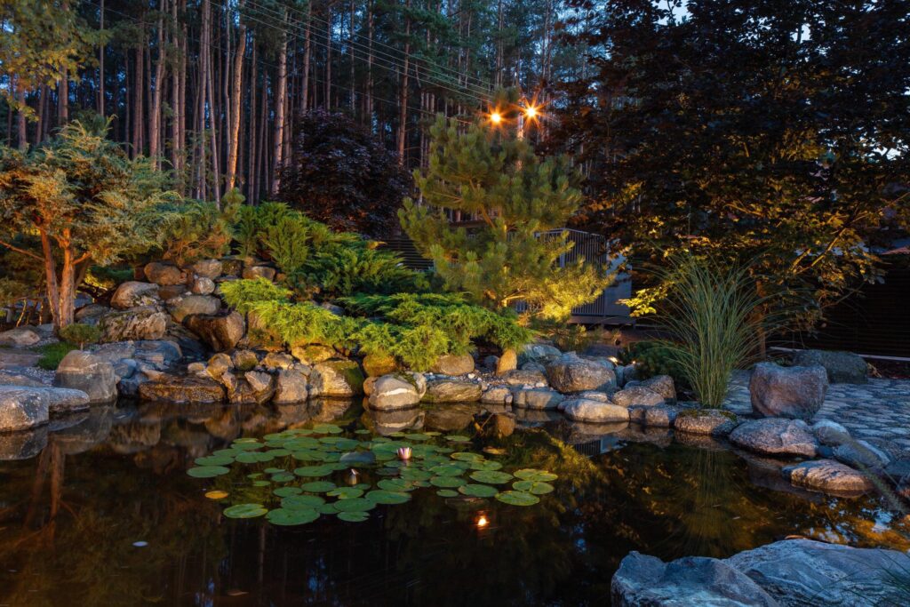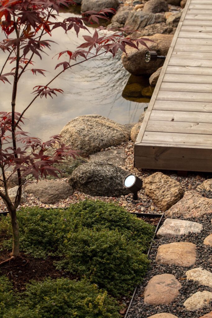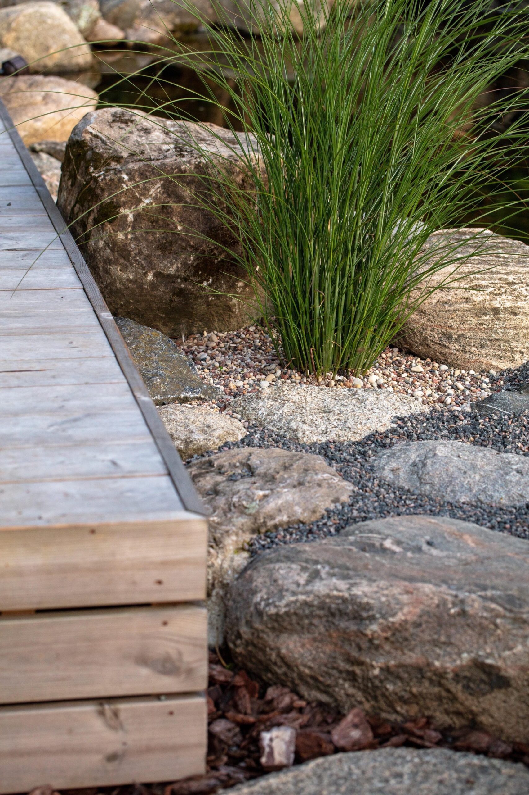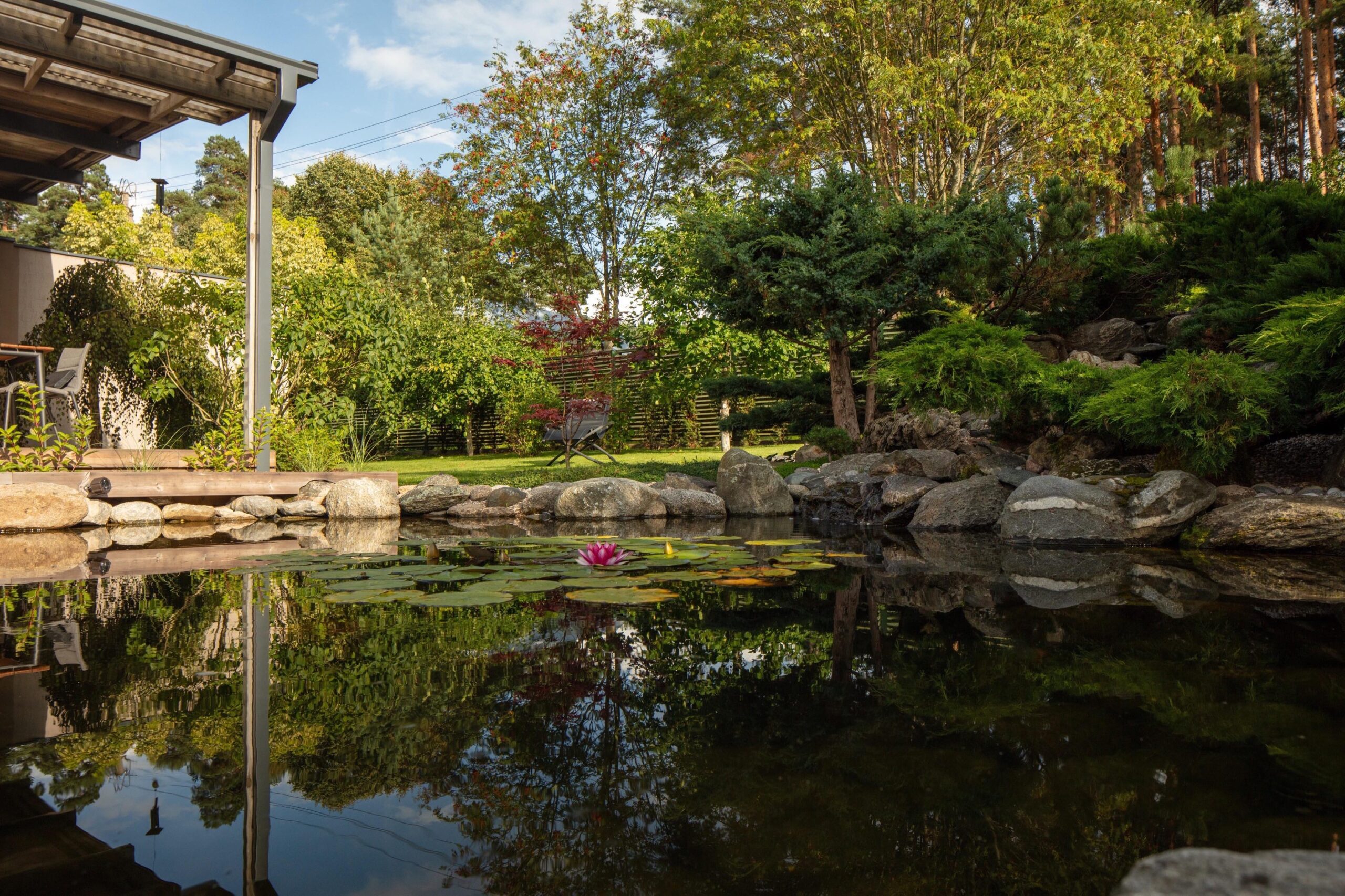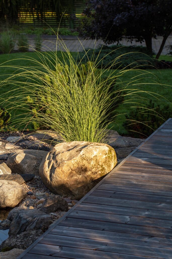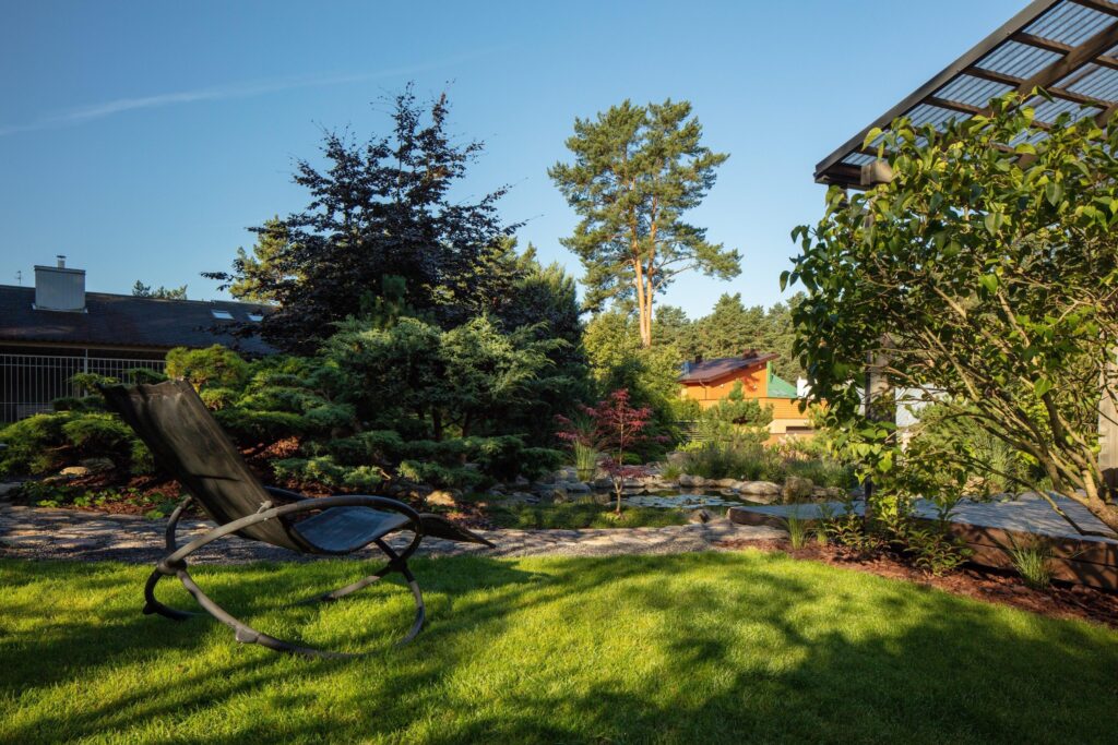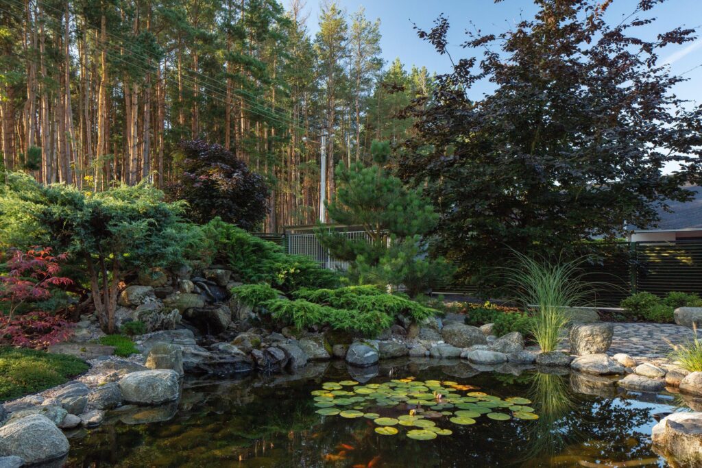 Implemented beside a stunning pine forest, this project clearly reflects our ability to create exceptional value for clients. The main task was to develop solutions that would allow the whole family to spend time safely and privately on the brighter, front-facing side of the house, which previously had been used only for representation. Plantings of black pines and Canadian hemlocks, complemented by variegated dogwoods, not only provide privacy from the street but also create a cozy space separated from the surroundings. This allowed the family to comfortably use both the fire-pit area and the lawn. Surrounded by the pine forest, the terrace with evening lighting naturally invites time outdoors. The complex site design also expanded the water feature with a spring, linking the wooden terrace and the fire pit into a unified, harmonious environment. Stone paths add playfulness while ensuring convenient movement and easier plant maintenance. A large dog enclosure blends organically into the landscape and remains visually unobtrusive. A Norway maple, which became the central horizon axis, complements the water feature and introduces a new color direction. As autumn approaches, the entire landscape gradually changes color, keeping the space dynamic and engaging. Wind-swayed ornamental grasses lend the setting a sense of fluidity, while contrasting, precisely composed stones bring naturalness, solidity, and stability.