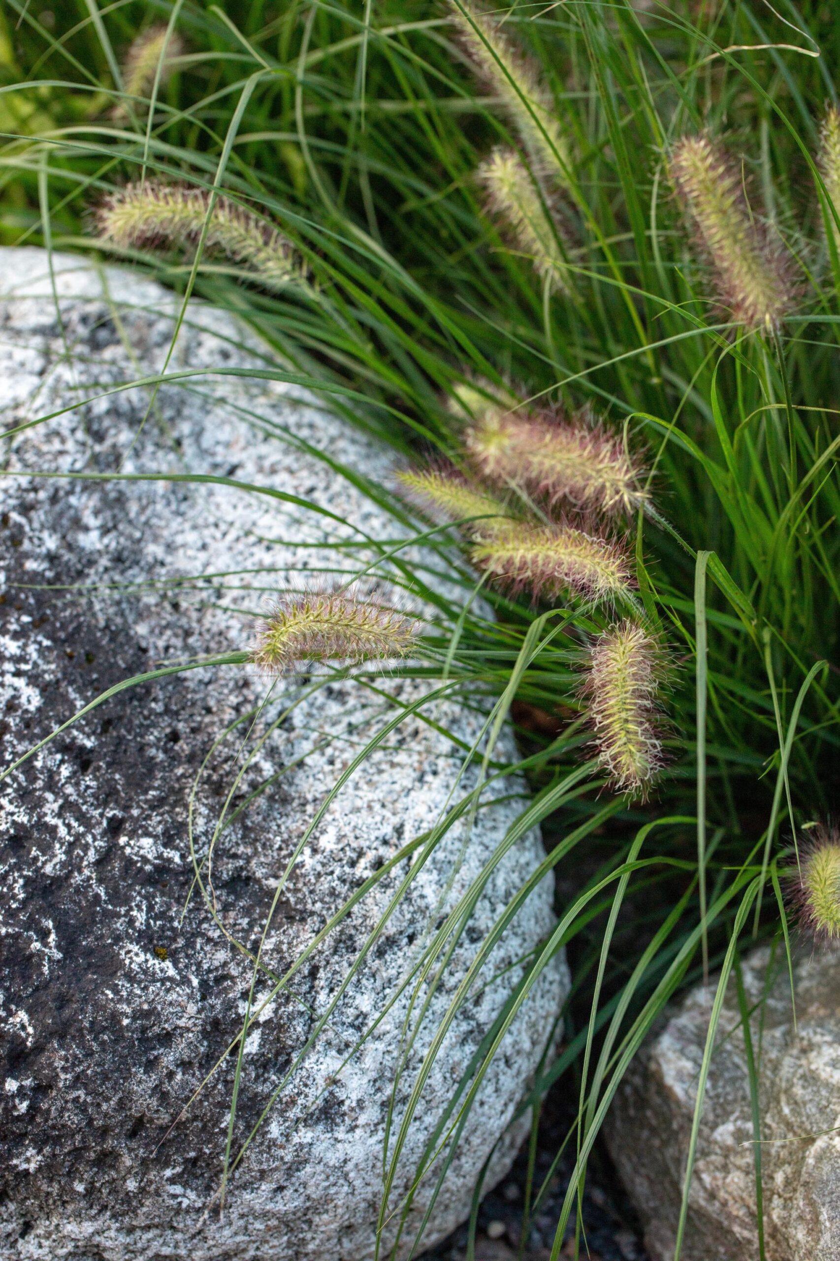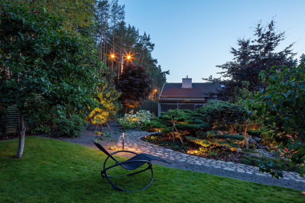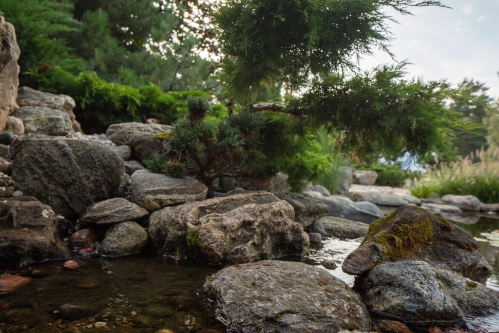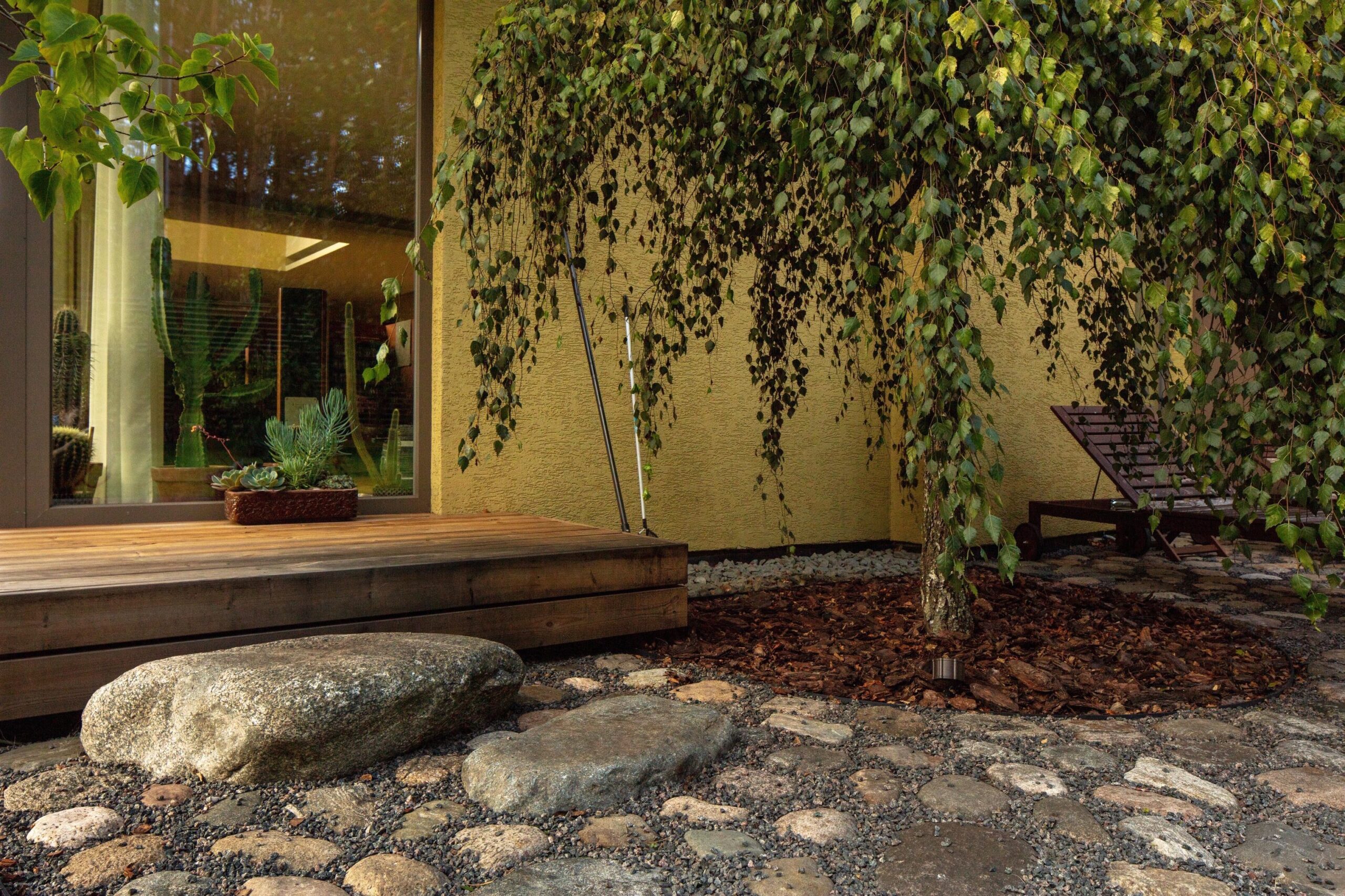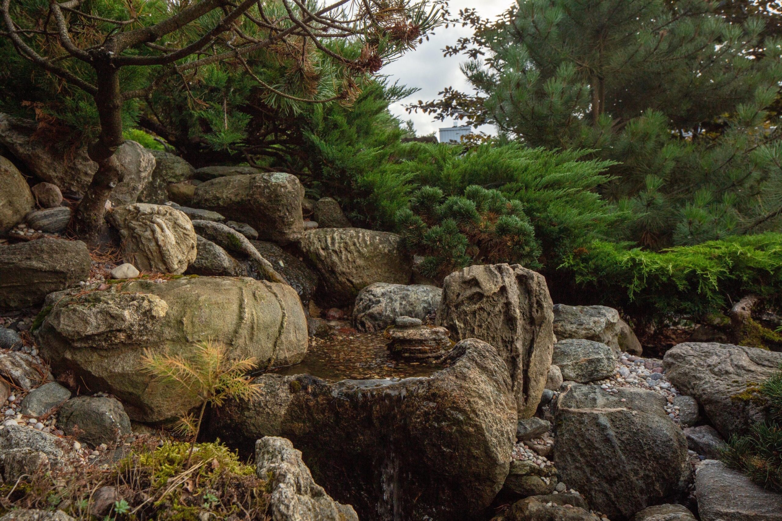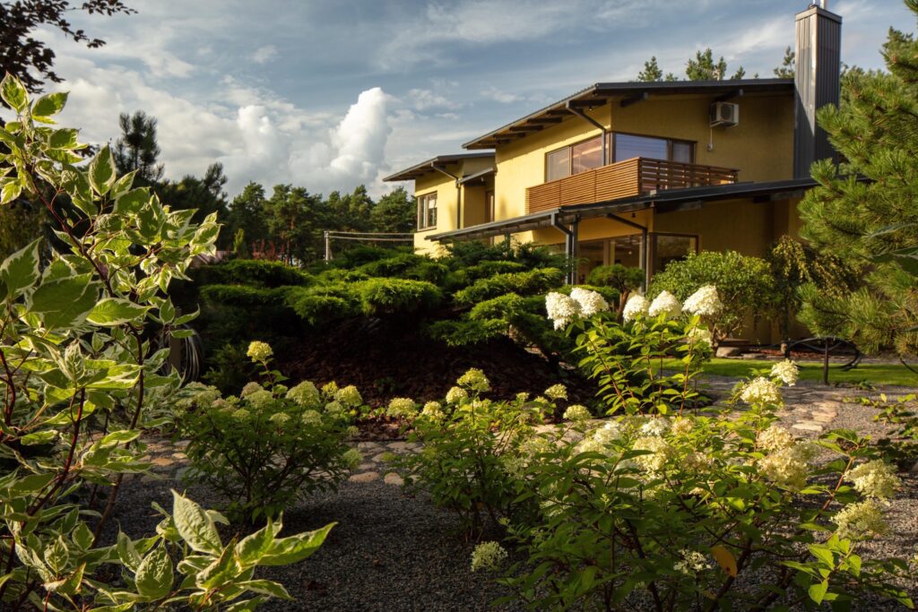 Implemented beside a stunning pine forest, this project clearly reflects our ability to create exceptional value for clients. The main task was to develop solutions that would allow the whole family to spend time safely and privately on the brighter, front-facing side of the house, which previously had been used only for representation. Plantings of black pines and Canadian hemlocks, complemented by variegated dogwoods, not only provide privacy from the street but also create a cozy space separated from the surroundings. This allowed the family to comfortably use both the fire-pit area and the lawn. Surrounded by the pine forest, the terrace with evening lighting naturally invites time outdoors. The complex site design also expanded the water feature with a spring, linking the wooden terrace and the fire pit into a unified, harmonious environment. Stone paths add playfulness while ensuring convenient movement and easier plant maintenance. A large dog enclosure blends organically into the landscape and remains visually unobtrusive. A Norway maple, which became the central horizon axis, complements the water feature and introduces a new color direction. As autumn approaches, the entire landscape gradually changes color, keeping the space dynamic and engaging. Wind-swayed ornamental grasses lend the setting a sense of fluidity, while contrasting, precisely composed stones bring naturalness, solidity, and stability.