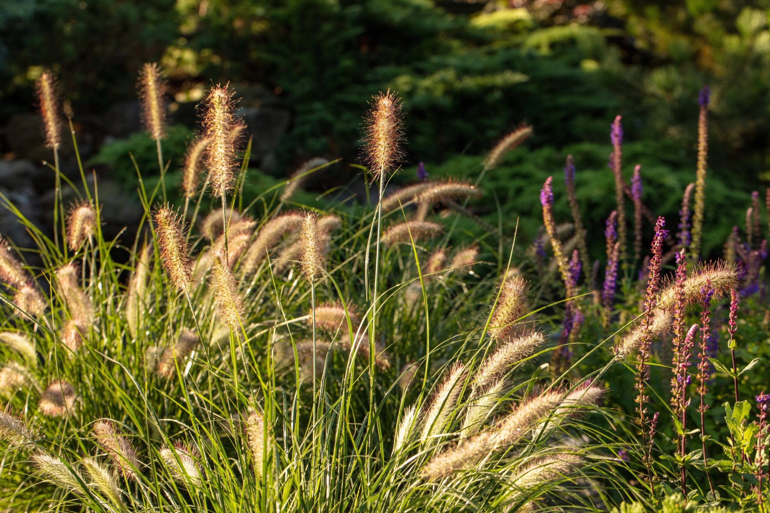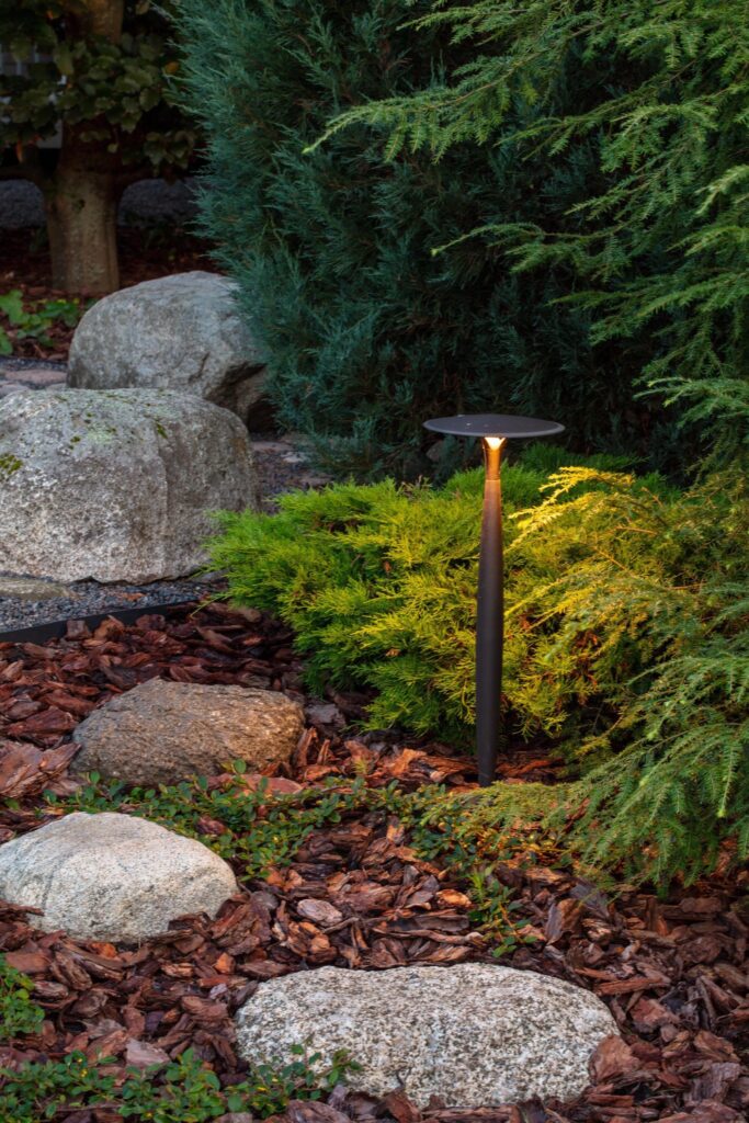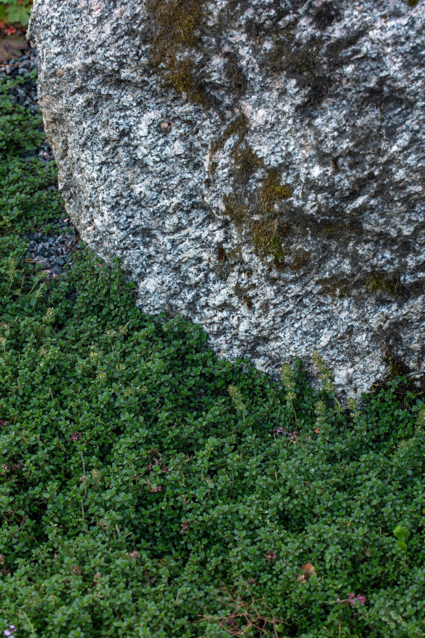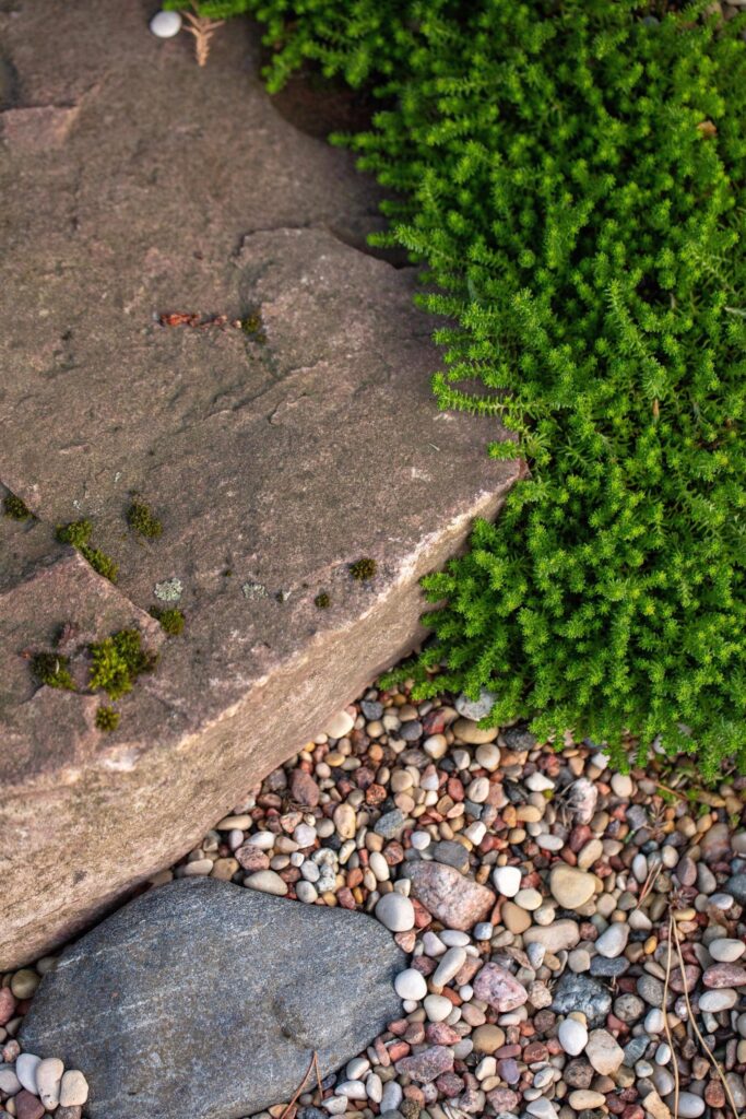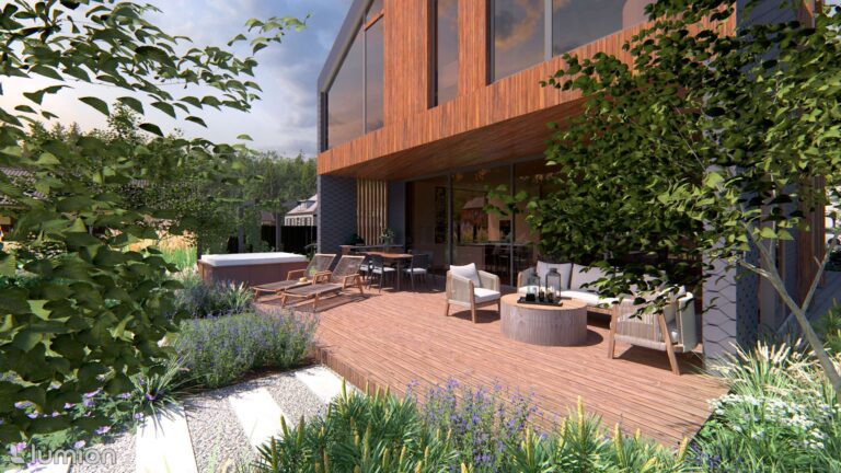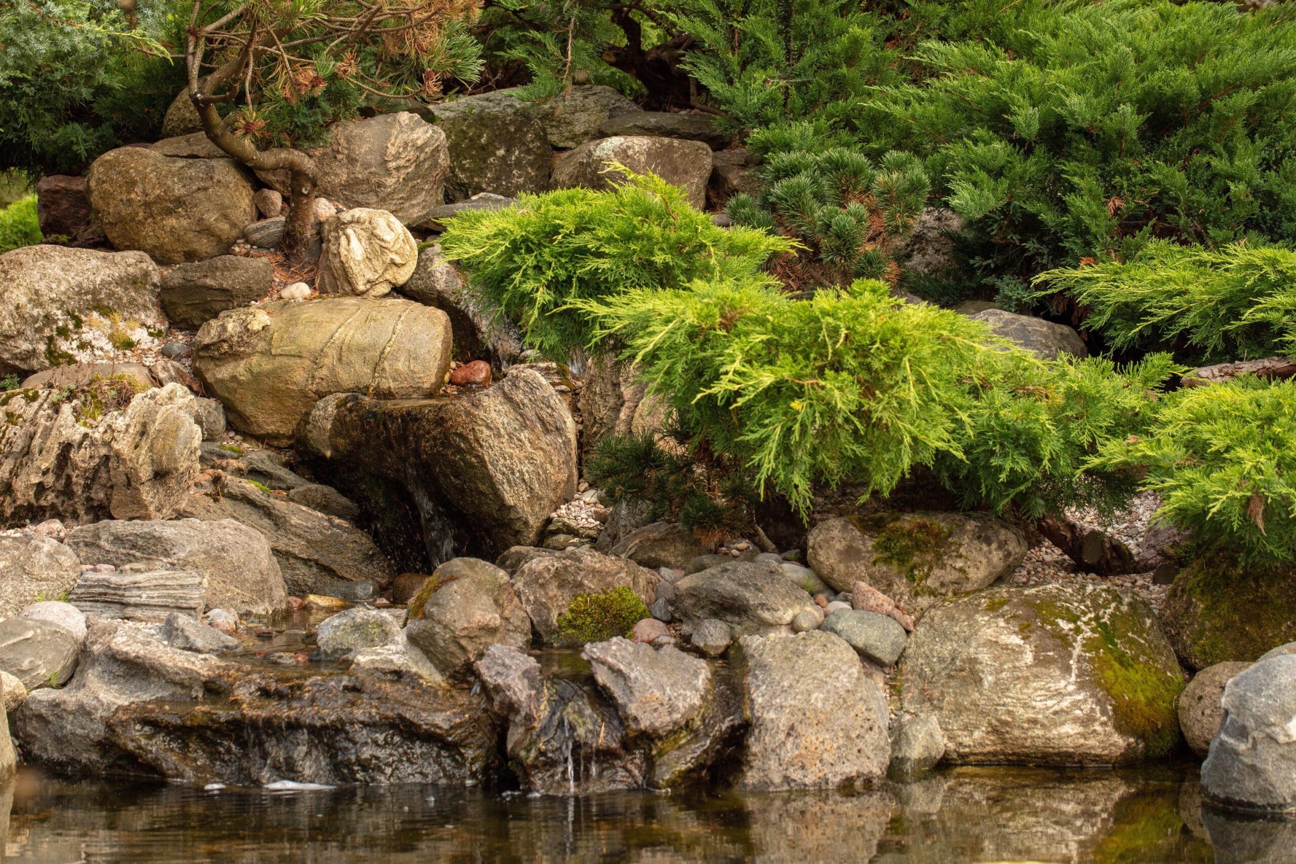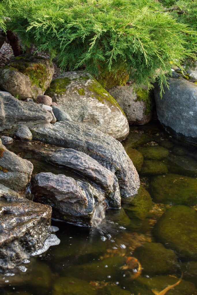 Implemented beside a stunning pine forest, this project clearly reflects our ability to create exceptional value for clients. The main task was to develop solutions that would allow the whole family to spend time safely and privately on the brighter, front-facing side of the house, which previously had been used only for representation. Plantings of black pines and Canadian hemlocks, complemented by variegated dogwoods, not only provide privacy from the street but also create a cozy space separated from the surroundings. This allowed the family to comfortably use both the fire-pit area and the lawn. Surrounded by the pine forest, the terrace with evening lighting naturally invites time outdoors. The complex site design also expanded the water feature with a spring, linking the wooden terrace and the fire pit into a unified, harmonious environment. Stone paths add playfulness while ensuring convenient movement and easier plant maintenance. A large dog enclosure blends organically into the landscape and remains visually unobtrusive. A Norway maple, which became the central horizon axis, complements the water feature and introduces a new color direction. As autumn approaches, the entire landscape gradually changes color, keeping the space dynamic and engaging. Wind-swayed ornamental grasses lend the setting a sense of fluidity, while contrasting, precisely composed stones bring naturalness, solidity, and stability.