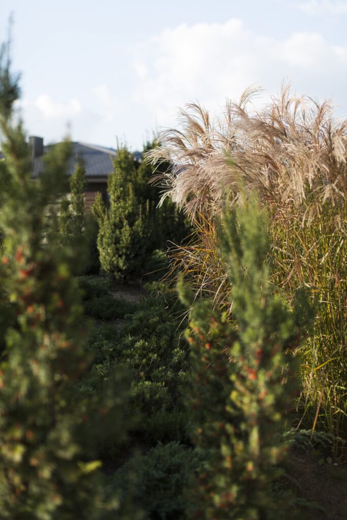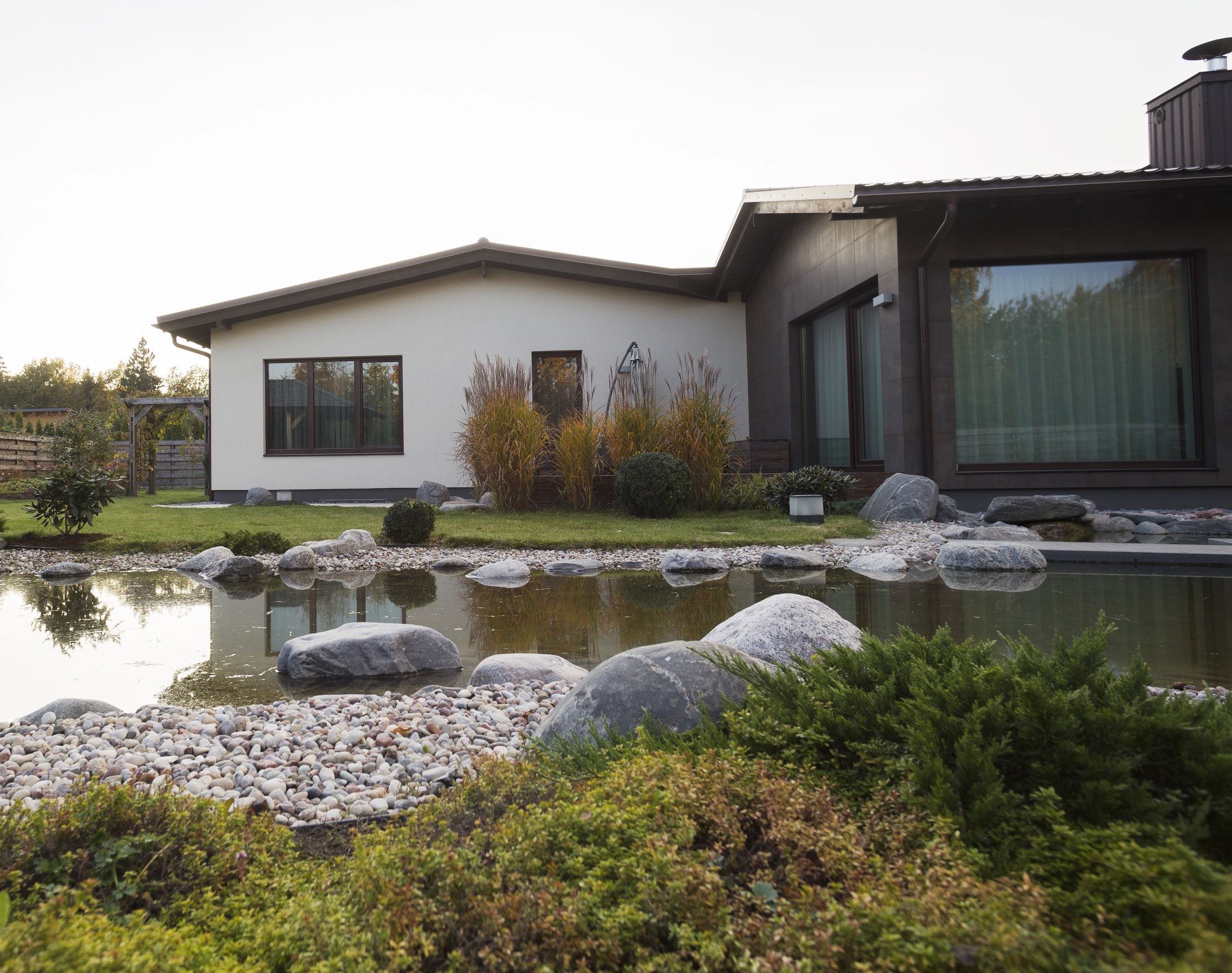 In designing the setting, principles of an Eastern garden were combined with contemporary planting solutions. A shallow water feature running through the entire yard was planned as the main spatial element, naturally dividing the site into two parts. One part is intended for movement and more active activities; the other is for quieter relaxation, with a planned terrace, canopy, and a bench by the water.