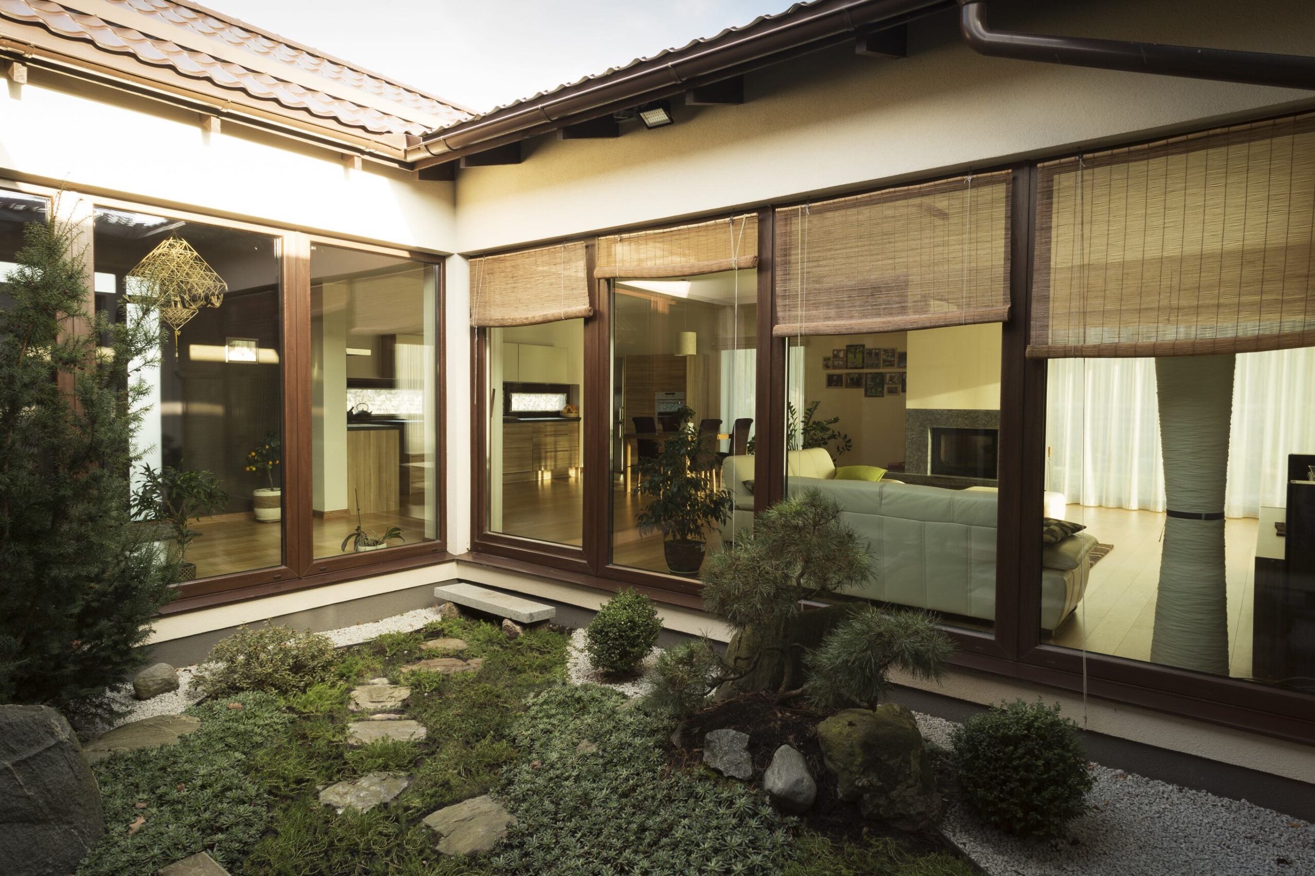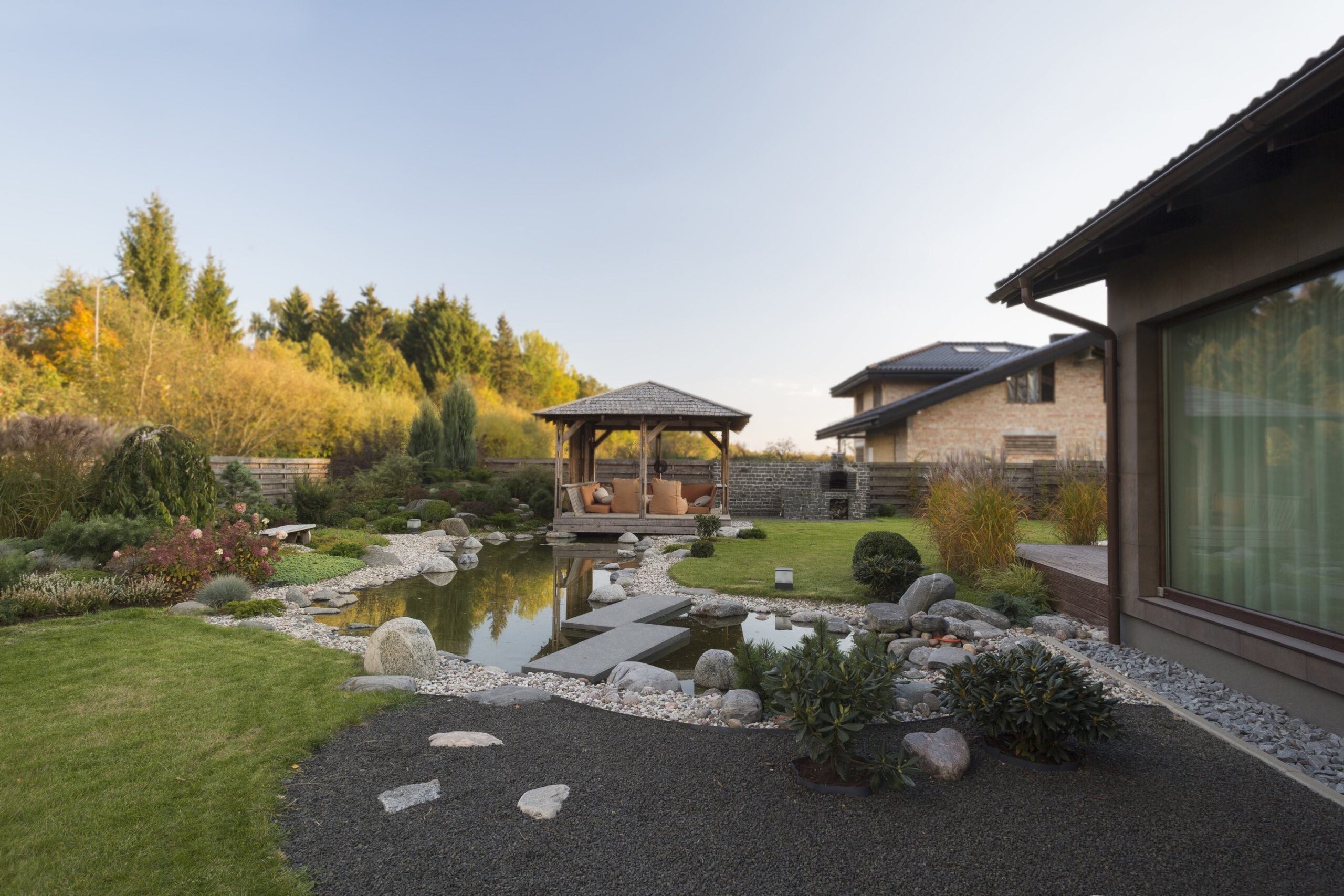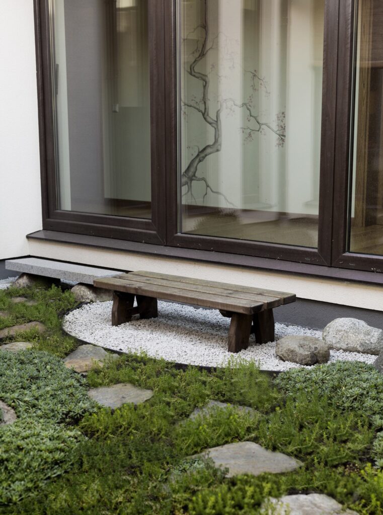 A rock garden installed in the yard—visible both from the terrace and through the bedroom window—complements the overall landscape composition. The entire area is richly filled with natural elements: stone steps, a dark crushed-stone path, and a water spring emerging from a massive boulder.
