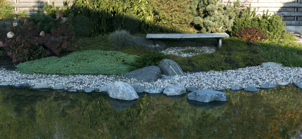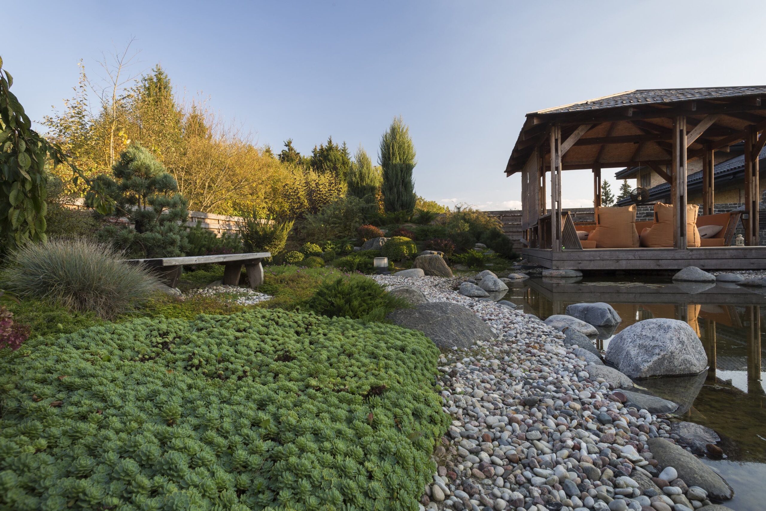 The gravel-and-moss garden is enriched with shade-loving plants, while pines and junipers give the yard structure and vitality throughout the year.