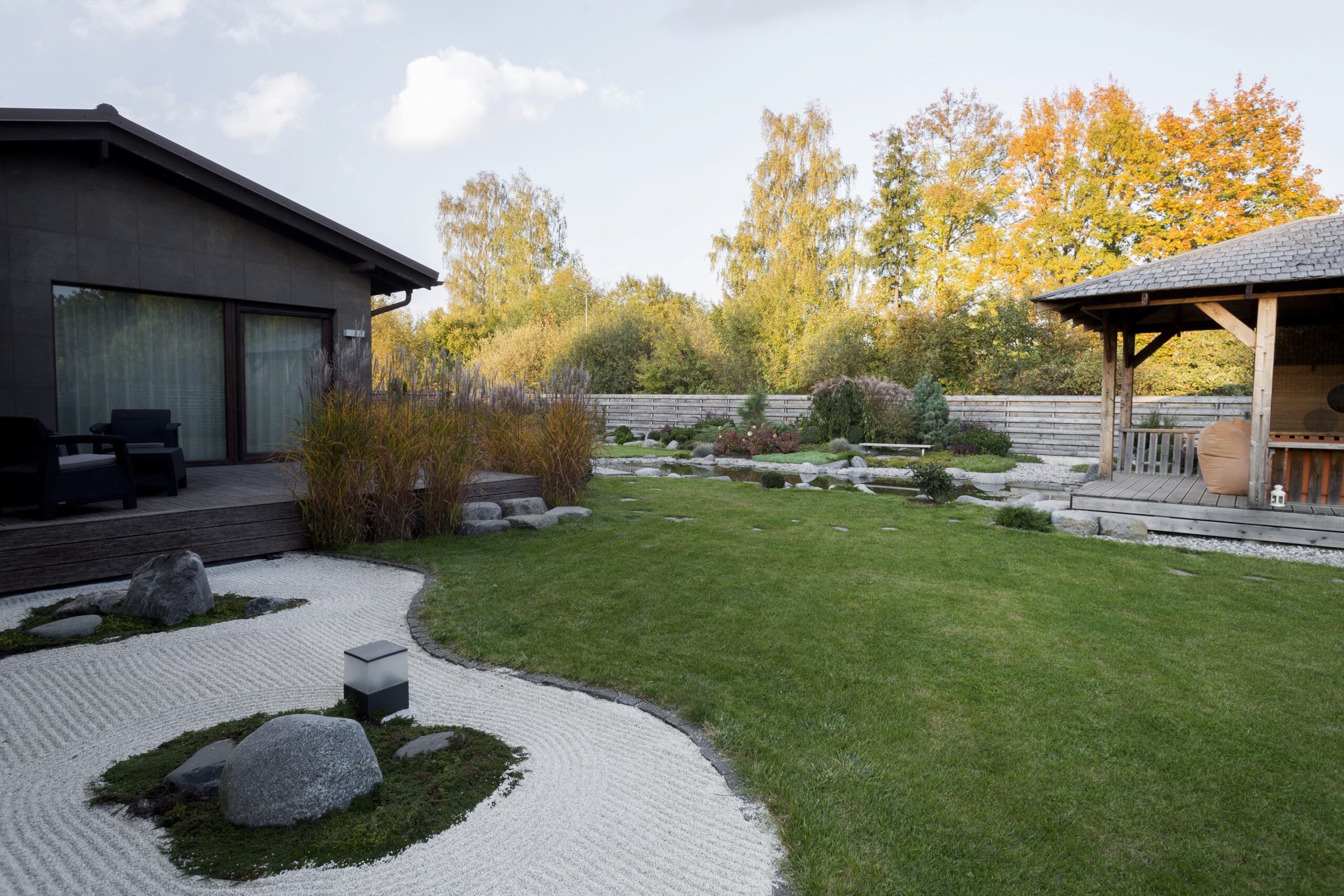 A plot on the city outskirts, stylized with Eastern motifs, balances the aesthetics of a Japanese garden with a modern architectural home. The main task was to create a distinctive, private yet open environment that would integrate vegetable-garden elements and play spaces for children.