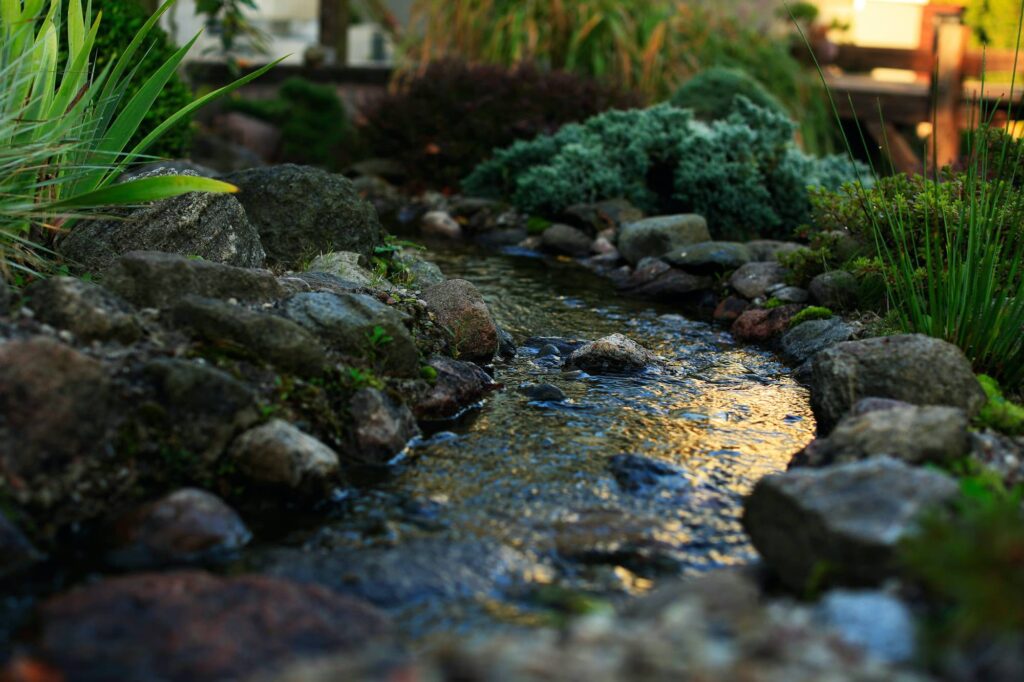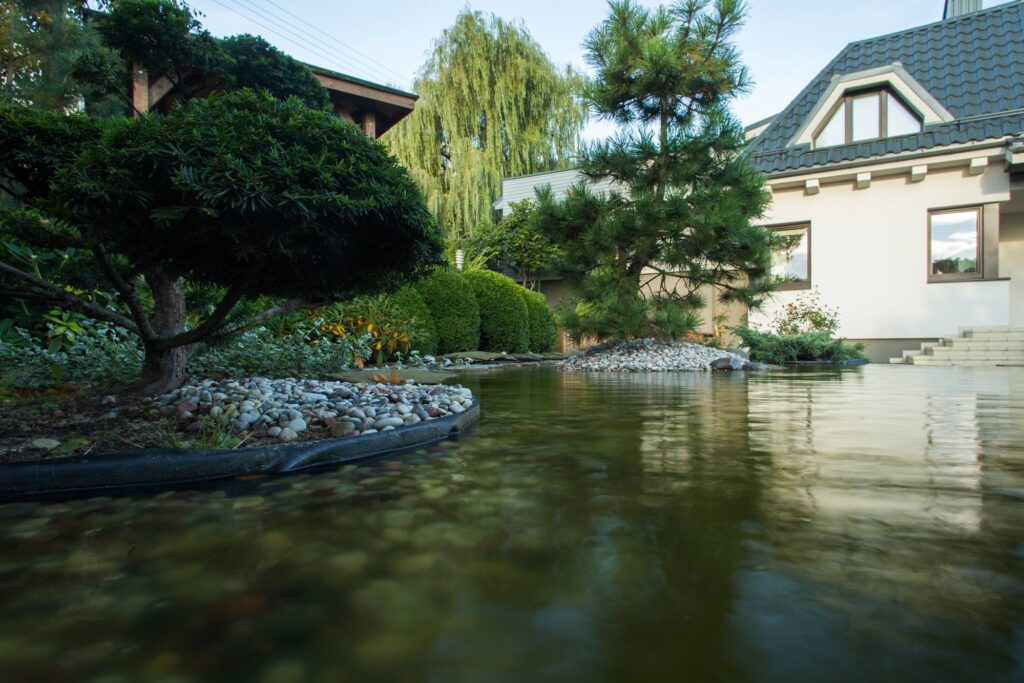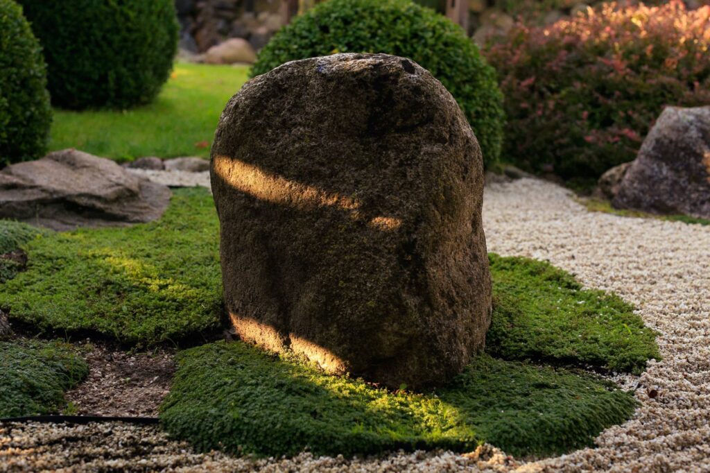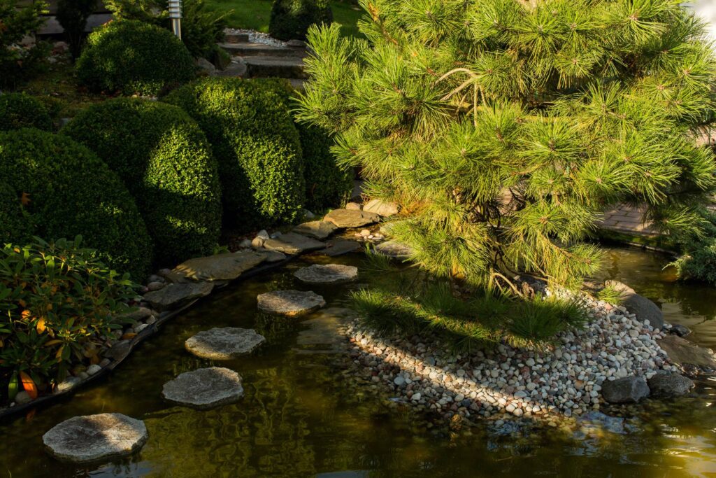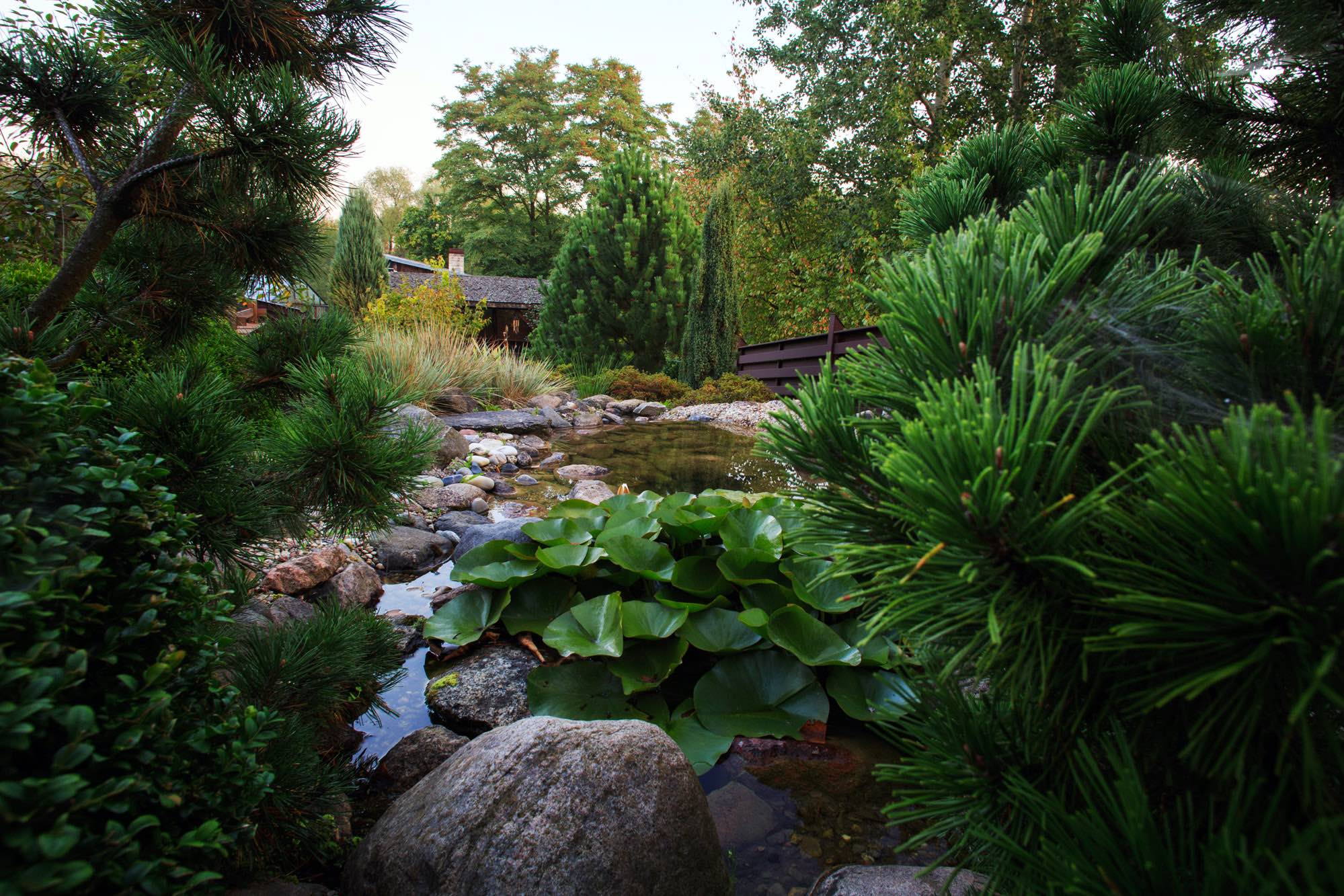 Stone compositions convey an Eastern spirit, while carefully selected plants—boxwood, junipers, barberries, yews, and black pines—create the garden’s harmony. The water springs and ponds not only deepen this impression but also visually expand the small yard. The sound of trickling water drowns out the city noise, allowing a sense of calm to settle in the garden.