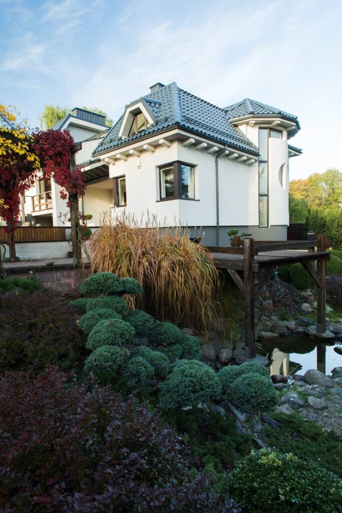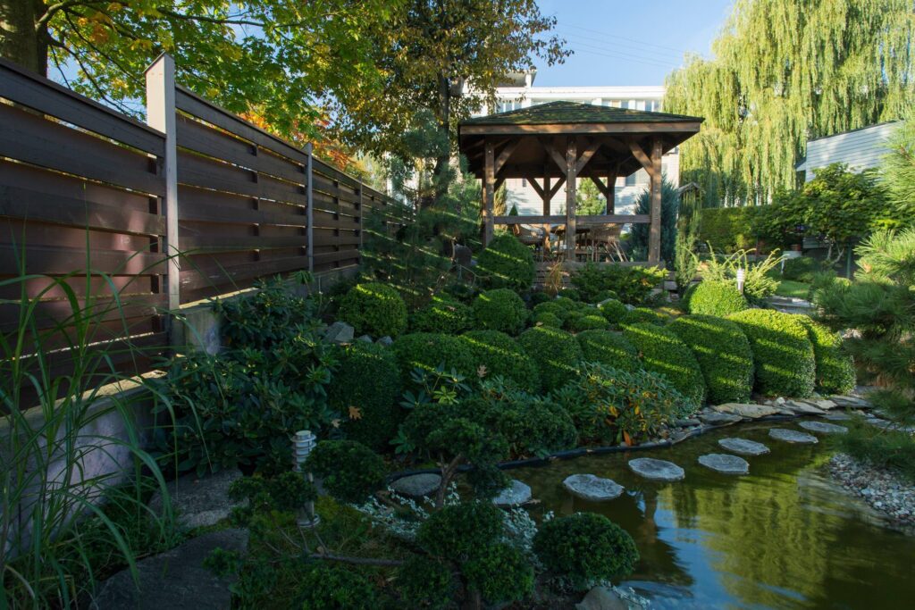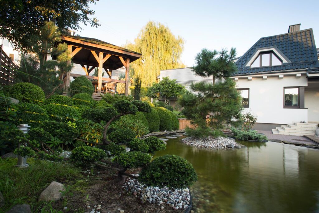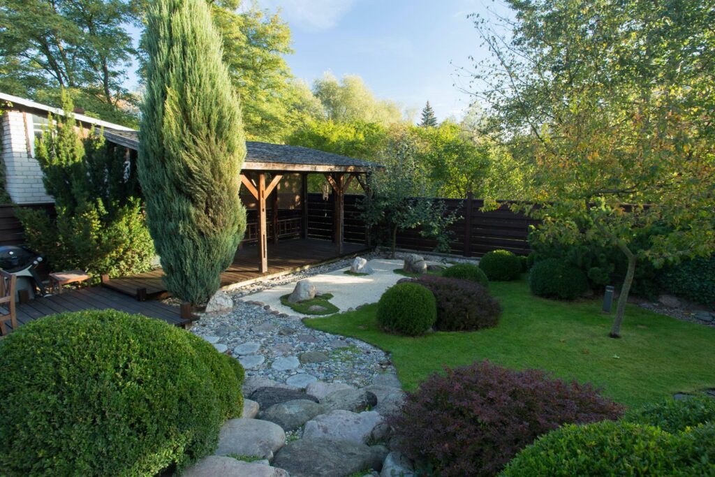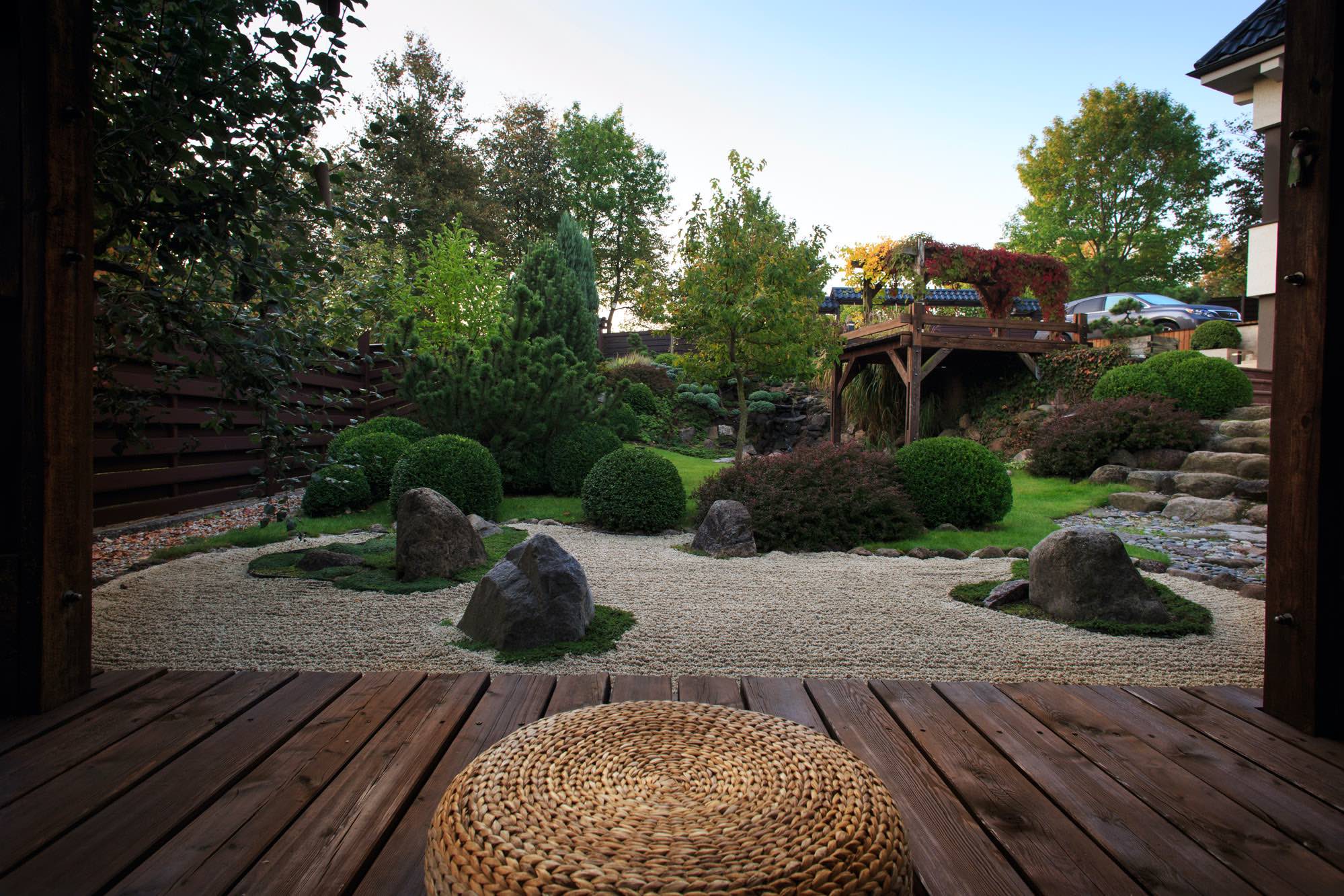 This project perfectly reflects our ability to create exceptional value even in small spaces. The client’s task was to evoke the atmosphere of a Japanese garden, adapting it to the architecture of the existing buildings and the site’s distinctive terrain. The area is 5 ares (about 500 m²), yet we managed to include everything needed to create the impression of a Japanese garden.