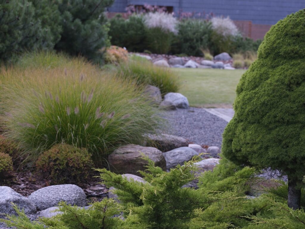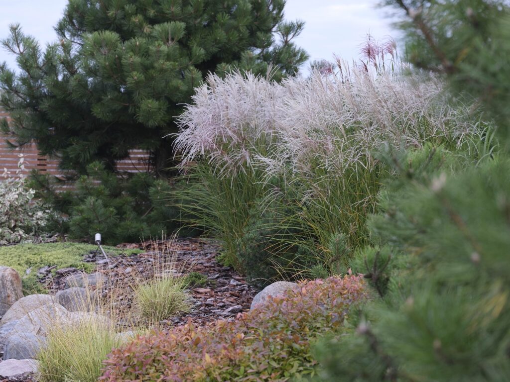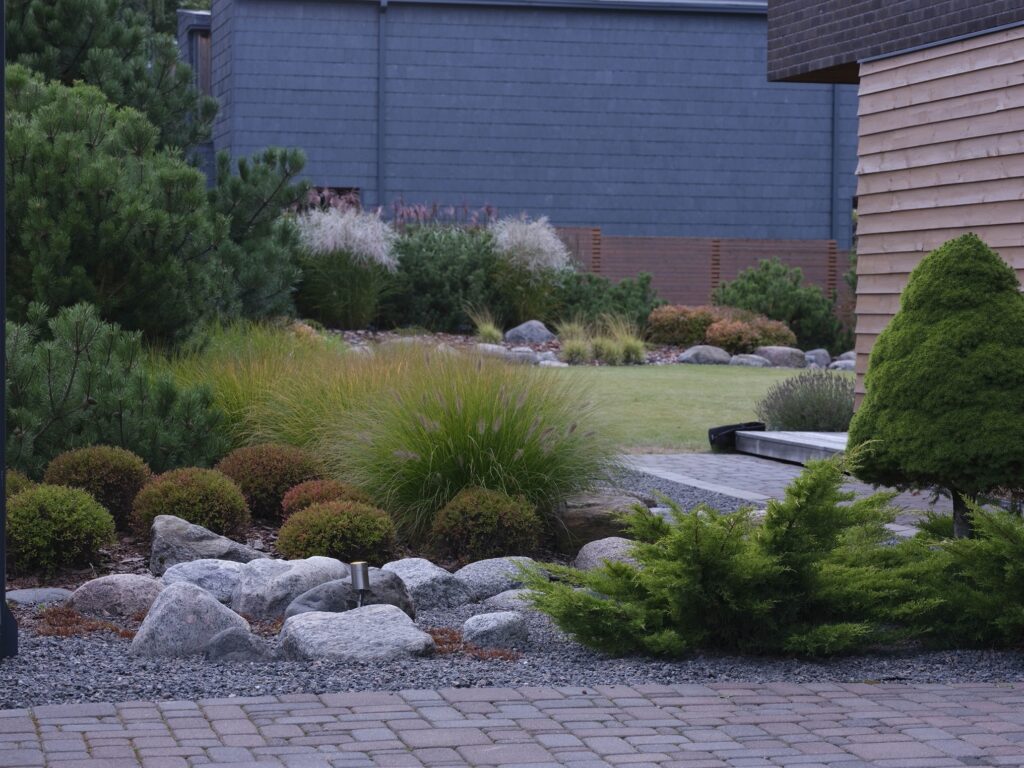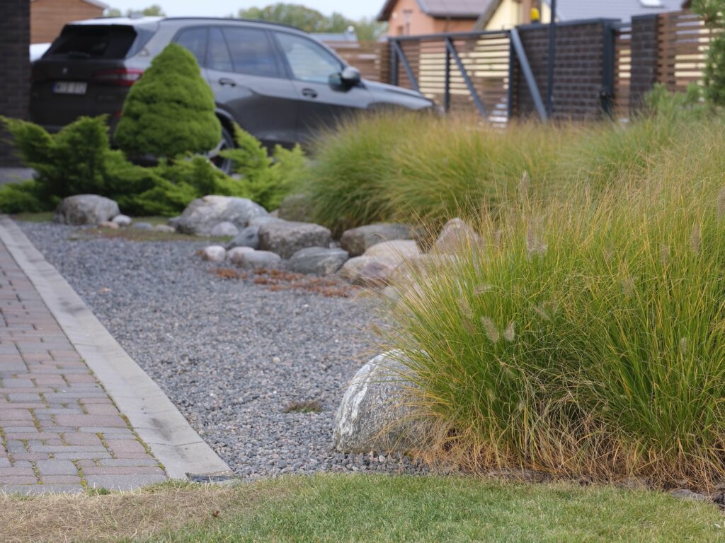 This landscape project was born from the need to find a balance between complex terrain and comfortable, safe outdoor use. The site’s elevation changes became not an obstacle, but an opportunity to create a clear structure that helped define spaces for children’s play and convenient movement around the plot. The key solution became a strip of stone “shoreline” that blends organically into the existing relief. The stones are arranged to evoke the impression of a natural bank. This structure is complemented by planting solutions that soften the stone mass, visually screen the fence, and help create a smooth transition into the adjacent pine forest. In the representative front area of the house, the designed stone compositions subtly emphasize the entrance space while also maintaining a simple, low-maintenance environment. The landscape is functional, natural, and aesthetic—exactly what the property owners wanted.