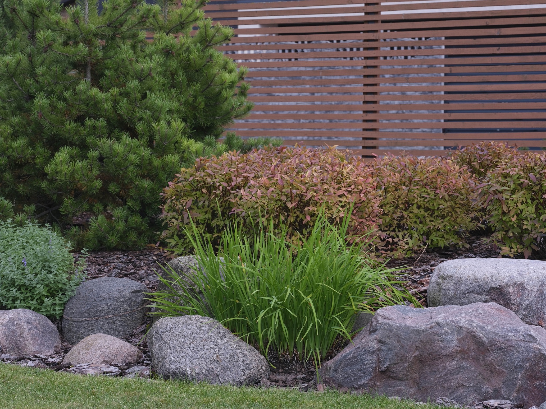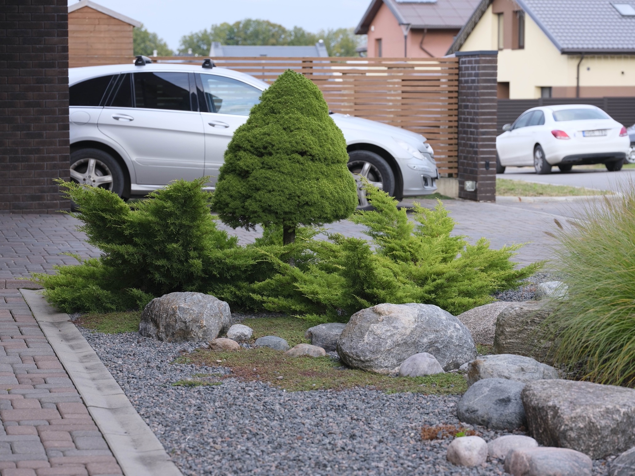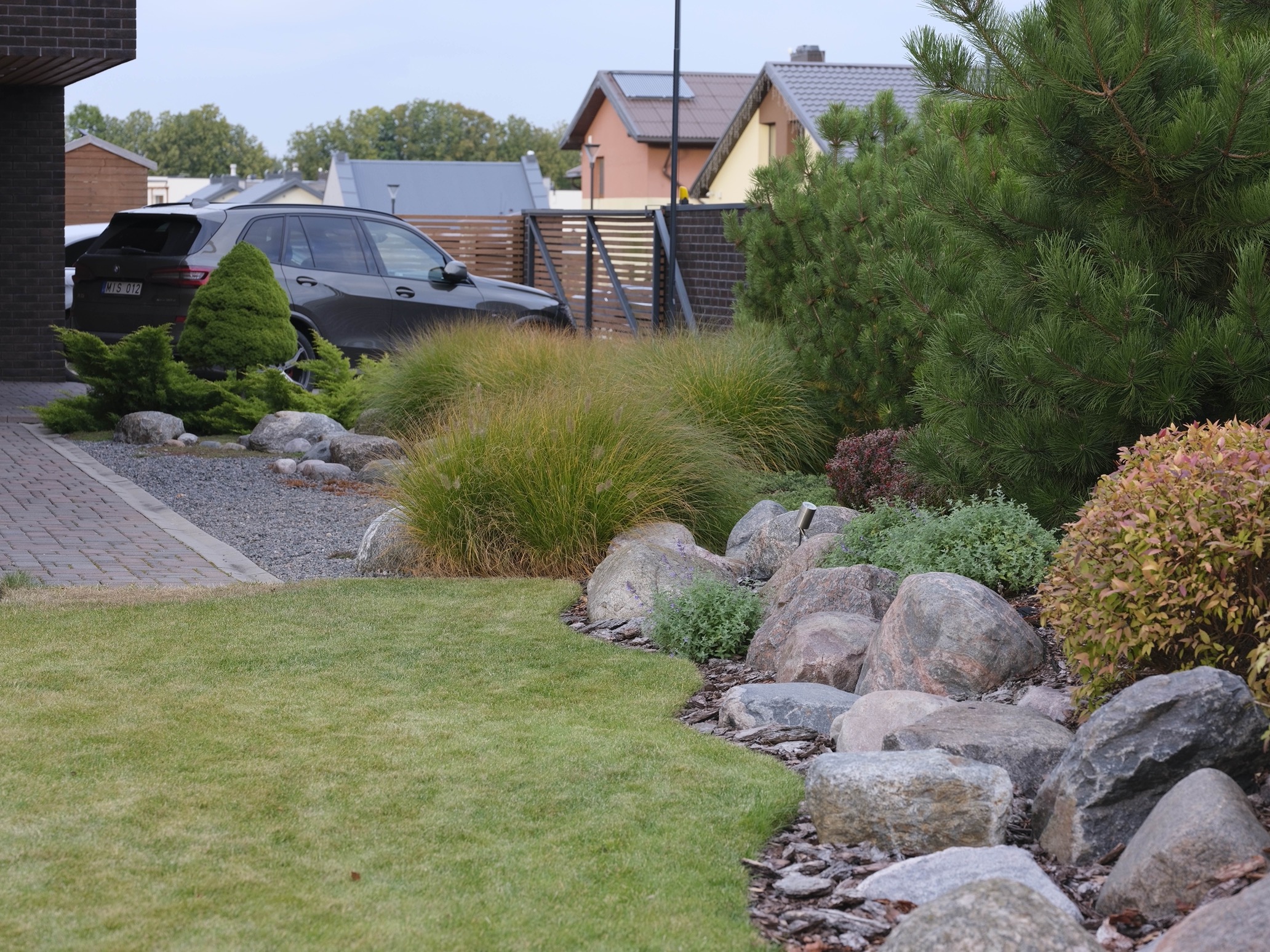 This landscape project was born from the need to find a balance between complex terrain and comfortable, safe outdoor use. The site’s elevation changes became not an obstacle, but an opportunity to create a clear structure that helped define spaces for children’s play and convenient movement around the plot. The key solution became a strip of stone “shoreline” that blends organically into the existing relief. The stones are arranged to evoke the impression of a natural bank. This structure is complemented by planting solutions that soften the stone mass, visually screen the fence, and help create a smooth transition into the adjacent pine forest. In the representative front area of the house, the designed stone compositions subtly emphasize the entrance space while also maintaining a simple, low-maintenance environment. The landscape is functional, natural, and aesthetic—exactly what the property owners wanted.