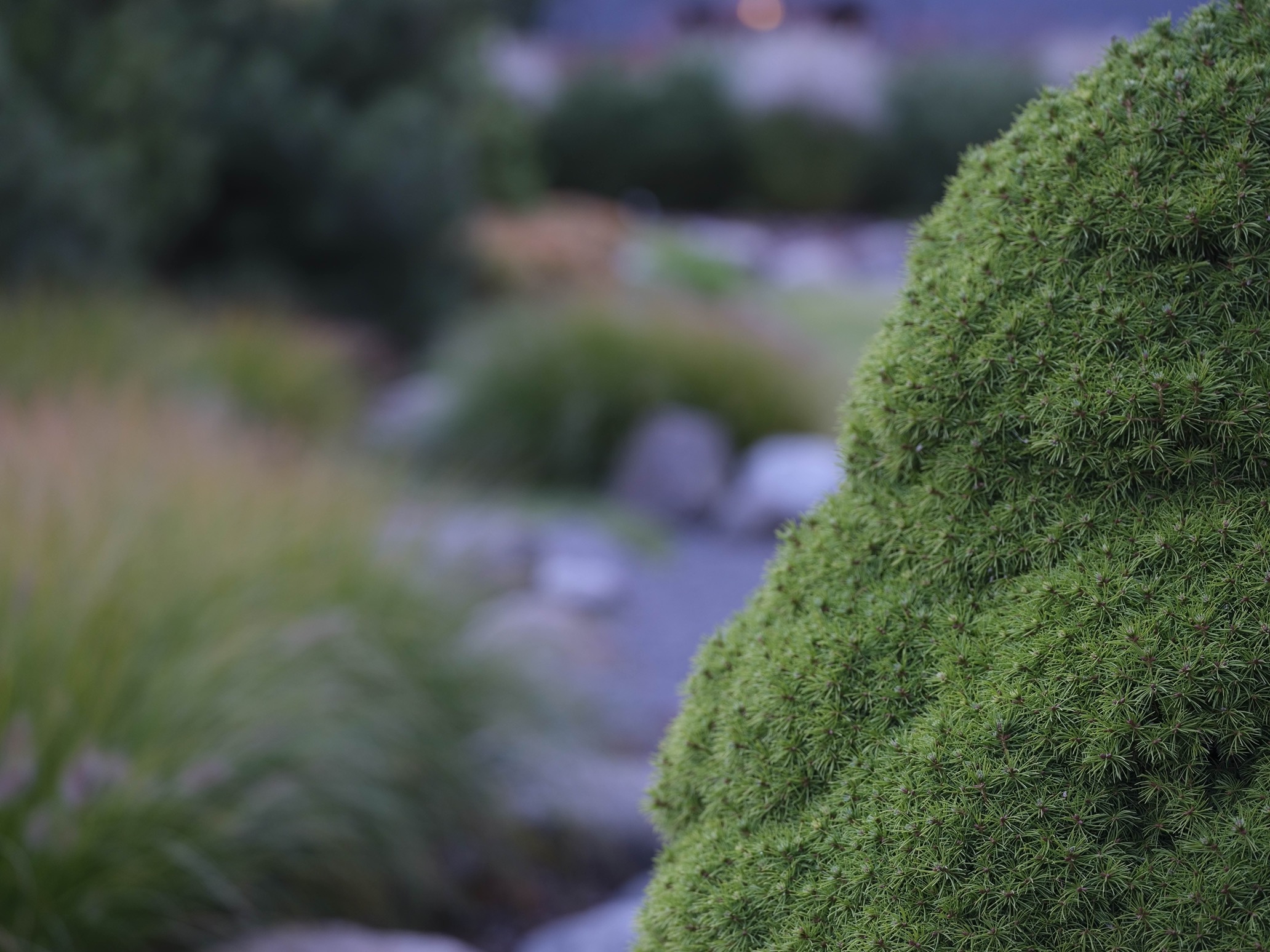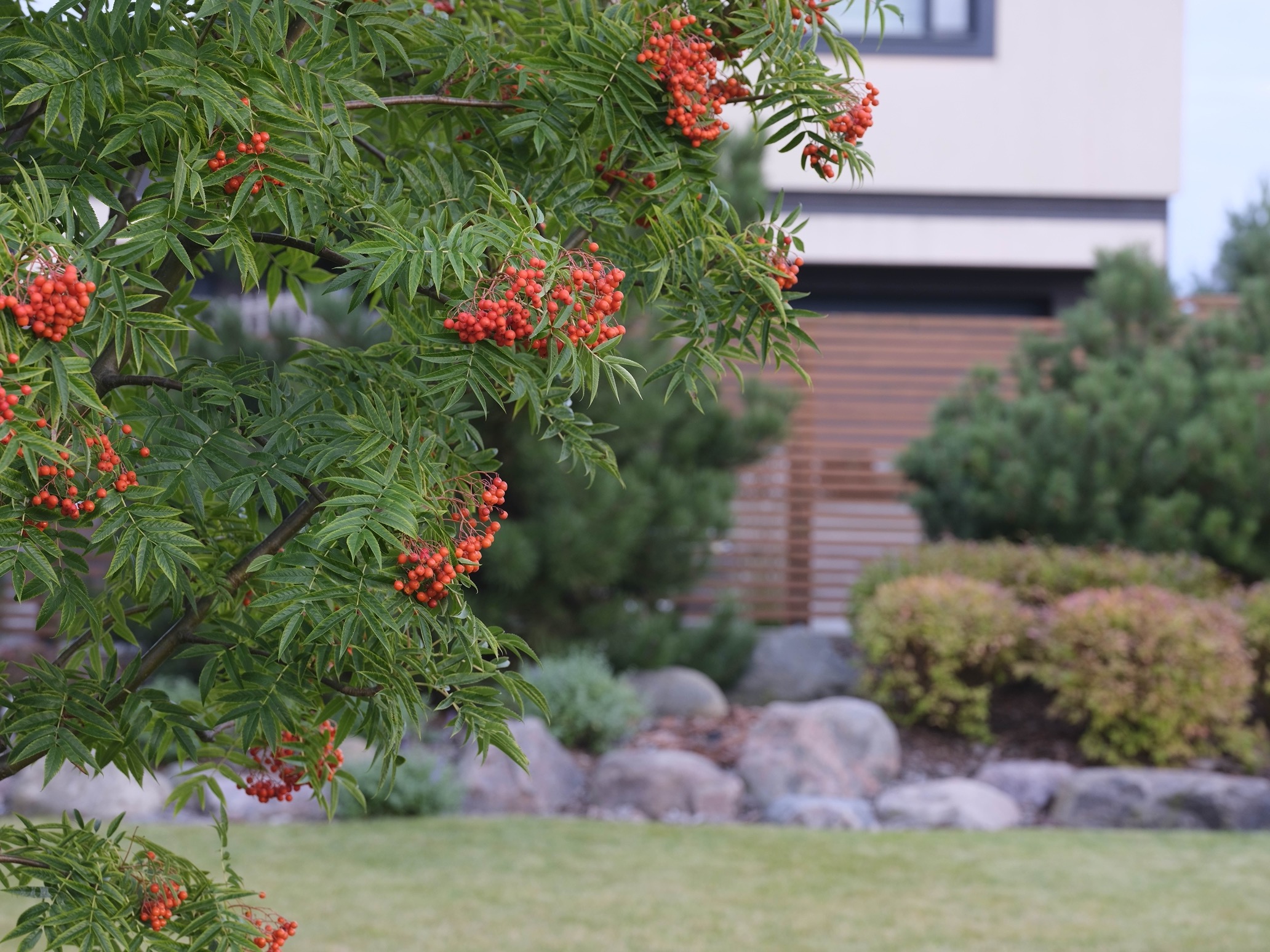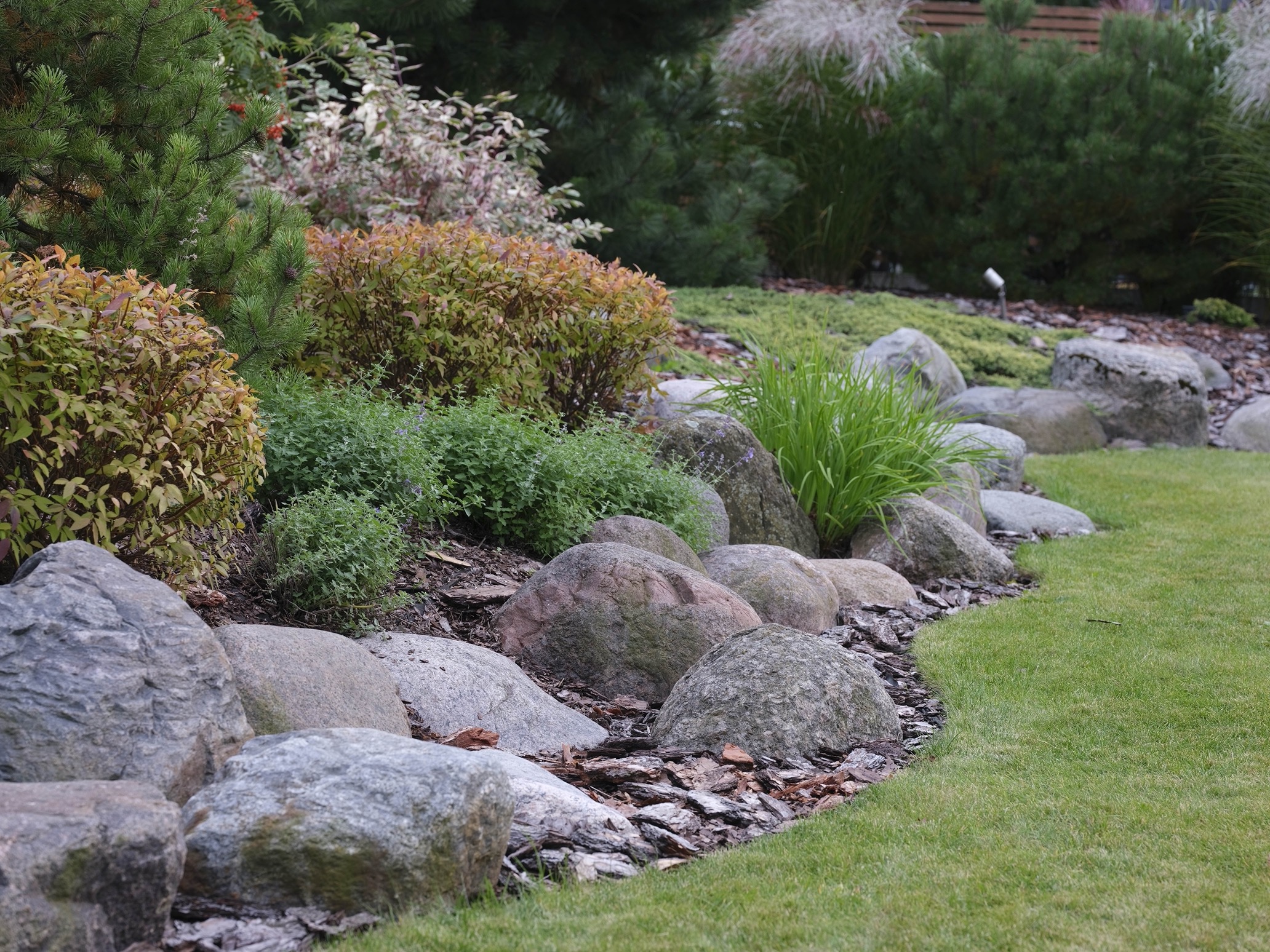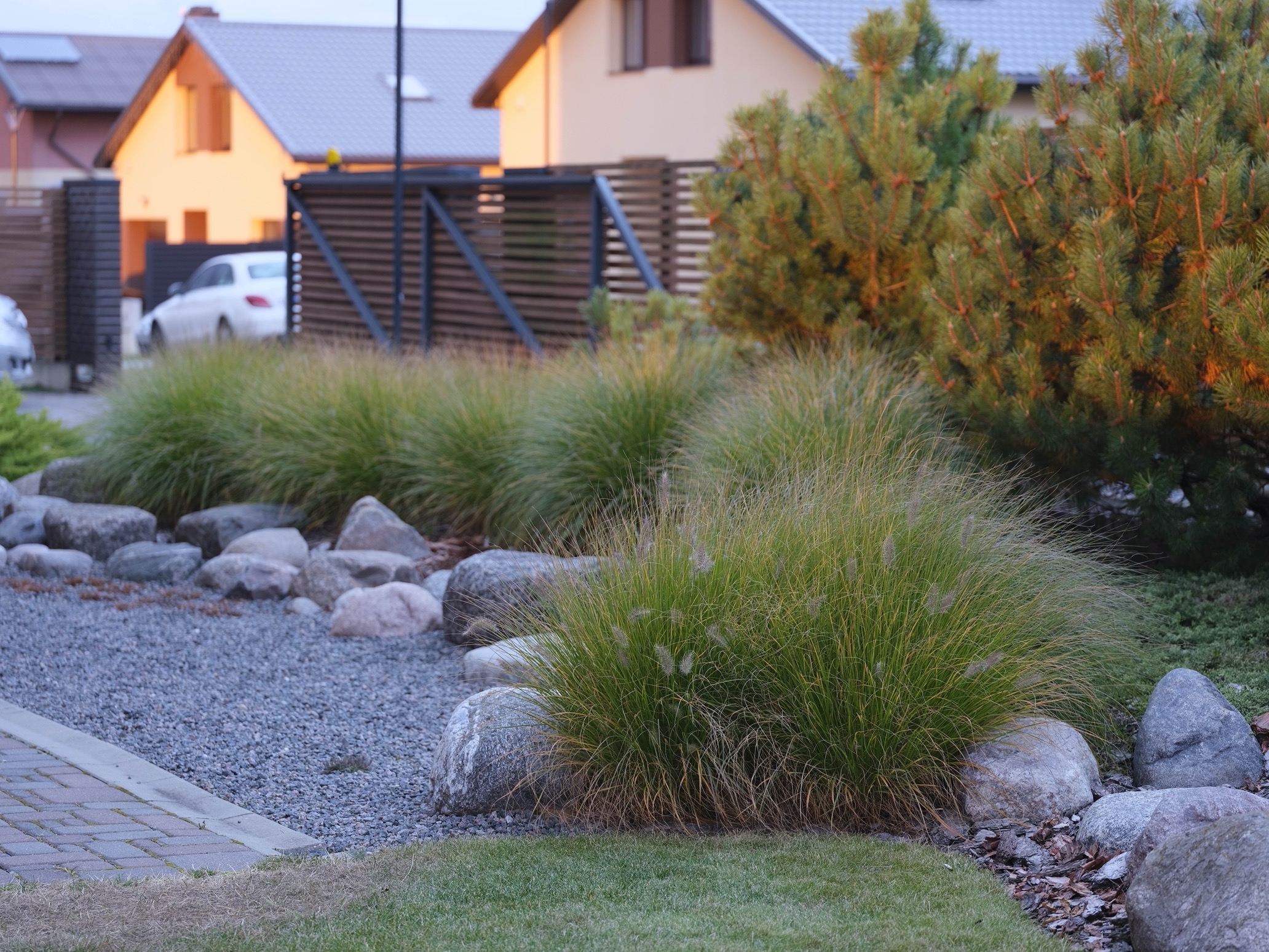 This landscape project was born from the need to find a balance between complex terrain and comfortable, safe outdoor use. The site’s elevation changes became not an obstacle, but an opportunity to create a clear structure that helped define spaces for children’s play and convenient movement around the plot. The key solution became a strip of stone “shoreline” that blends organically into the existing relief. The stones are arranged to evoke the impression of a natural bank. This structure is complemented by planting solutions that soften the stone mass, visually screen the fence, and help create a smooth transition into the adjacent pine forest. In the representative front area of the house, the designed stone compositions subtly emphasize the entrance space while also maintaining a simple, low-maintenance environment. The landscape is functional, natural, and aesthetic—exactly what the property owners wanted.