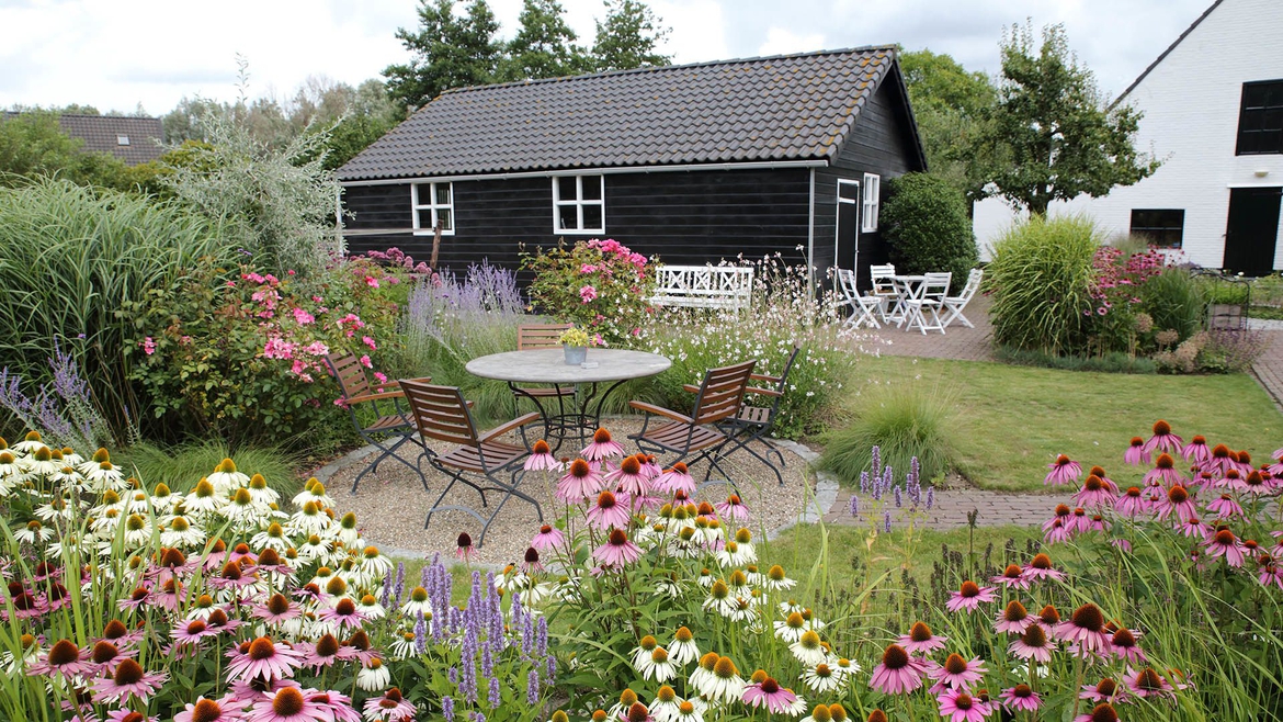 Planting is generous, but intentional. The composition is shaped through fragrance, texture, and a soft harmony of colors. Formal elements — such as stone walls or straighter lines — transition naturally into looser planting. The space feels light and sun-filled, yet clearly organized.
