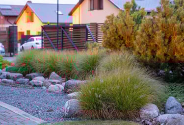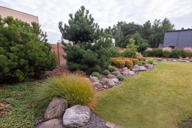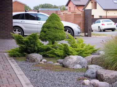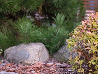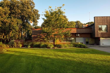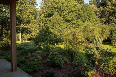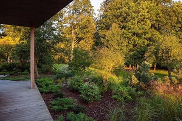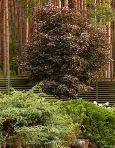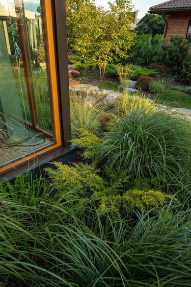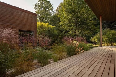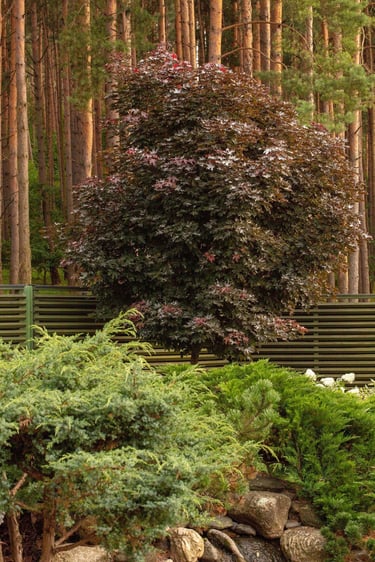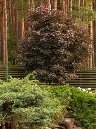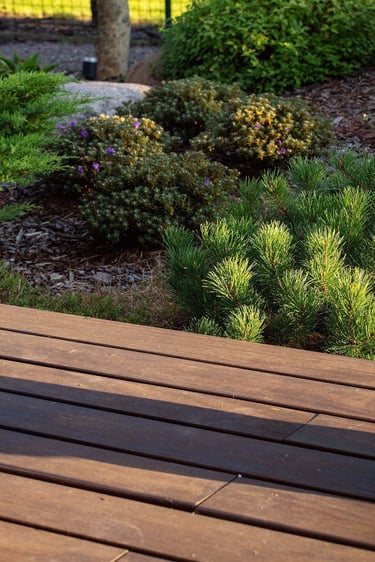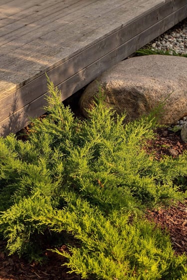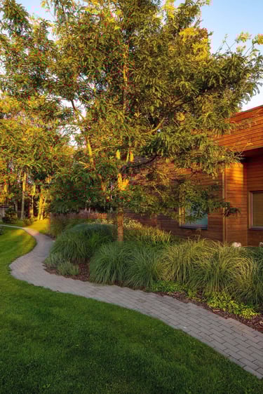 Suprojektuoti juodųjų pušų ir kanadinių cūgų su margalapėmis sedulomis želdynai ne tik užtikrina privatumą nuo gatvės, bet ir sukuria jaukumą. Šis atskyrimas leido šeimai ramiau naudotis tiek ugniavietės zona, tiek sklype esančiomis vejos erdvėmis. Prie vakarinio apšvietimo terasa, esanti pušyno apsuptyje, tiesiog kvieste kviečia leisti laiką.