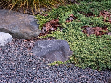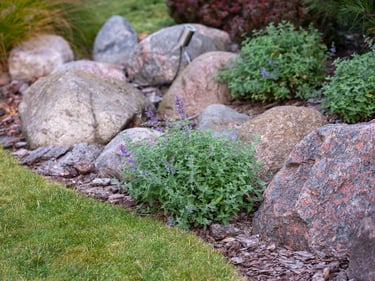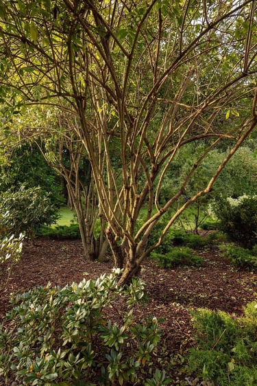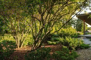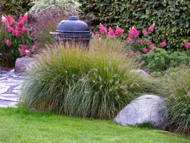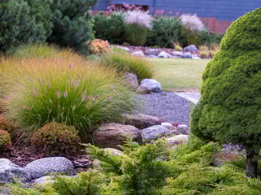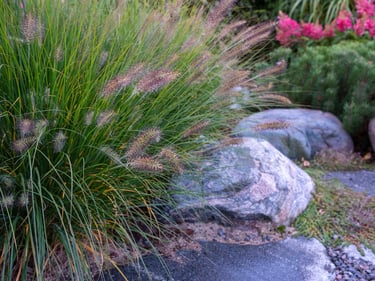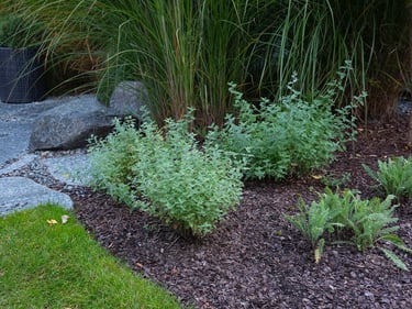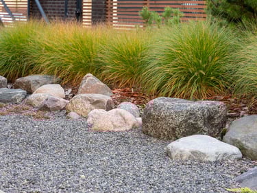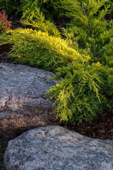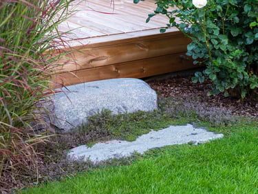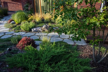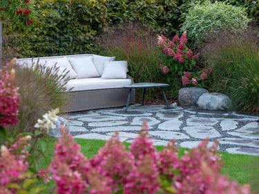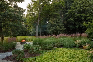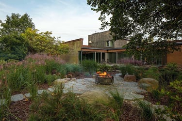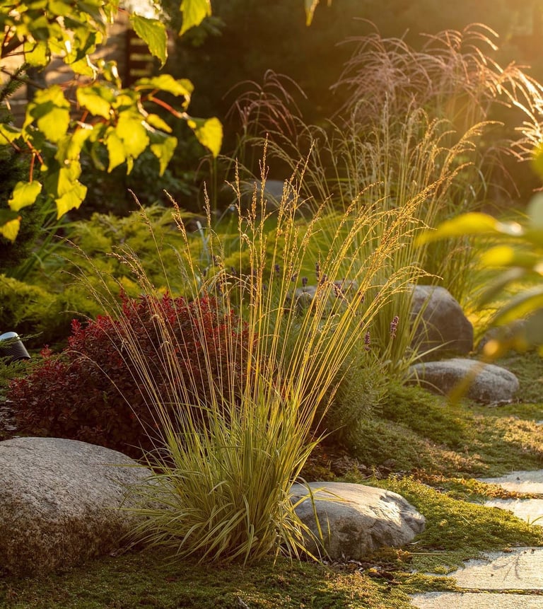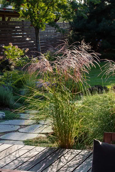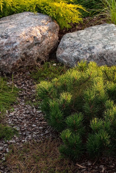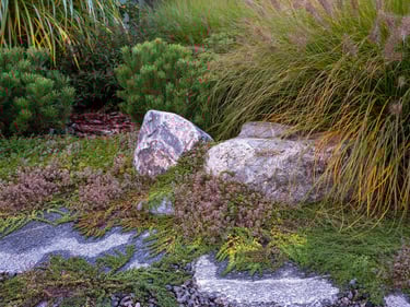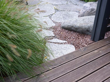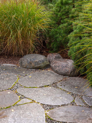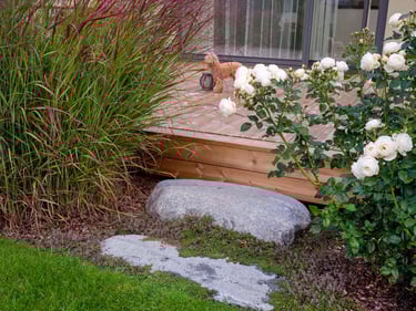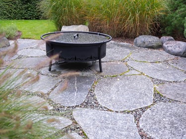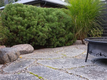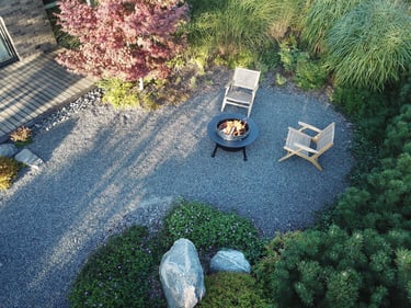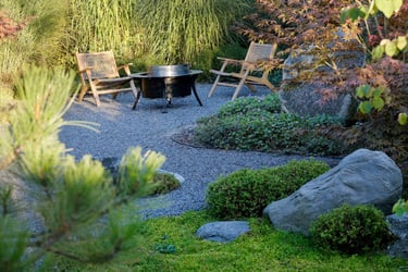 Visai šalia, tarp rododendrų, miskantų ir natūralių akmenų, įrengta ugniavietės zona – nuo terasos atskirtas gamtos kambarys, kuriame šilta net vėlyvą rudenį. Šioje vietoje dera ir funkcija, ir estetika – dideli akmenys tarnauja kaip sėdimos vietos bei kontrastuoja su švelniais augalų siluetais.