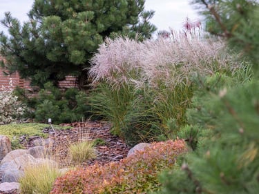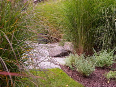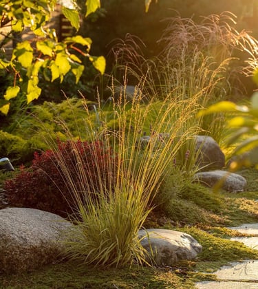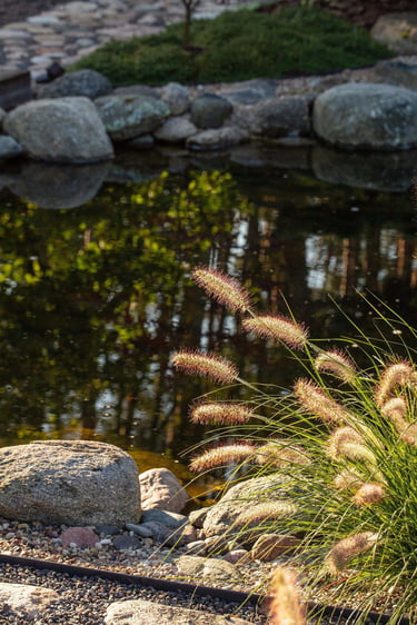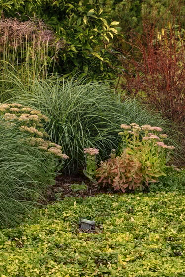 Rudenėjant visas kraštovaizdis pradeda keisti spalvas, todėl jis yra dinaminis ir įdomus. Aukšti viksviniai augalai linguodami vėjyje papildo erdvę plastišku judesiu. Kontrastingai jiems - išraiškingi ir tiksliai sustatyti akmenys suteikia natūralumo, solidumo ir stabilumo.