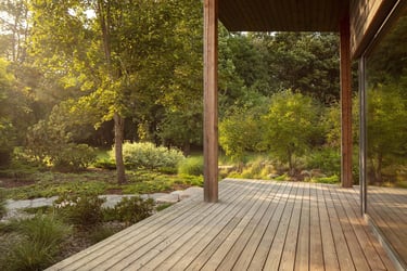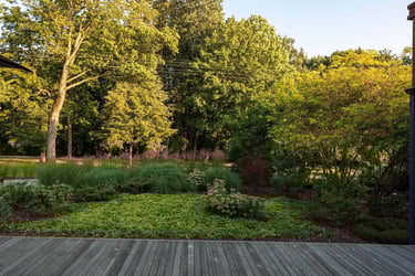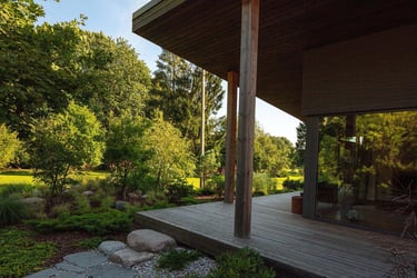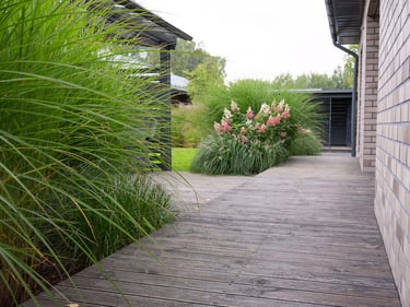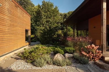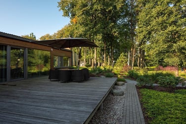 Prie pagrindinio namo suformuota terasa su plačiu žolinės augmenijos fonu, subtiliai minkštinančiu modernią architektūrą. Pietinėje pusėje, šalia virtuvės langų, išliko elegantiškai išgenėta gledičija, o už jos – ramus hortenzijų takas, vizualiai kviečiantis į sodybos centrą. Šiaurinėje dalyje sukurta uždara, tačiau šviesi terasa – jaukaus prieglobsčio sala, į kurią skleidžiasi šviesos apgaubtas miško kraštas.