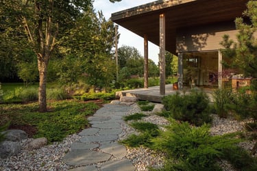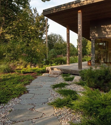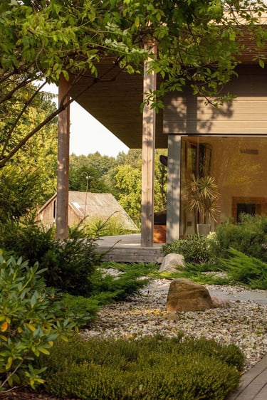 Rytietiškais motyvais stilizuotas projektas miesto pakraštyje subalansuoja subtilią japoniško sodo estetiką su modernios architektūros namu. Gauta užduotis - sukurti nuotaikingą, išskirtinę, privačią, bet atvirą aplinką, kurioje būtų integruoti daržo elementai ir vaikams skirtos žaidimo erdvės.