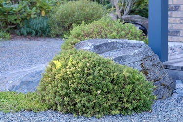 Kieme įrengtas akmenų sodas, matomas tiek iš terasos, tiek per miegamojo langą, papildo bendrą kraštovaizdžio kompoziciją. Visa teritorija yra gausiai pripildyta natūralių elementų: akmens pakopos, tamsios skaldos takelis bei vandens versmė iš didelio akmens.