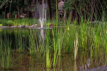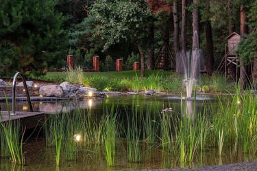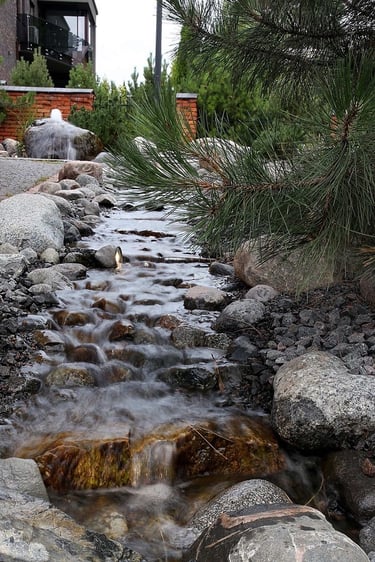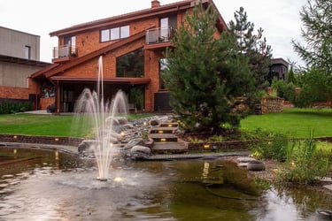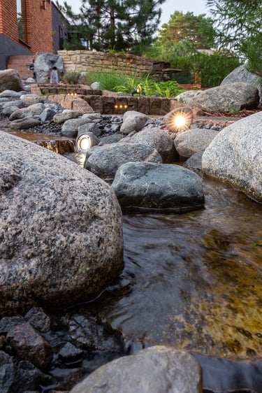 Kompleksiškas sklypo projekto dizainas praplėtė ir vandens telkinį su versme, kuris dabar jungia medinę terasą su ugniaviete į vieną harmoningą aplinką. Akmeniniai takeliai kuria žaismingą nuotaiką, bei suteikia patogumo lauko želdinių priežiūrai ir naudojimui. Didelis šuns voljeras organiškai įsilieja ir beveik pasislepia bendrame kraštovaizdžio projekte. Centrine horizonto ašimi tapo klevas paprastasis, kuris papildo vandens telkinį ir suteikia naują spalvinę kryptį.