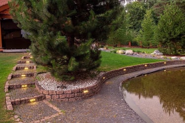 Vakarėjant atsiskleidžia subtilus apšvietimas: medžių lajos tampa vakaro architektūra, šviesos akcentai išryškina šeivamedžių, magnolijos ir raudonlapio buko formą. Taip erdvė tampa gyva visą parą – ne tik dieną, bet ir tamsoje.