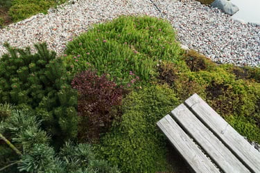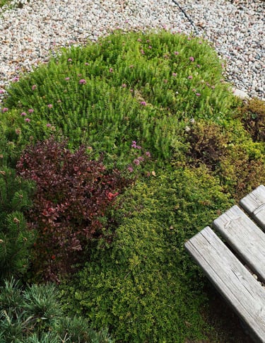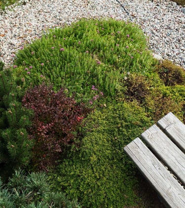 Skaldos ir samanų sodas praturtintas šešėlį mėgstančiais augalais, todėl vidinėse erdvėse yra gausu šviesos ir gyvybės. Sodas džiugina savo žalumu ištisus metus.