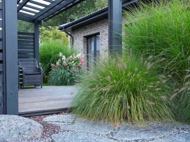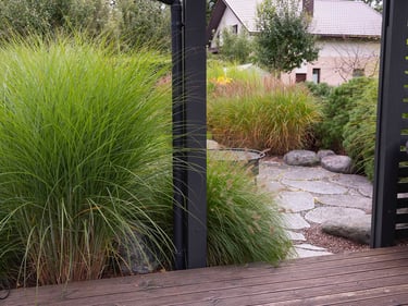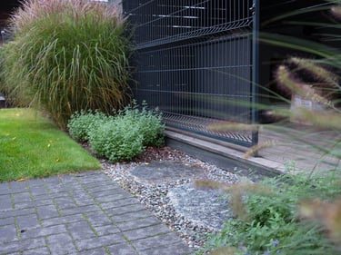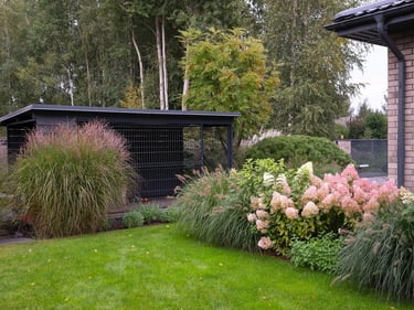 Fasadinėje namo dalyje esantis šuns voljeras subtiliai pasislepia pušų, aukštų žolinių augalų ir šermukšnių apsuptyje ir puikiai įsilieja į bendrą kiemo estetiką. Miskantų kupstai aplink ugniavietę kuria saugumo ir uždaro kiemo įspūdį, o šluotelinių hortenzijų žiedai džiugina ir puošia terasos prieigas visą vasarą ir rudenį.